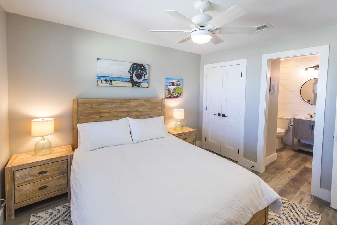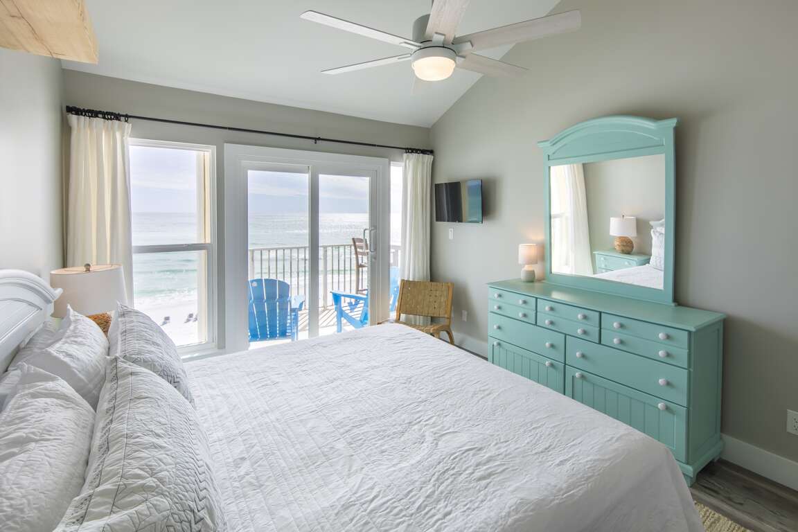 Past the whimsical coral barn door is the primary bedroom suite. Tranquil white and aqua furnishings complement the ocean scene outside the patio doors. A second balcony with turquoise beach chairs is the perfect lounging area. But beware... you might end up nodding off in the middle of paradise.
