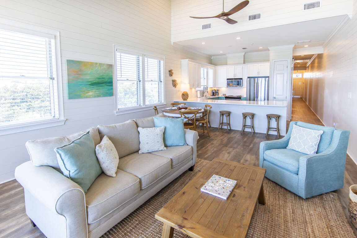 • Fully equipped kitchen and open-concept living area with panoramic Gulf views