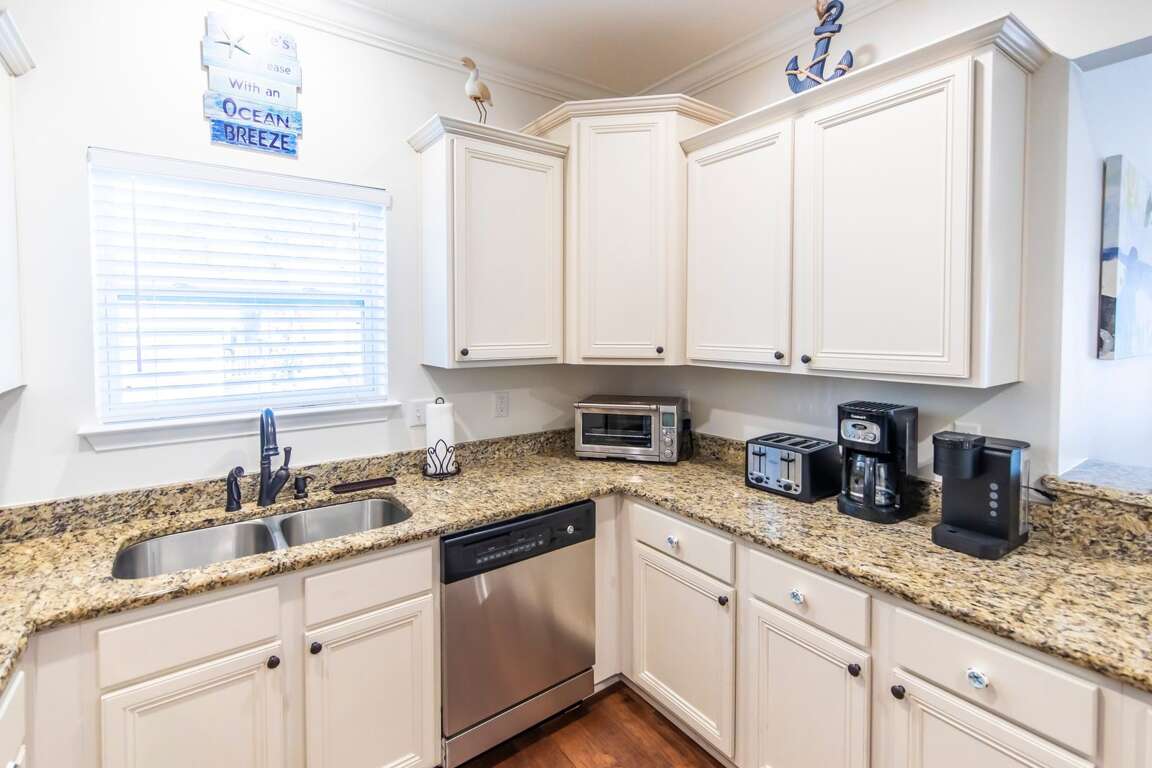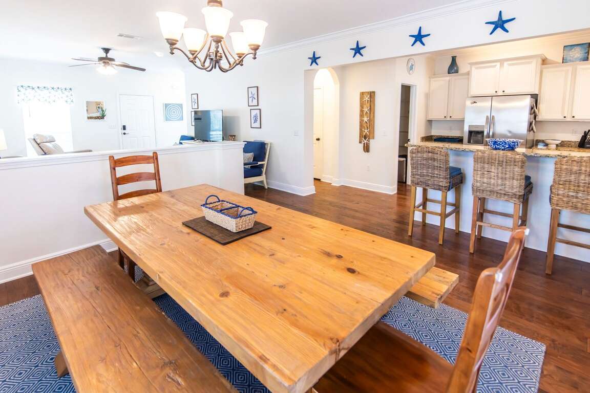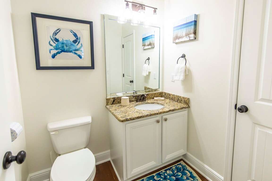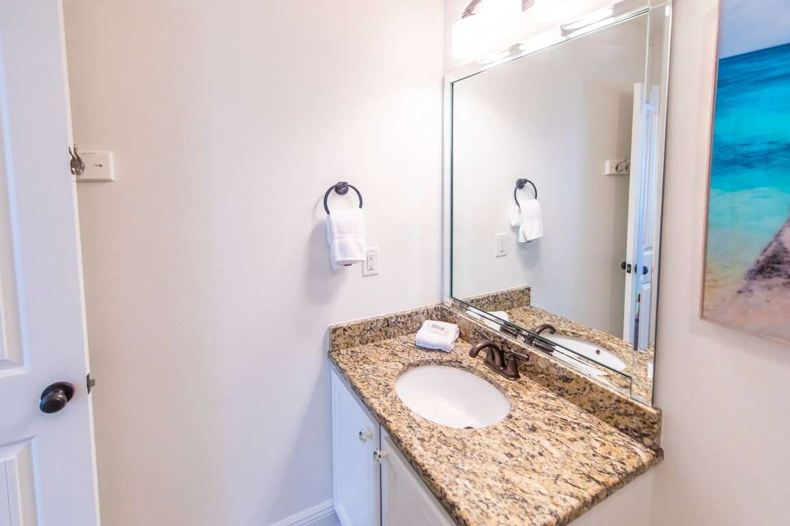 Upstairs, all three bedrooms provide comfort and style, including two king bedrooms adorned with calming coastal décor and a third bedroom with a bunk + twin, accented with playful cobalt blue touches. Two full bathrooms with granite finishes ensure everyone has space to unwind. Step out onto the large private balcony to enjoy your morning coffee or an afternoon breeze drifting in from the Gulf.