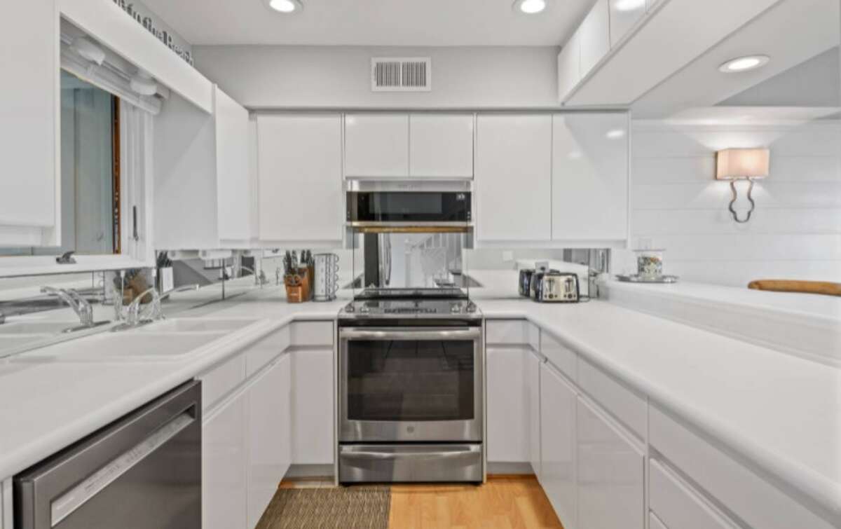 The unit is completely remodeled with a fireplace, hardwood flooring throughout; all stainless appliances, plus washer/dryer, and a Weber charcoal grill are there for your enjoyment. A new compact refrigerator and wine cooler are located in the LR, adjacent to the patio. The kitchen features a two-oven, convection range.