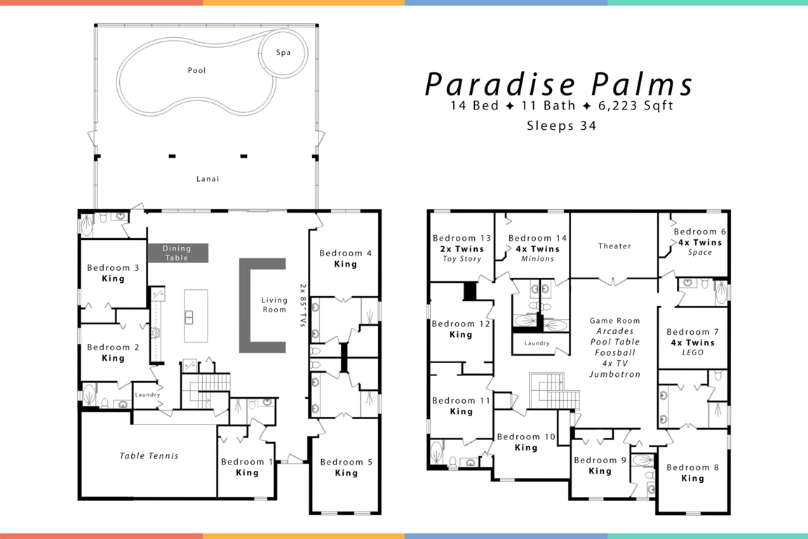 | How Many Bedrooms? | 14 Bedrooms • Sleeps 34 |