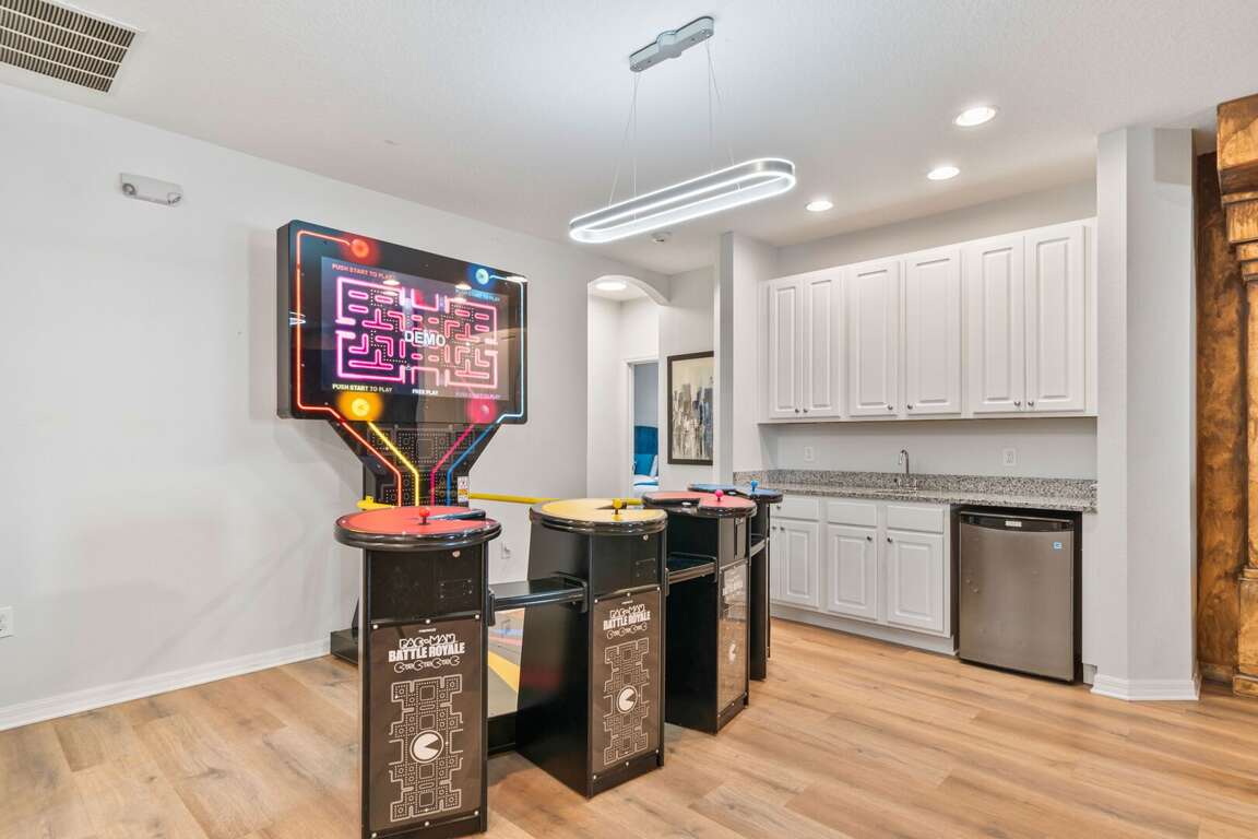 Entertainment abounds within the home, boasting a fully equipped game room featuring PacMan Battle Royale, a pool table, and more. The Indiana Jones-inspired theater room offers a cinematic experience and is sure to be a hit. Themed bedrooms, including an enormous enchanted castle bedroom, a Minions-inspired bedroom, and the campout bedroom, provide immersive experiences for guests of all ages.<br />
