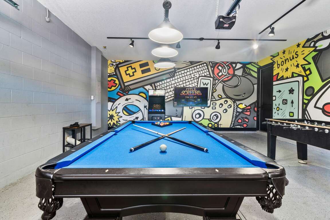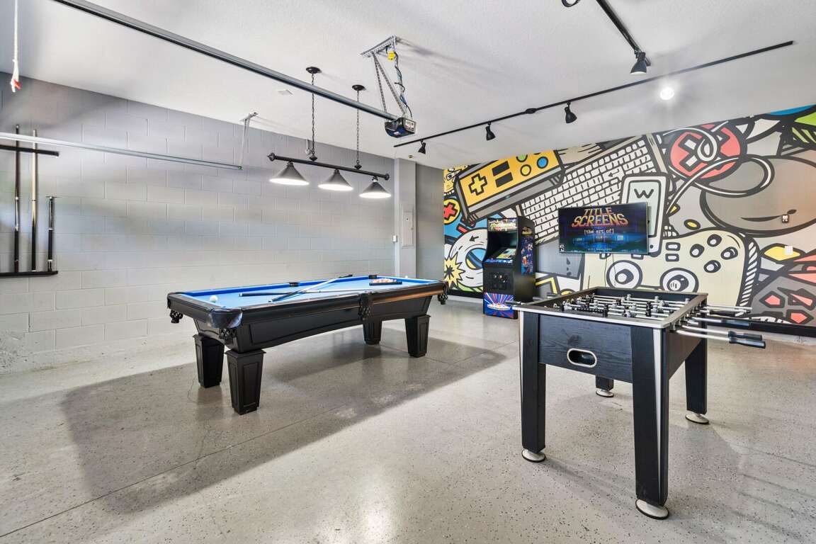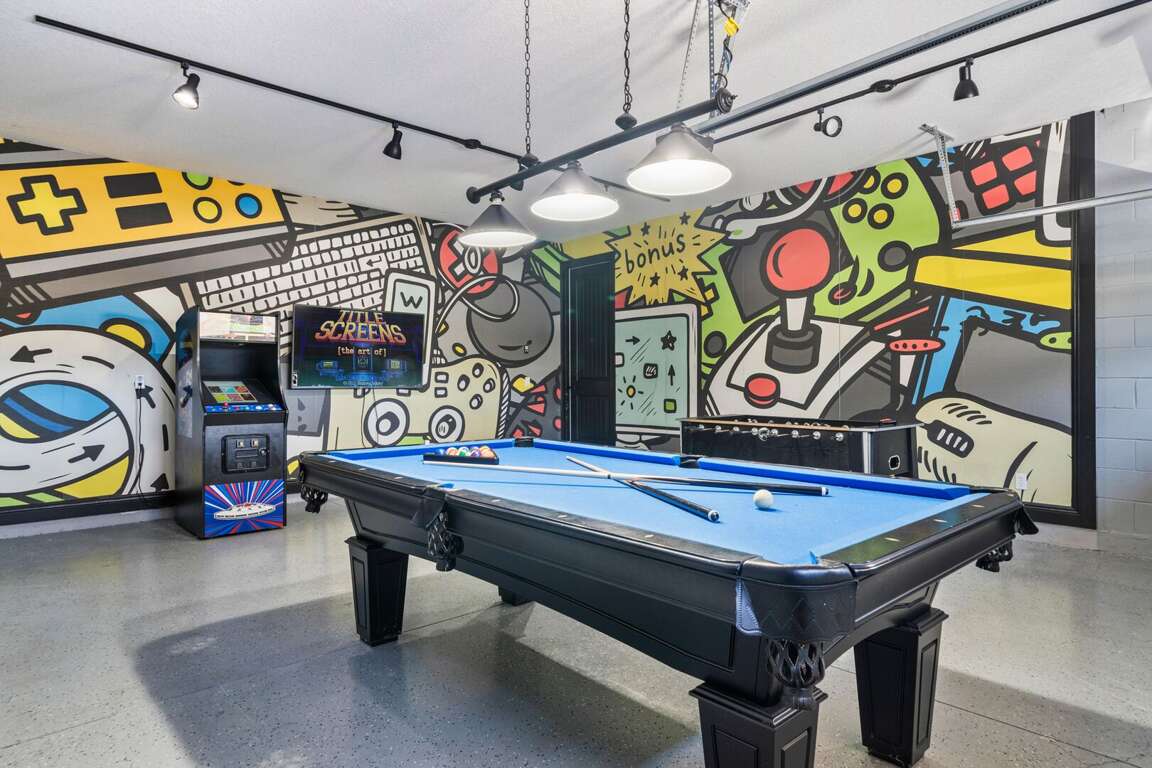 For entertainment, the game room is equipped with a pool table, foosball, and a classic arcade, ensuring fun for guests of all ages.<br />