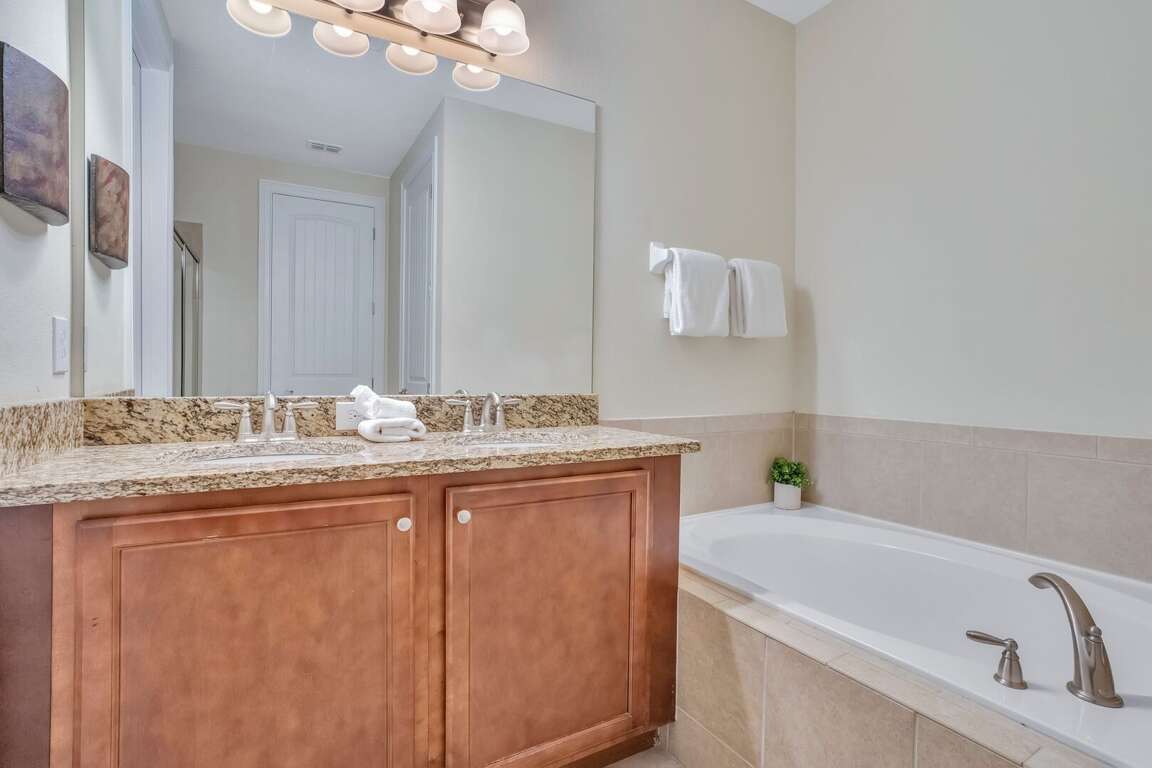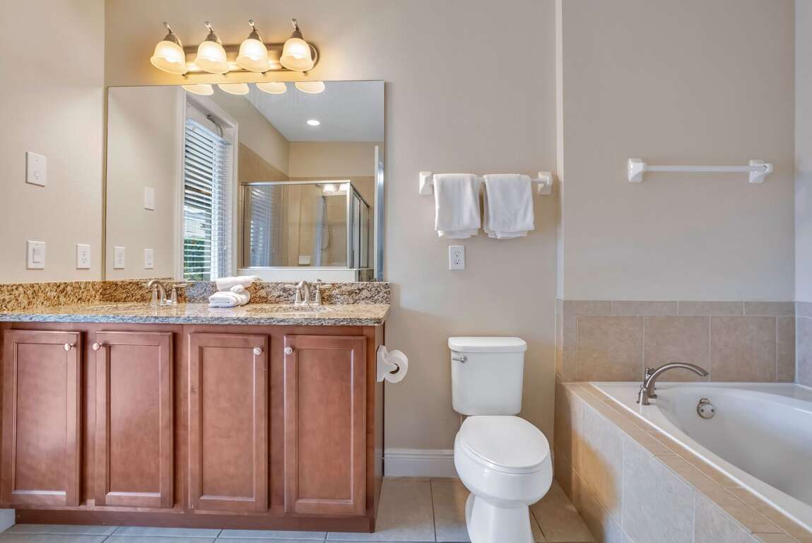 Bathroom 1 – 1st floor in Bedroom 1, dual sinks, glass enclosed shower, soaker tub<br />