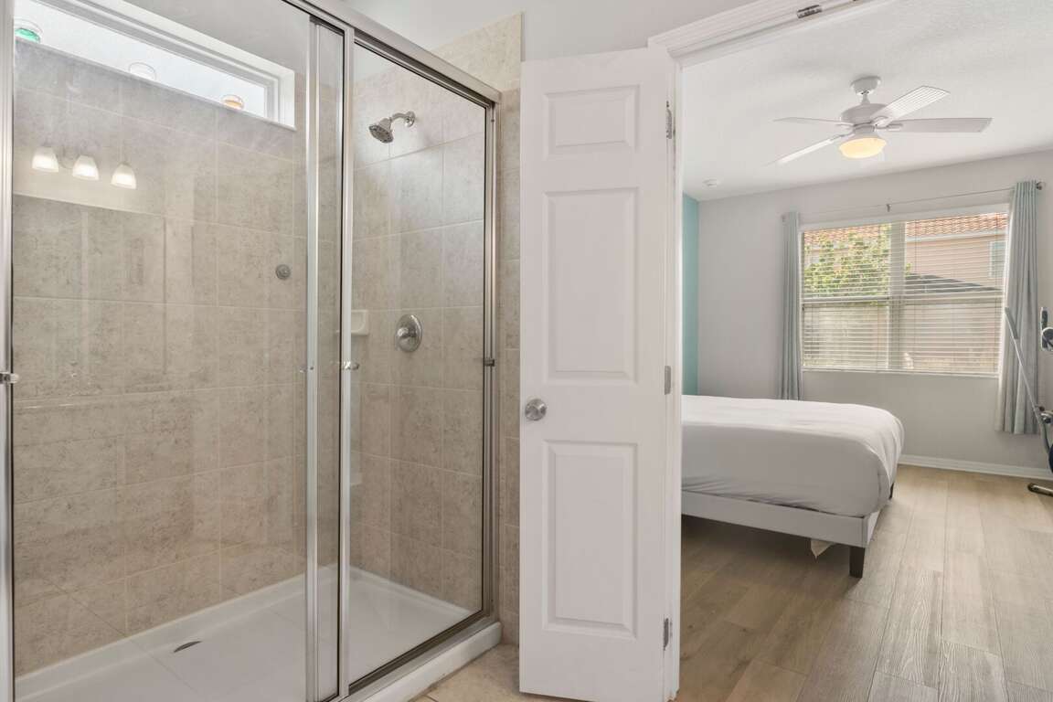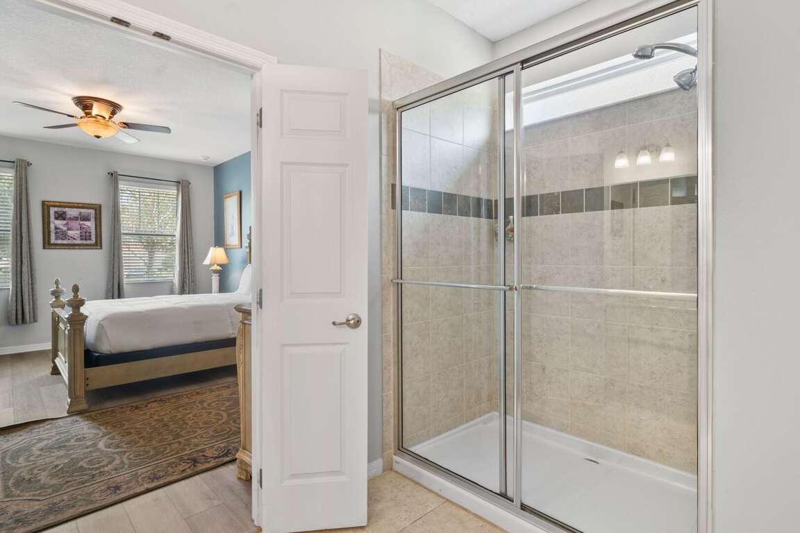 Bathroom 1 – 1st floor in Bedroom 1, dual sinks, glass enclosed shower, walk in closet