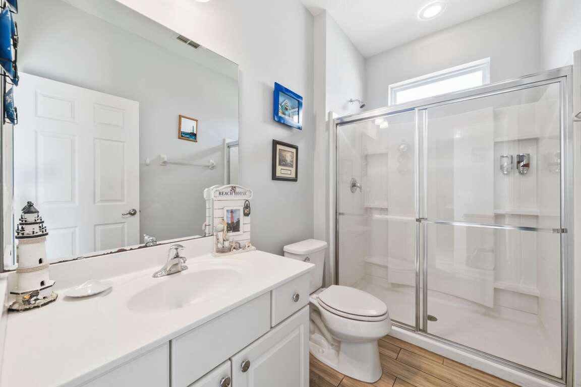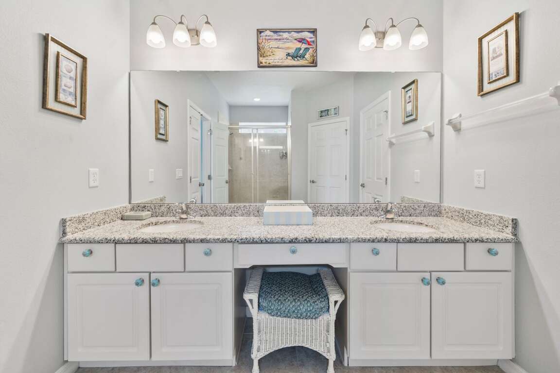 Bathroom 2 – 1st floor in Bedroom 2, dual sinks, glass enclosed shower, walk in closet