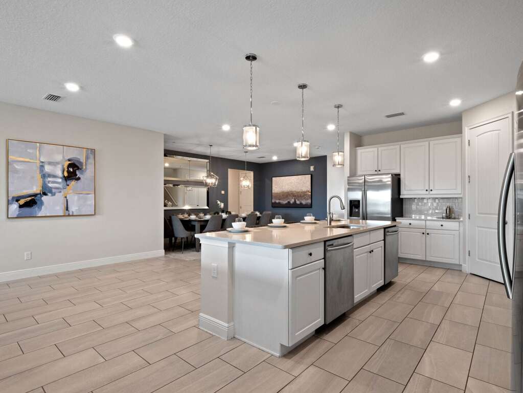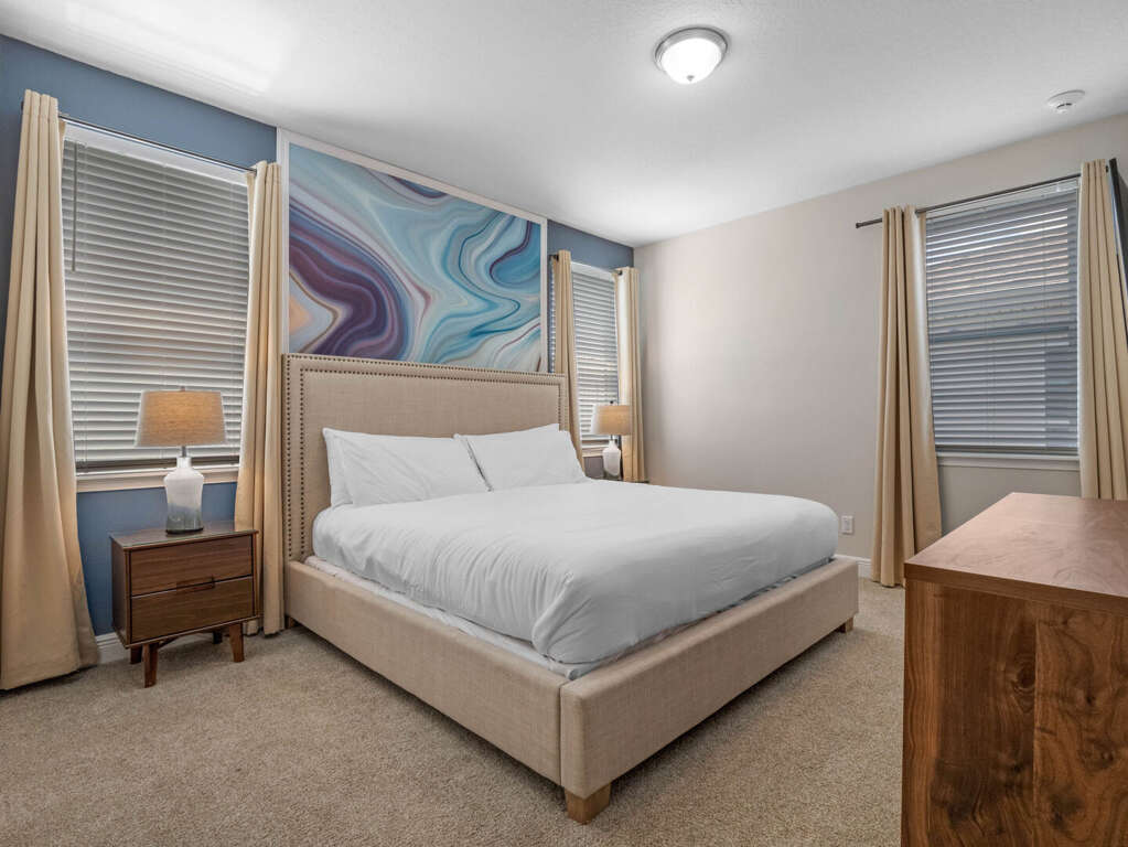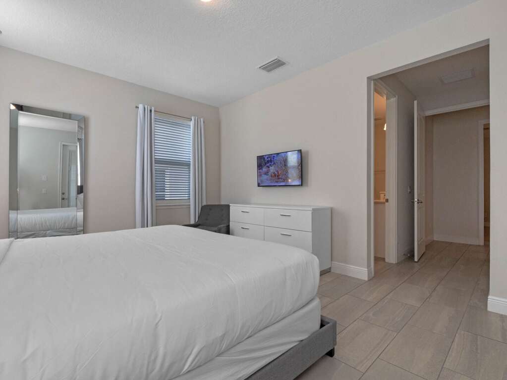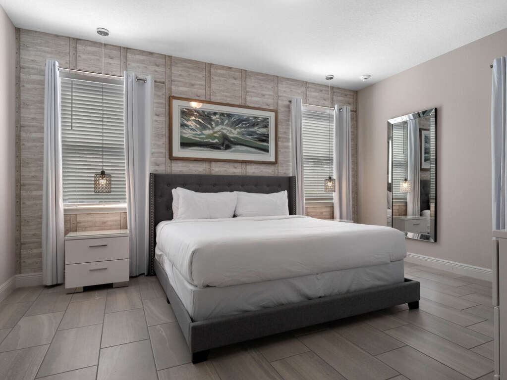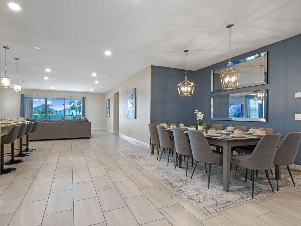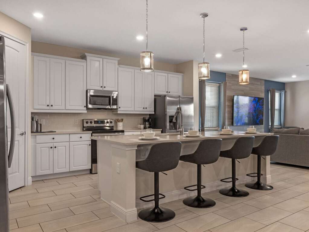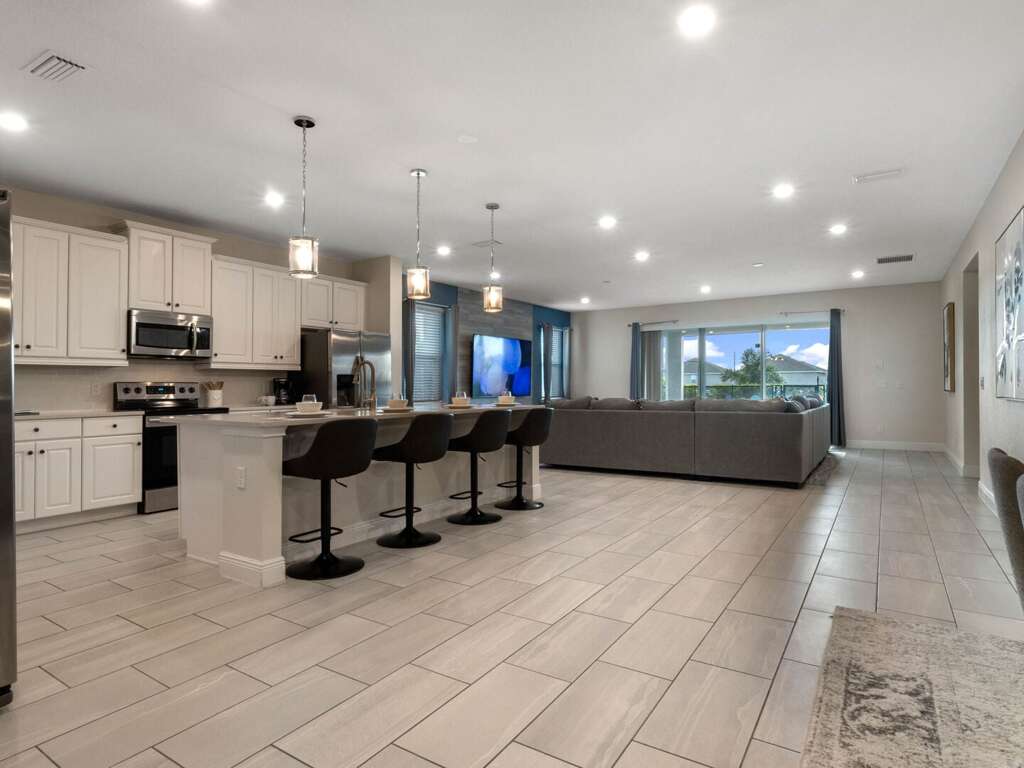 Upon entering, and a few steps inside, you’ll notice the expansive living/ dining/ kitchen area, furnished with contemporary furniture and high-end kitchen appliances. In fact, the kitchen features dual refrigerators and dishwashers to make preparing meals for large groups a breeze. The spacious living area features a large comfy sectional and 86 inch mounted flat-screen television and becomes the foundation of a memorable family night. A large dining table with lots of seating can be found to the right of the kitchen.