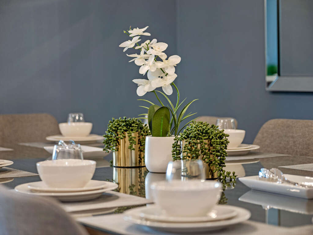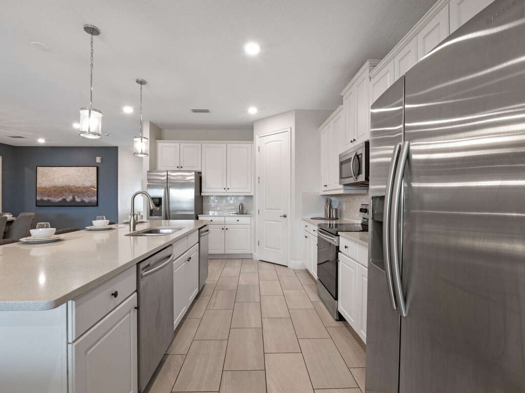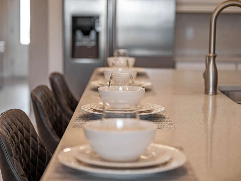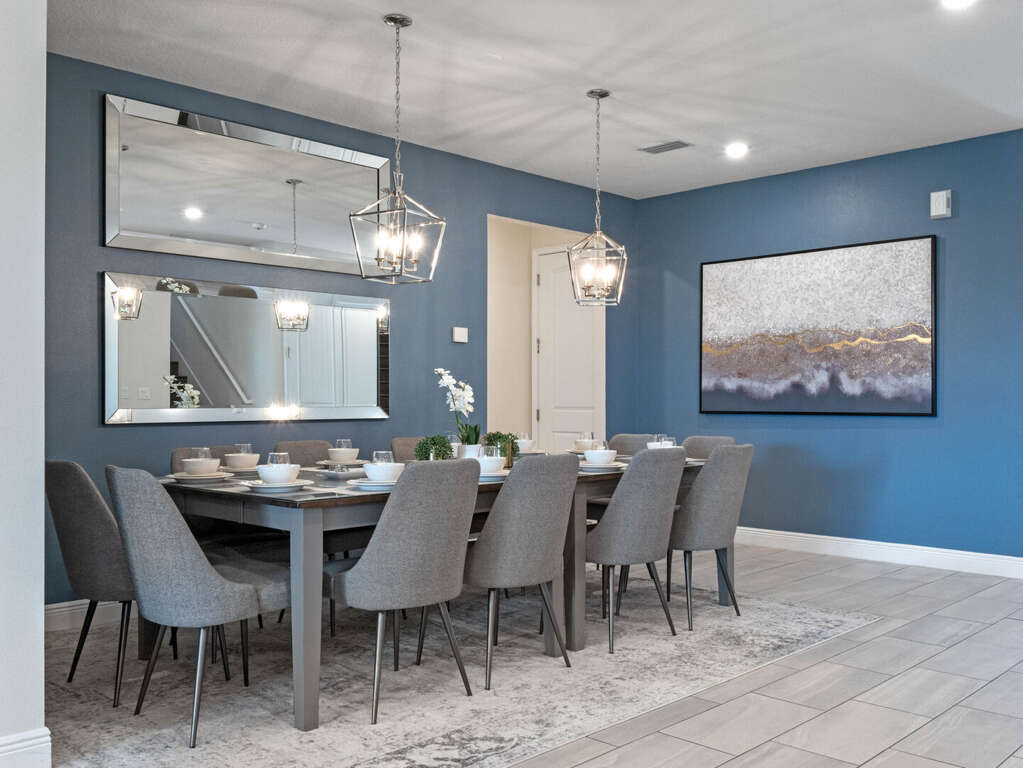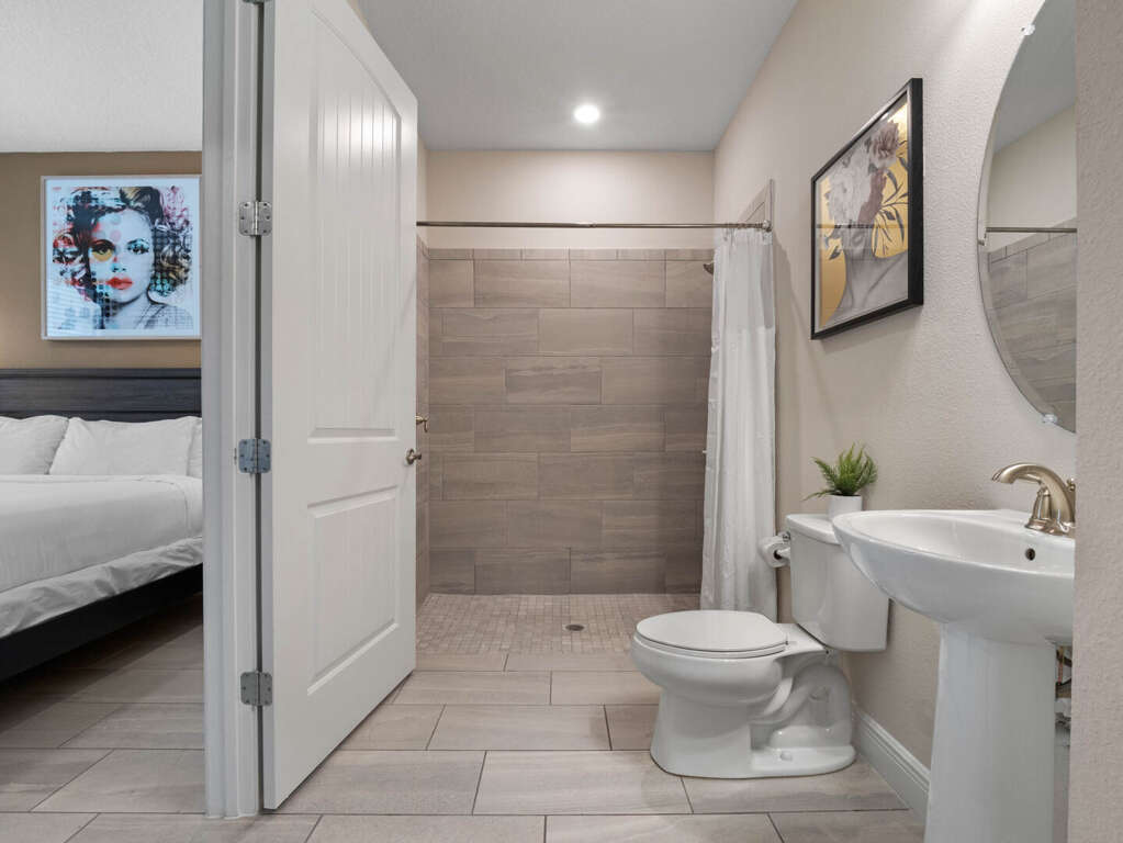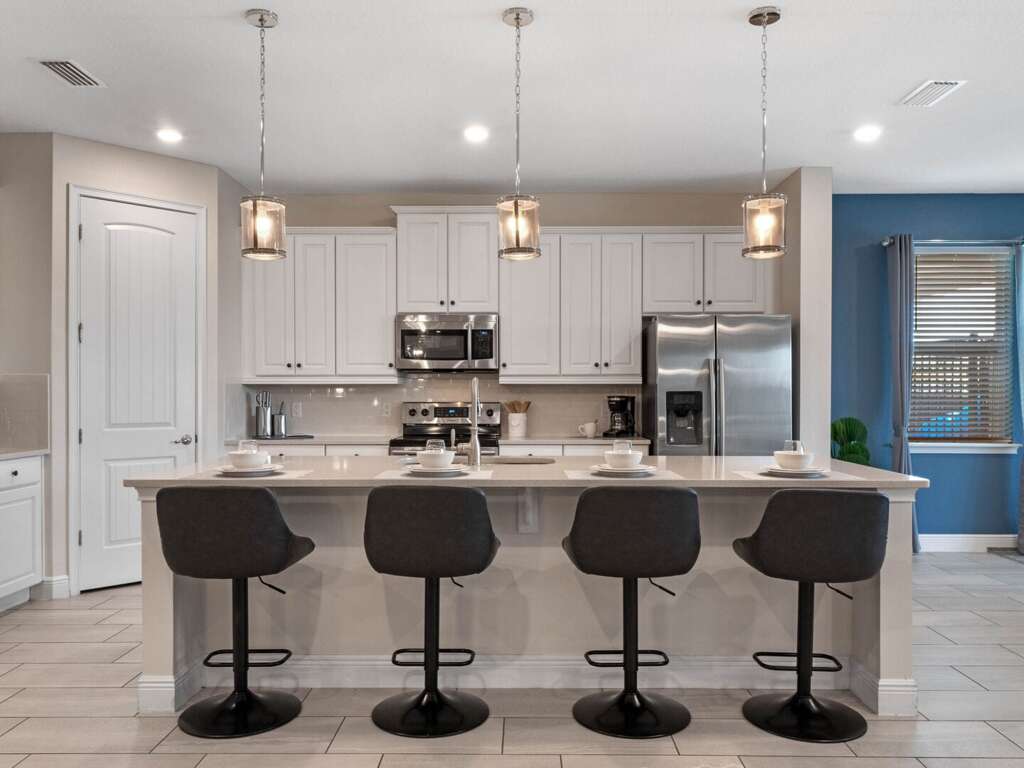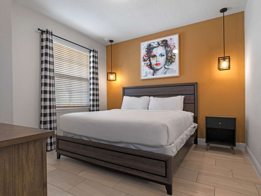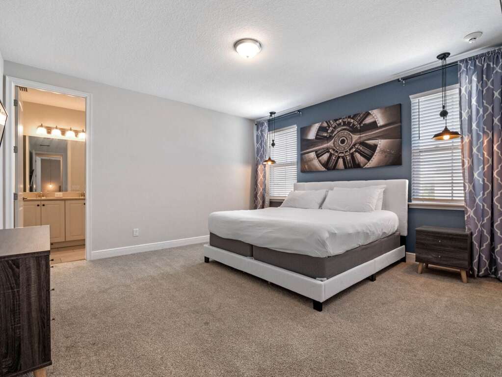 Upon entering, and a few steps inside, you’ll notice the expansive living/ dining/ kitchen area, furnished with contemporary furniture and high-end kitchen appliances. In fact, the kitchen features dual refrigerators and dishwashers to make preparing meals for large groups a breeze. The spacious living area features a large comfy sectional and 86 inch mounted flat-screen television and becomes the foundation of a memorable family night. A large dining table with lots of seating can be found to the right of the kitchen.