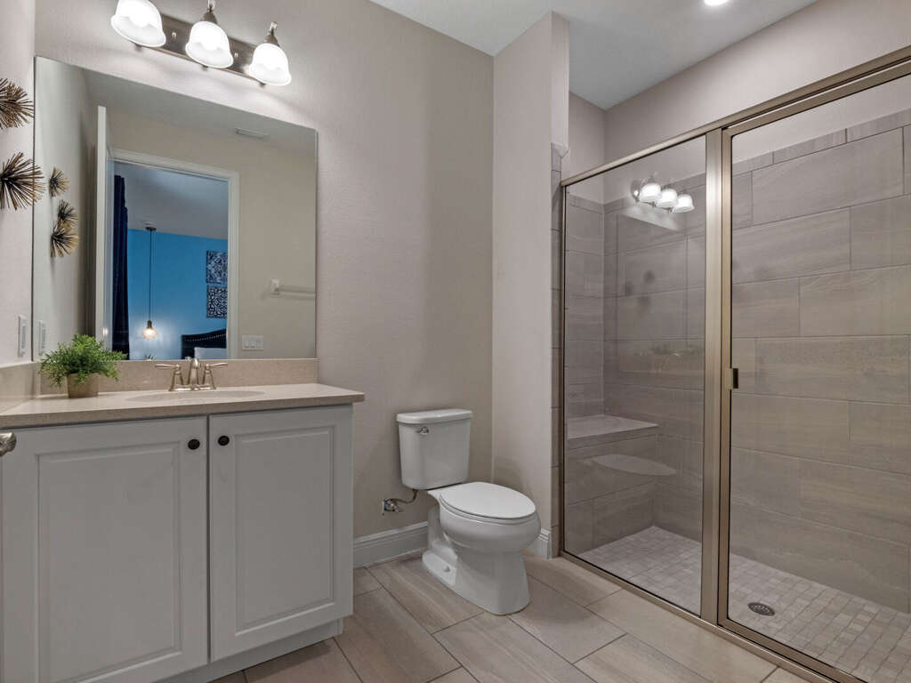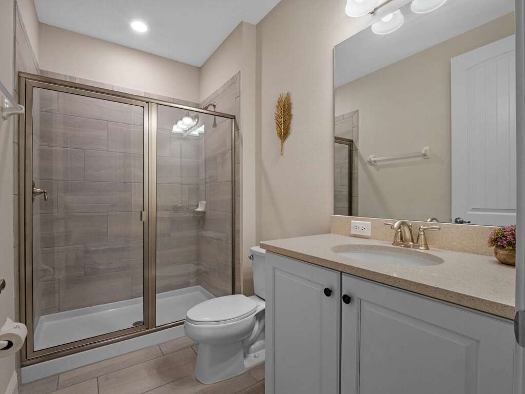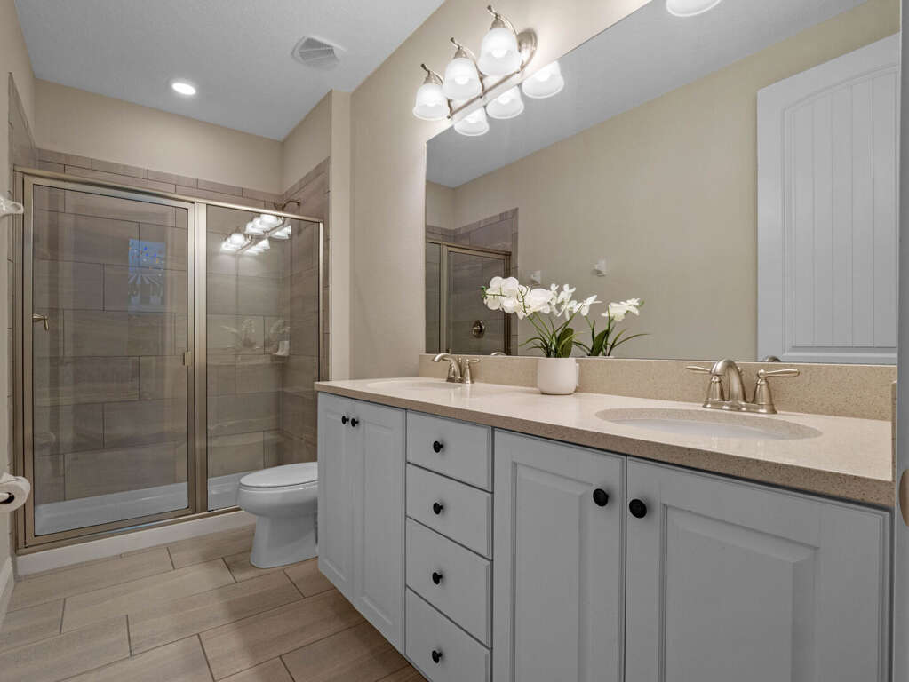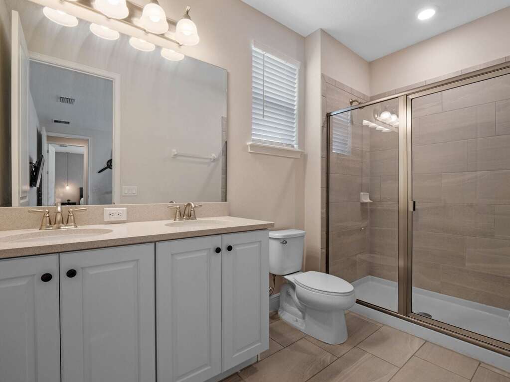 Bathroom 4 – 2nd floor in Bedroom 4, dual sinks, glass enclosed shower