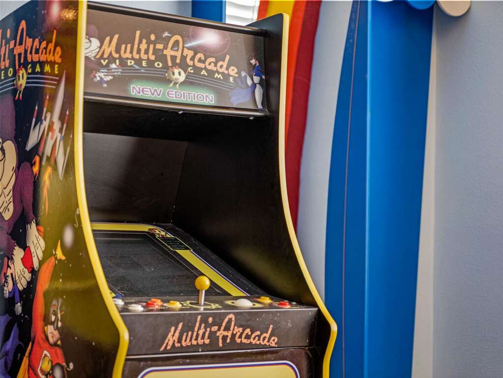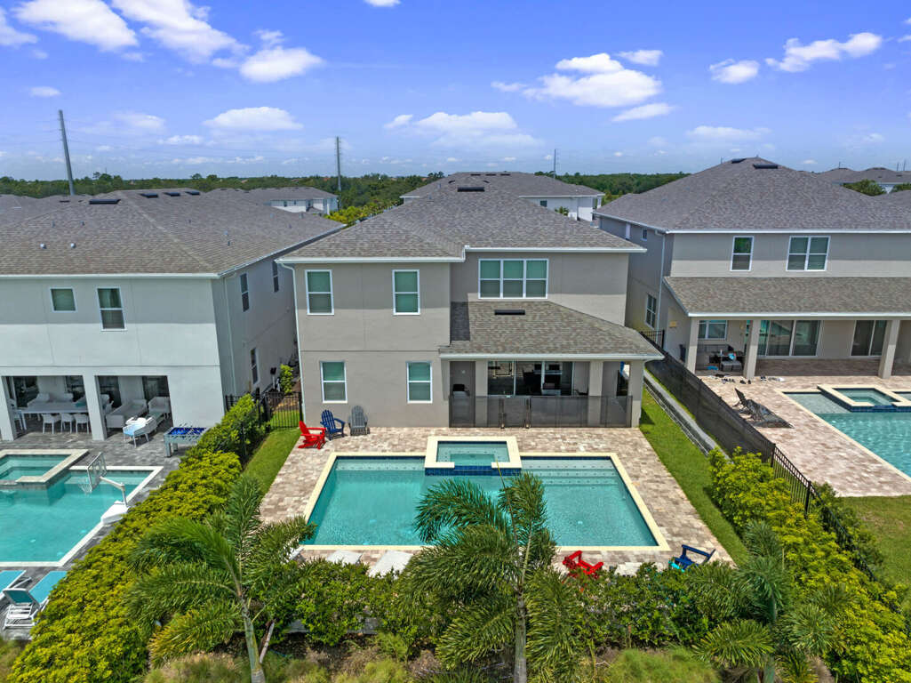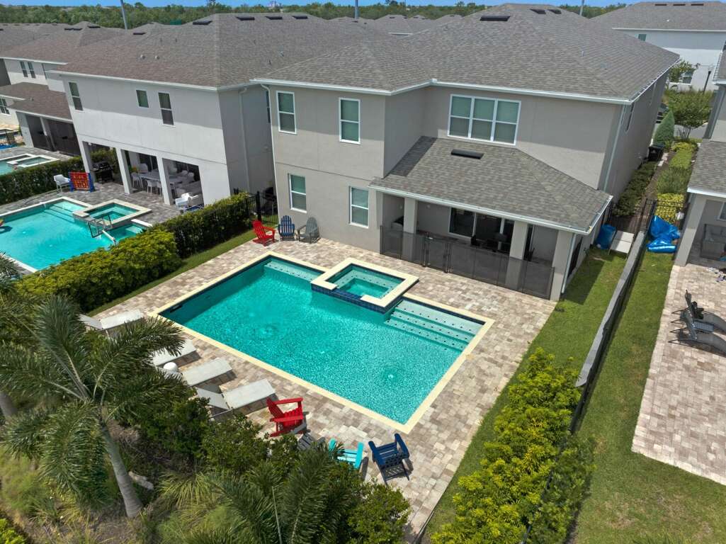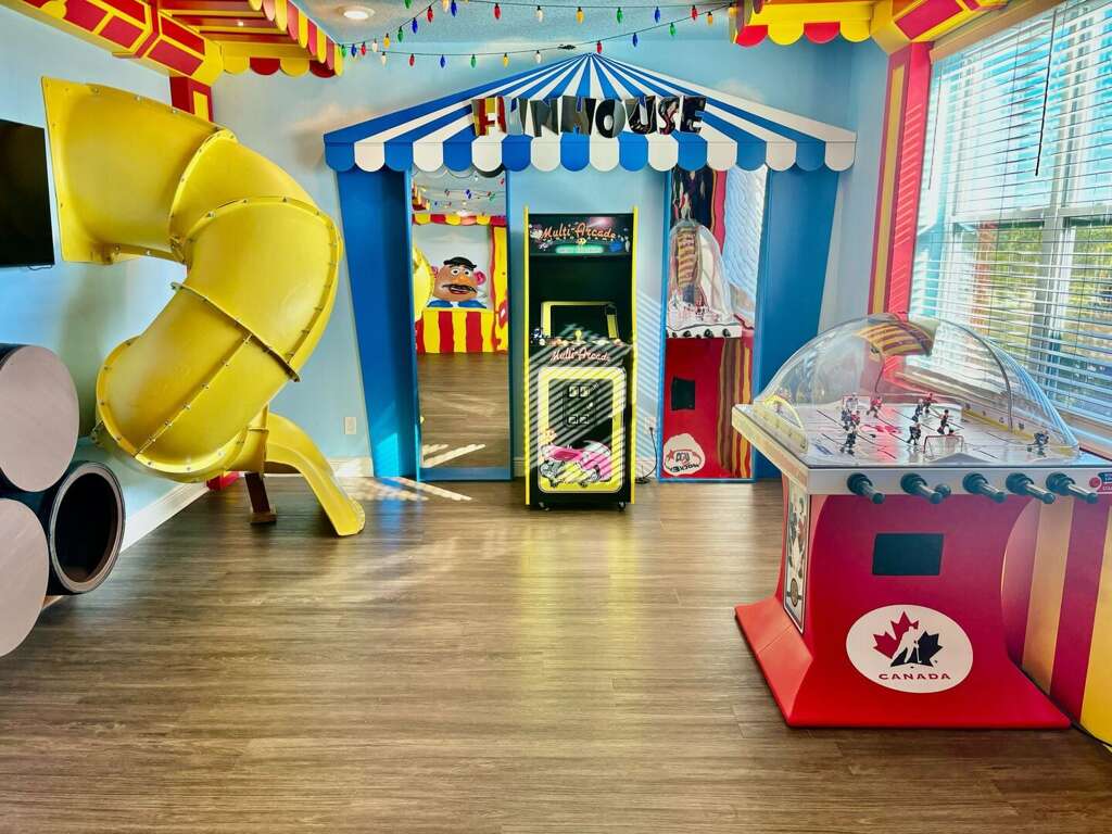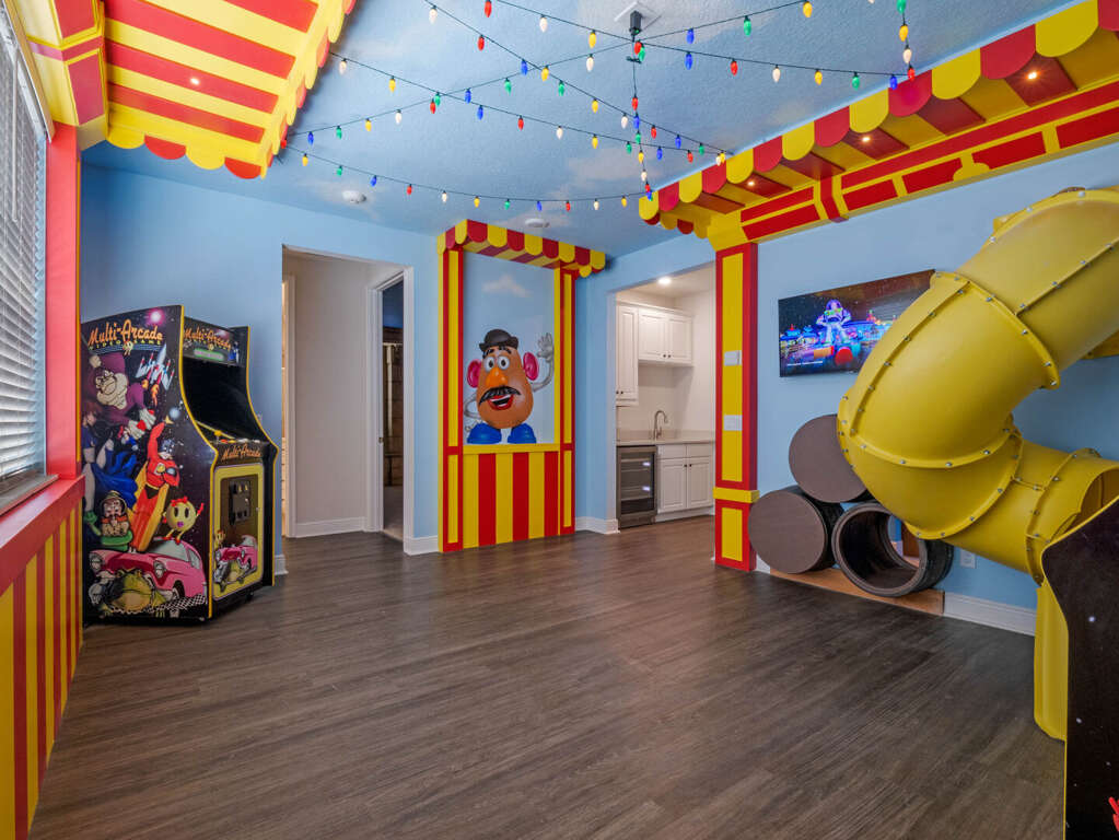 Large house in Kissimmee with 10 bedrooms, themed rooms, a private pool and spa deck, game room arcades, and a 1930s-style theater for groups.