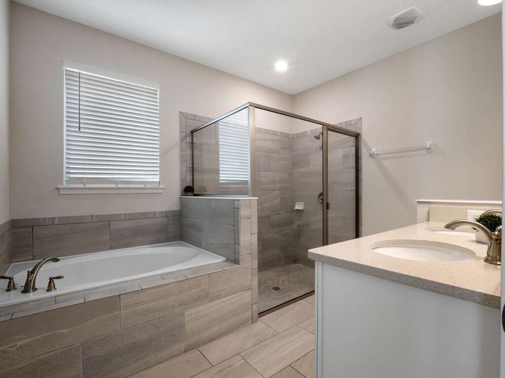Bathroom 2 – 1st floor in Bedroom 2, dual sinks, glass enclosed shower, large soaker tub