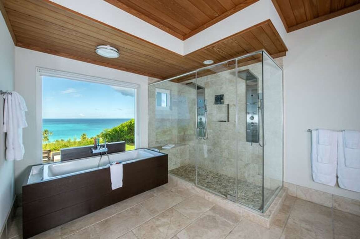 This spacious 3200-square-foot villa features an abundance of glass to capitalize on the breathtaking views. 50-mile, 180-degree beach and ocean views spread out in front of you from every major room. The house has two master bedroom suites with king beds and ocean views, and two guest bedroom suites with queen beds. Every bedroom has total privacy, with en-suite baths and well separated entrances off long hallways. There are also two rollaway beds available.