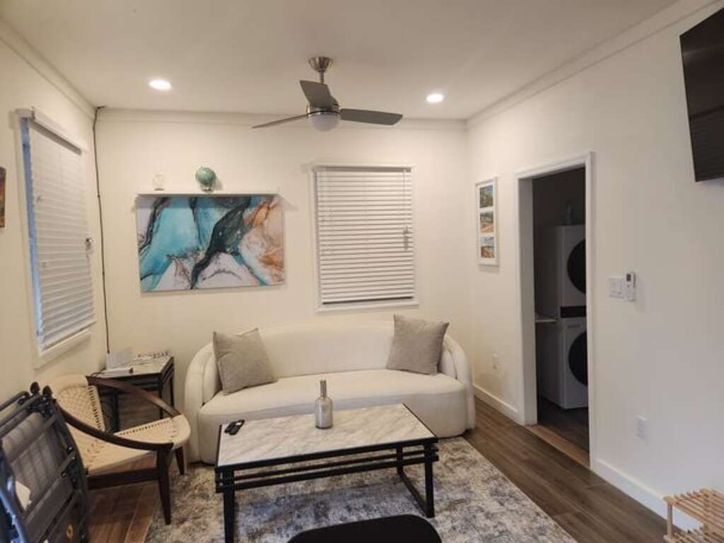 Startlit Retreat features one bedroom with a queen bed and one full bath. The modern island kitchen is equipped with a refrigerator, gas range and oven, microwave, toaster, coffee-maker, and more. The living room is equipped with a wall-mounted flat screen smart TV and a sofa and chair. Amenities include air conditioning throughout, WIFI, and a washer/dryer.