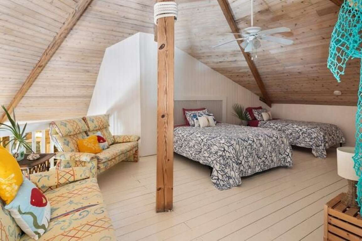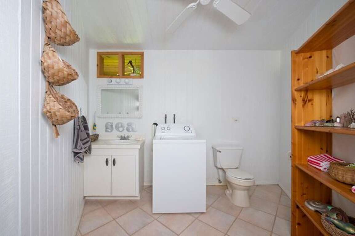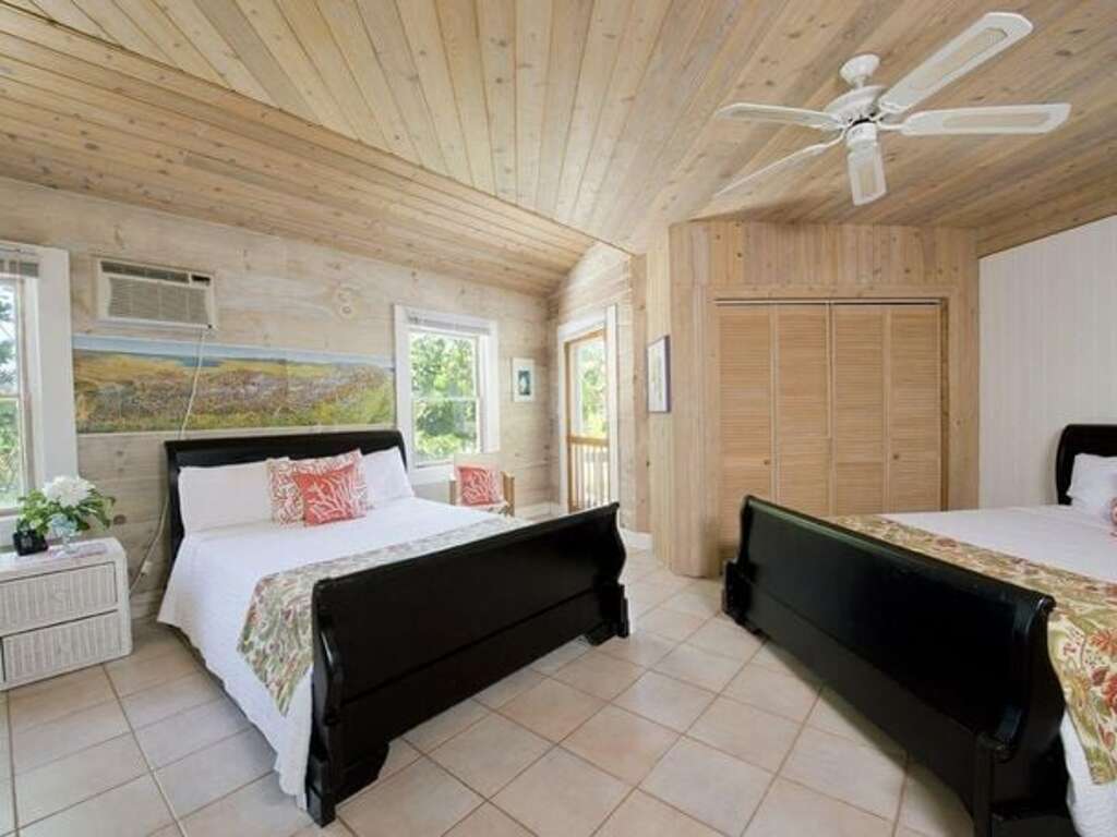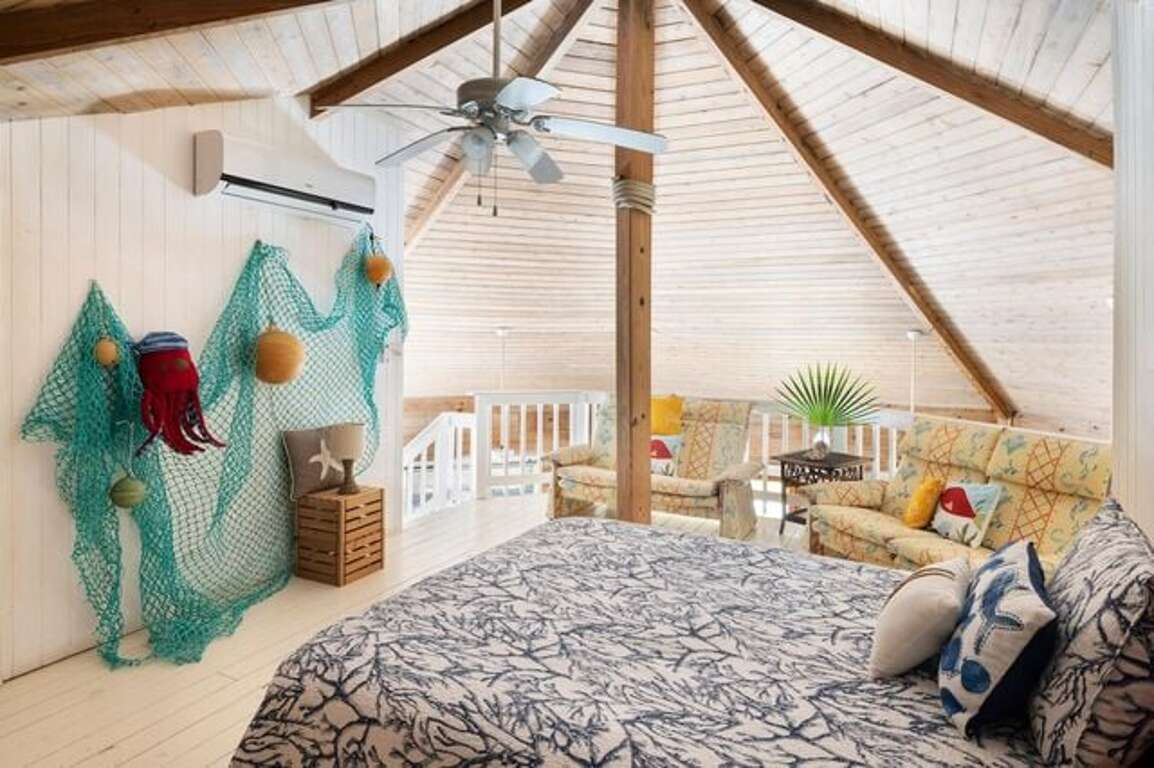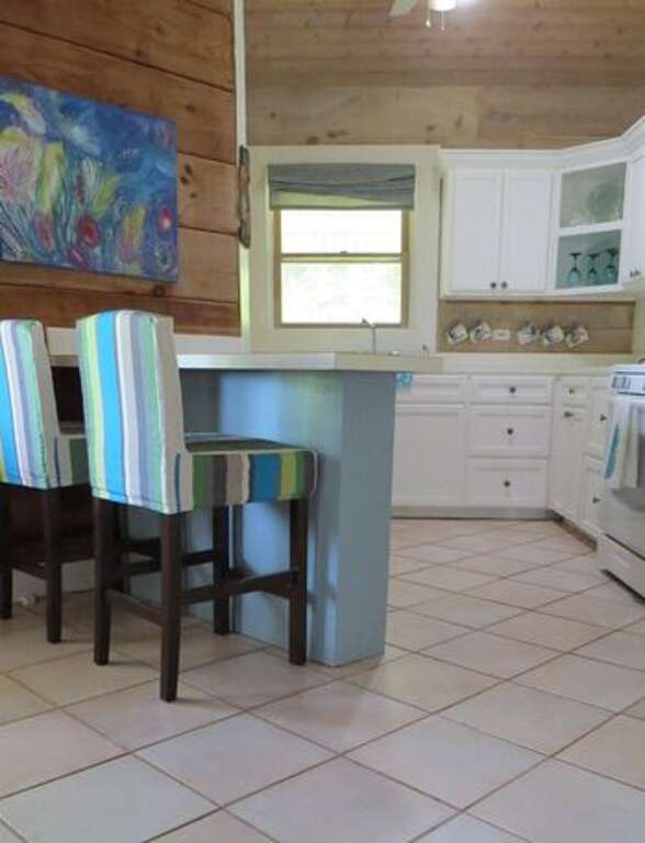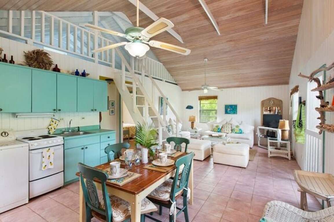 Orchid Cottage, next door, is a bright and lovely Bahamian style cottage. The open concept living room, dining room, and kitchen areas allow for your entire group to interact during cooking, eating, & family activities. The kitchen is equipped with everything you will need to prepare your meals and it also offers the convenience of a washing machine. The cathedral ceiling gives the cottage an airy feeling and a central wooden staircase leads to a loft area.
