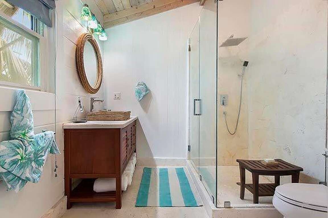 The cottage has two bedrooms, one with a queen bed and the second bedroom with a king bed that can be converted into two twin beds. Between the two bedrooms is a three piece bathroom. The large walk-in shower is decorated with sea pebbles, sea glass, and shells embedded in the floor.
