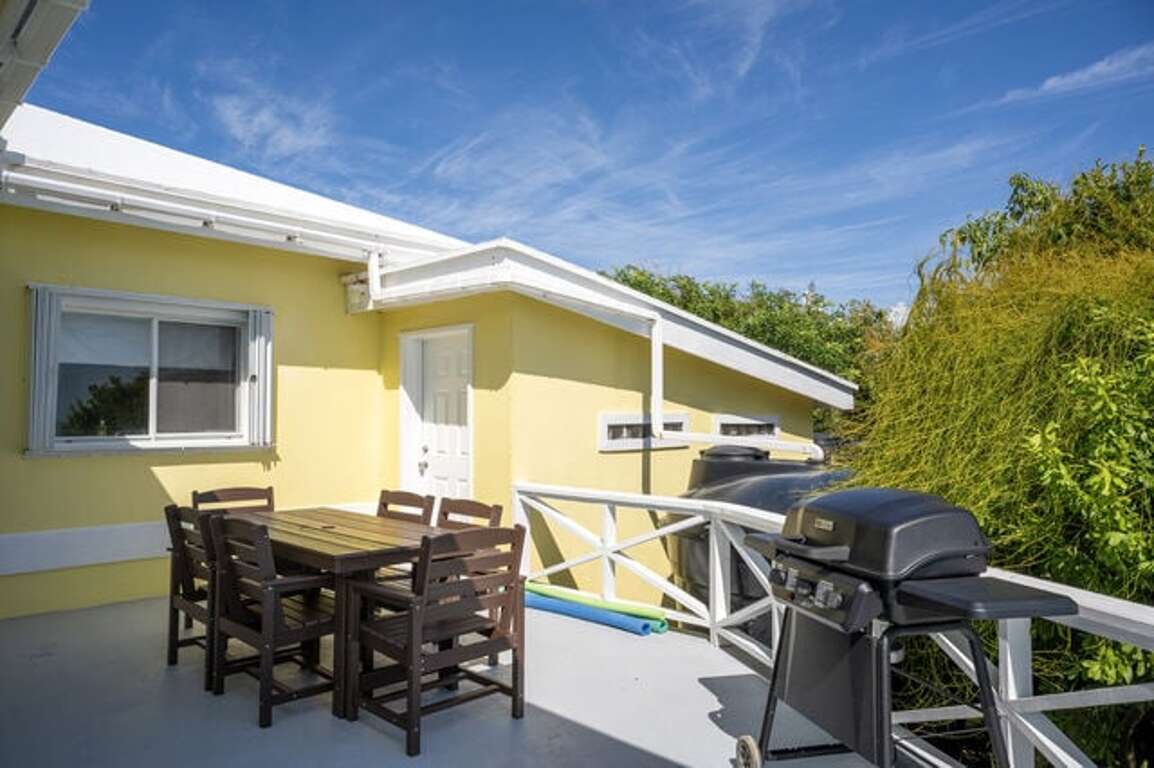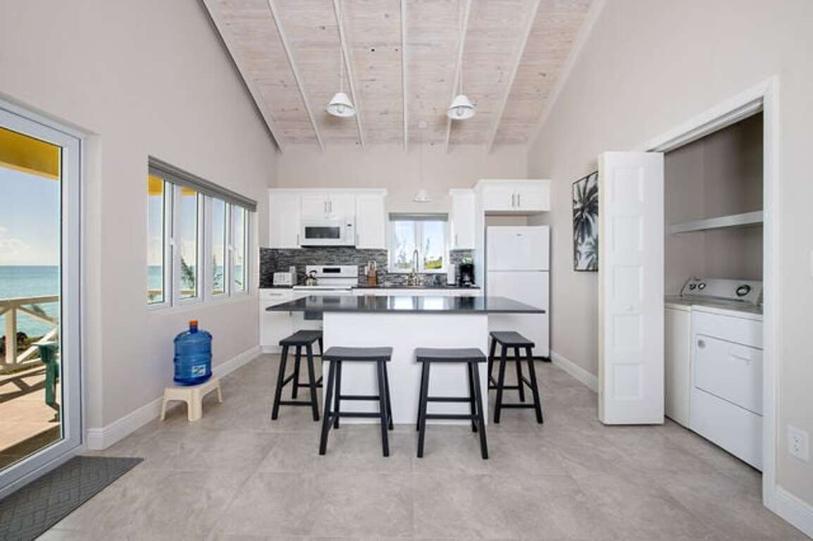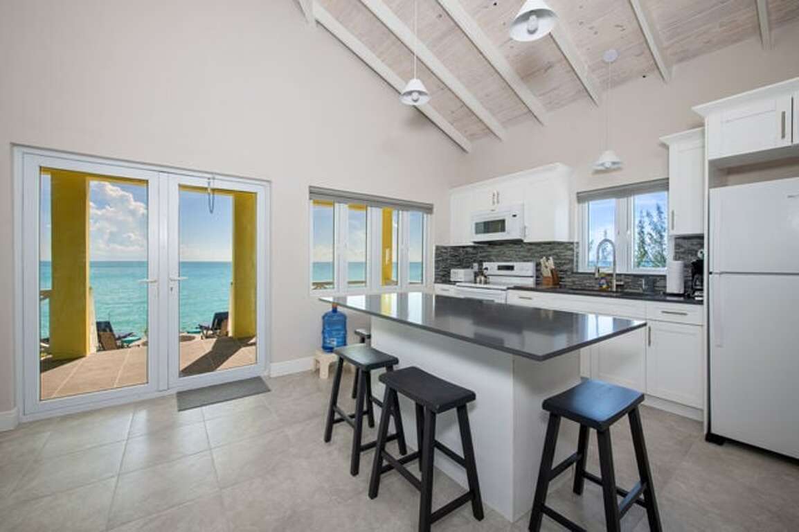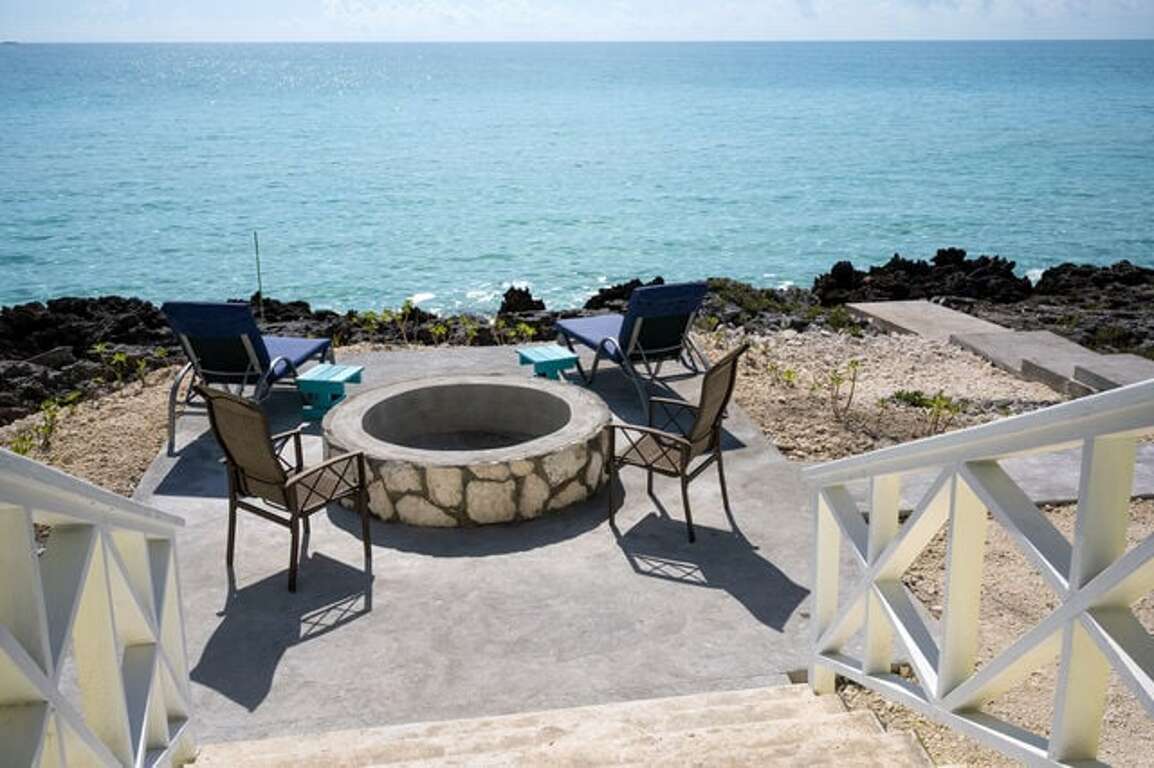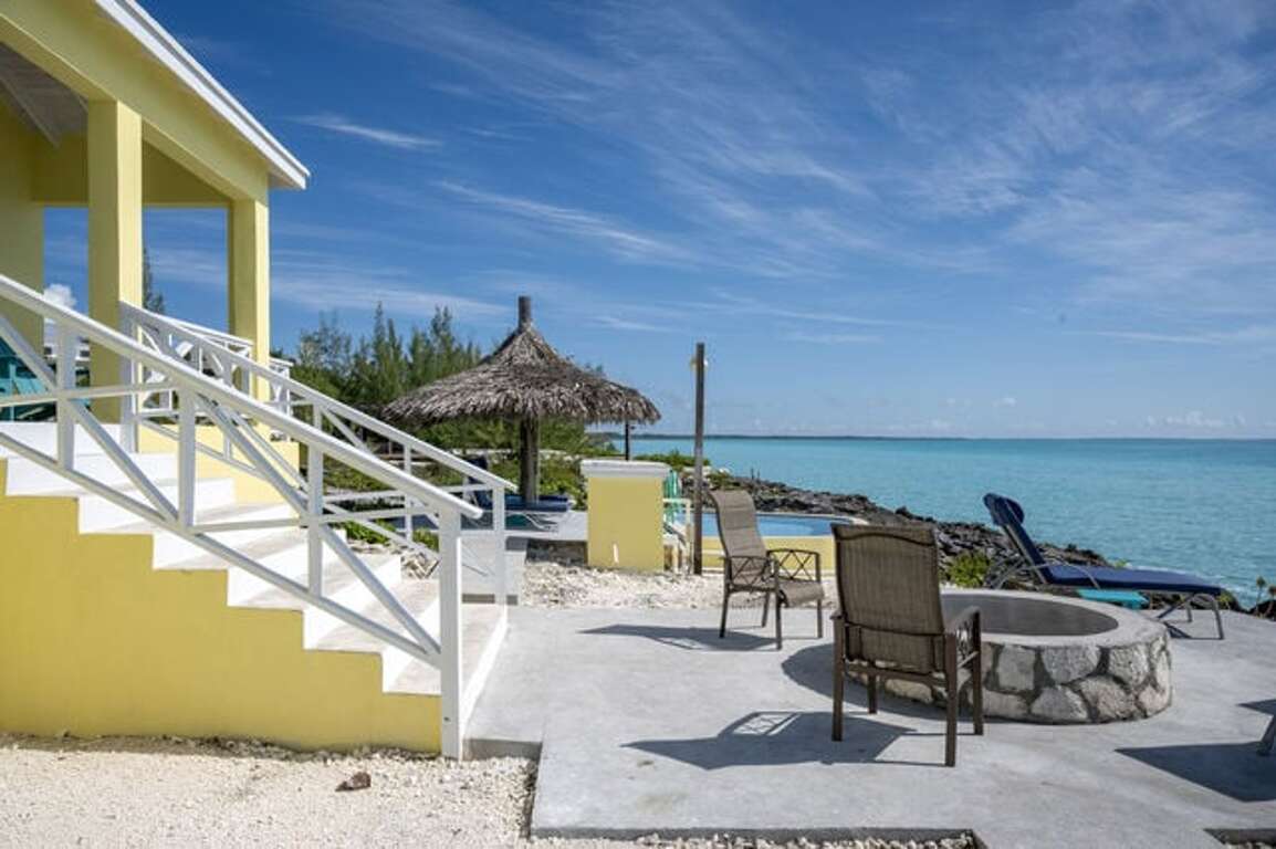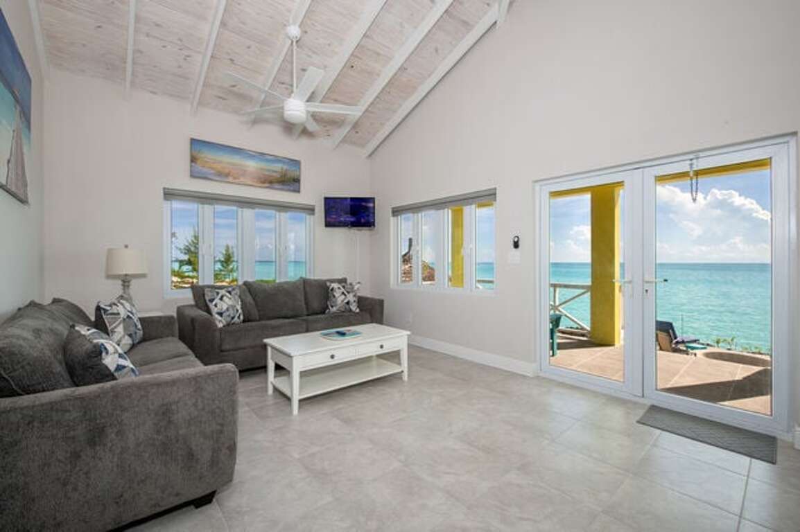 The great room opens through sliding glass doors onto a vast oceanfront patio. The patio is furnished with 2 three-person porch swings, an outdoor dining area with seating for six, and extra chairs and umbrellas for enjoying our stunning view of Bahamian turquoise waters.