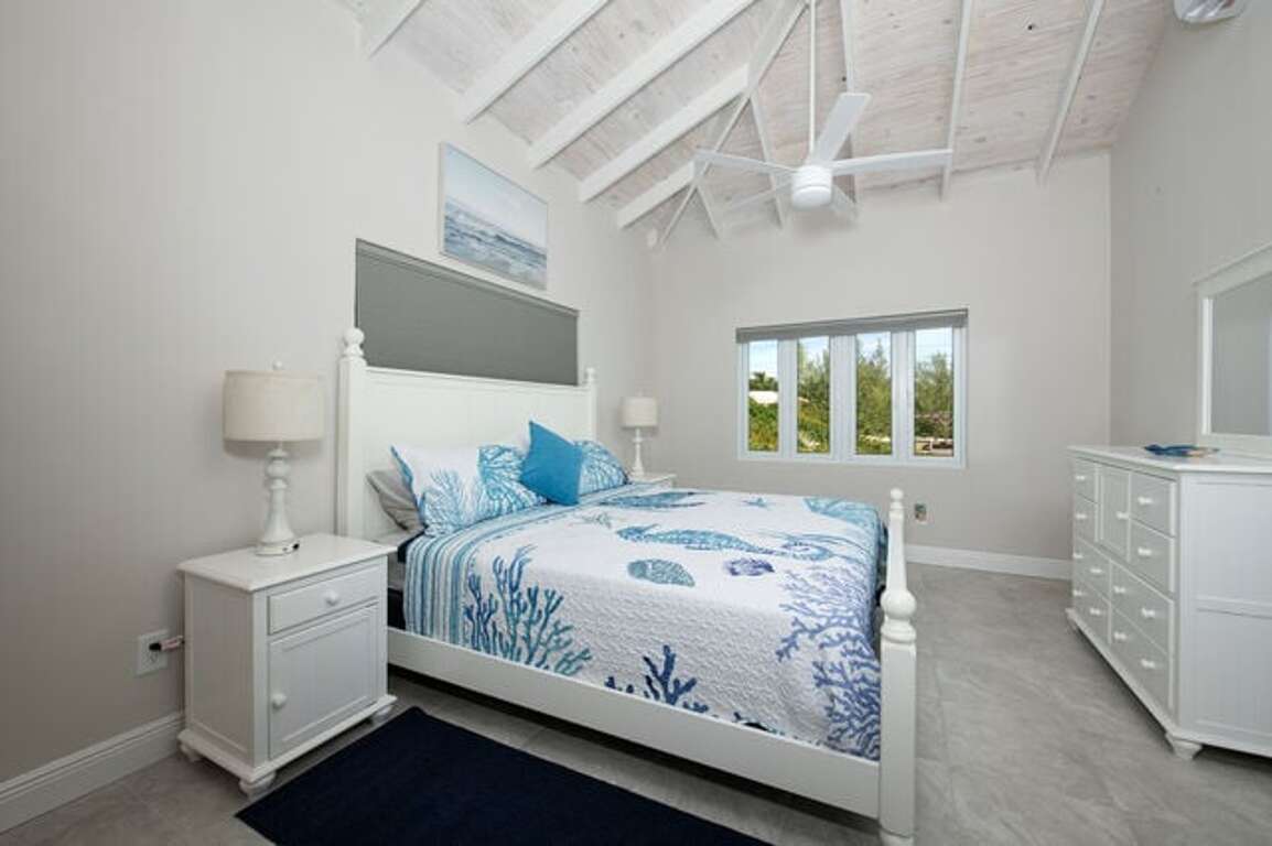 The Main House features a master bedroom suite with a king bed and an en-suite full bath. This room has a sliding door which opens onto its own private patio overlooking the seas. The two guest bedrooms share a bathroom and are furnished with queen beds.
