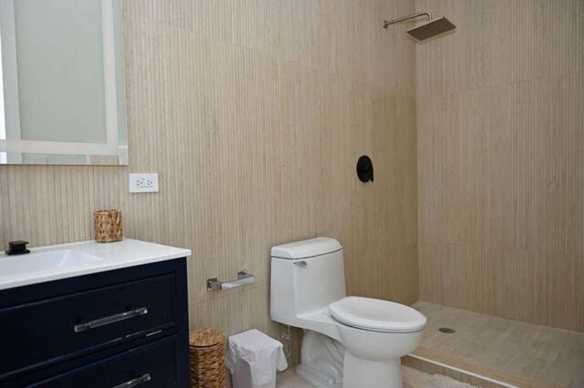 The primary bath is designed with the same architectural intention as the rest of the home—elegant, modern, and intelligently laid out. It connects discreetly to the main living area for convenience, yet maintains complete privacy via a dedicated door to the bedroom—ideal for mornings when the house is waking up in layers. Inside, the finishes feel crisp and elevated: LED mirrors add a clean glow, while the oversized step-in shower makes a statement with glass-stone flooring and a rain-shower head.