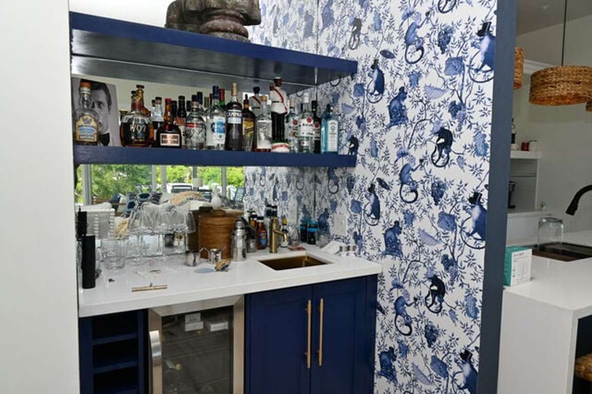 This is the house’s personality in one corner: the famed “Drunk Monkey” wet bar, wrapped in iconic blue-and-white wallpaper featuring whimsical monkeys sipping cocktails, with a quartz counter, brass sink, wine fridge, and a proper martini setup. It’s a built-in ritual—shake, pour, toast, repeat.