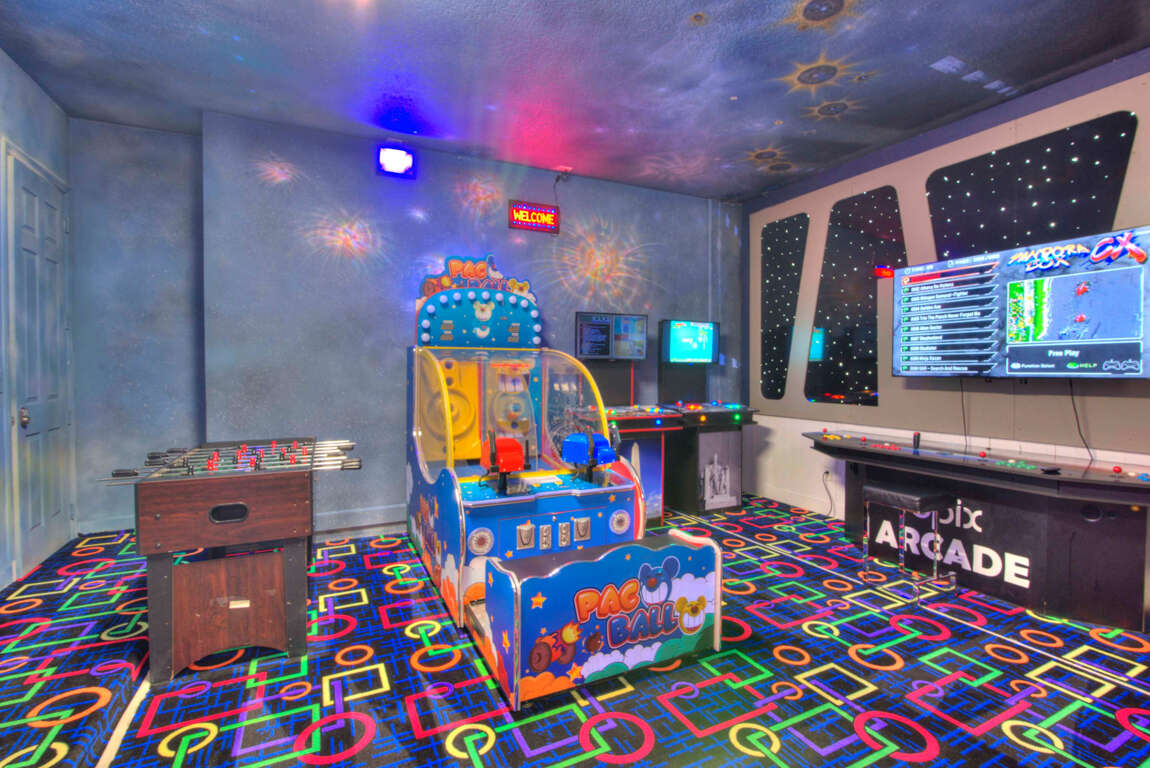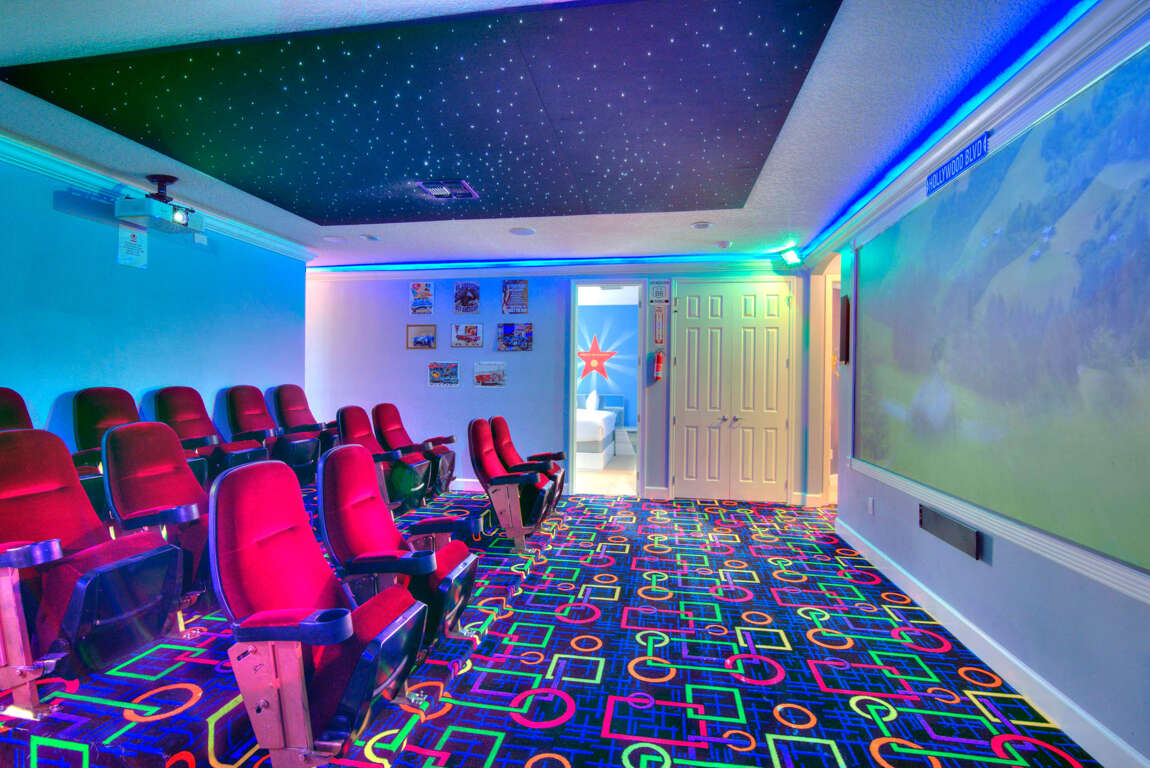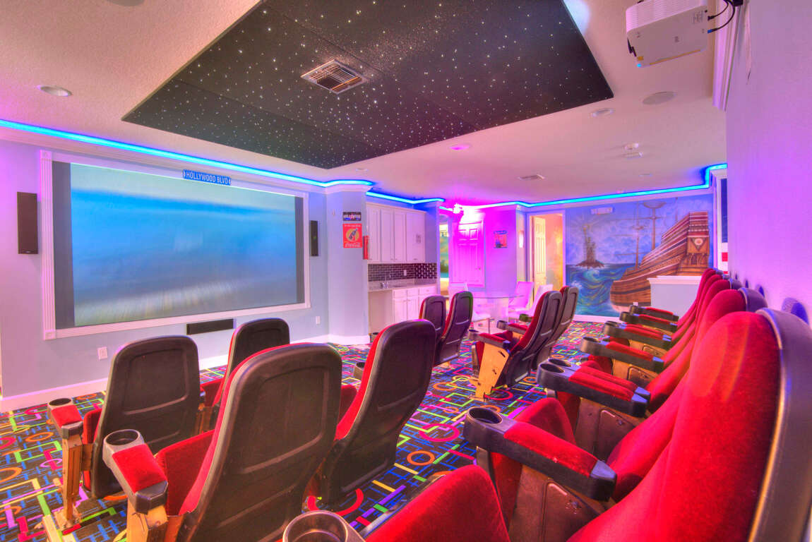 Luxury 14-bedroom villa in Davenport, FL with private pool, bowling lanes, home theater, game room, and space for up to 40 guests.