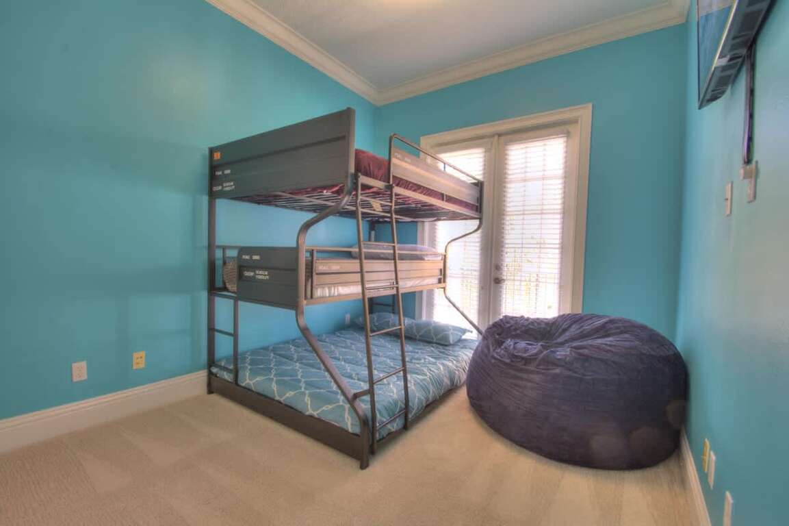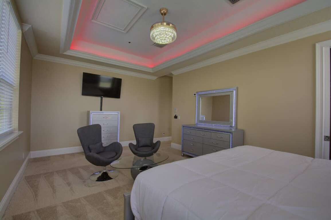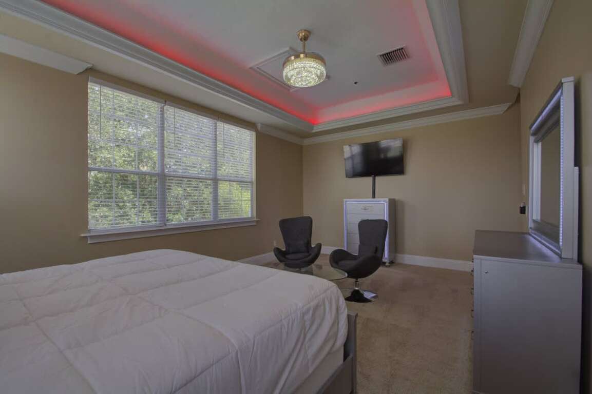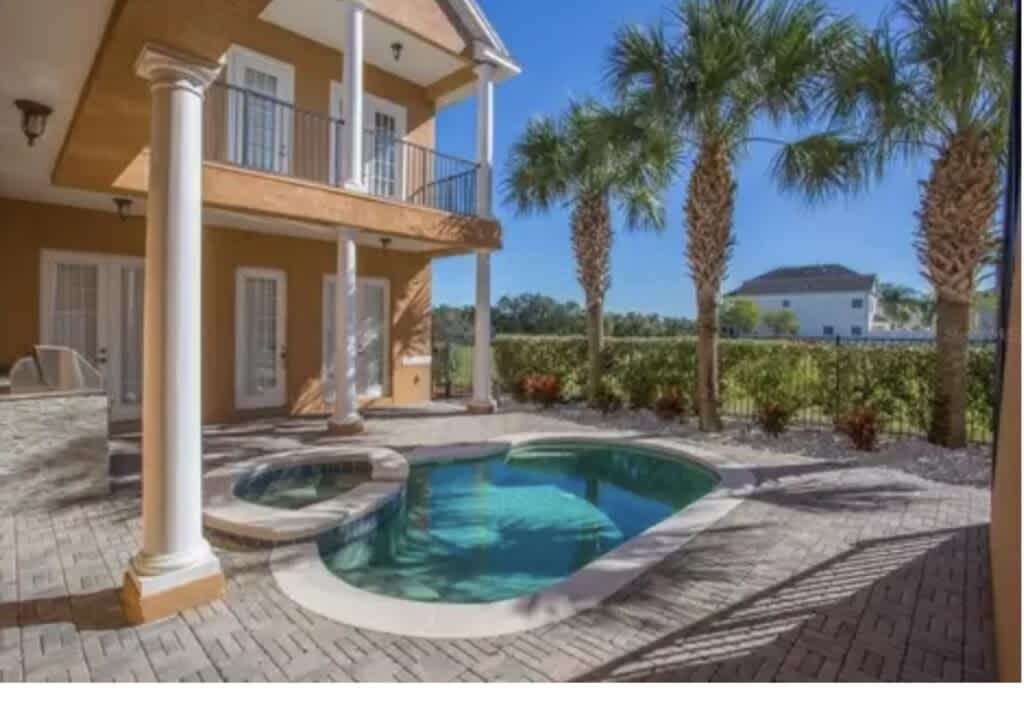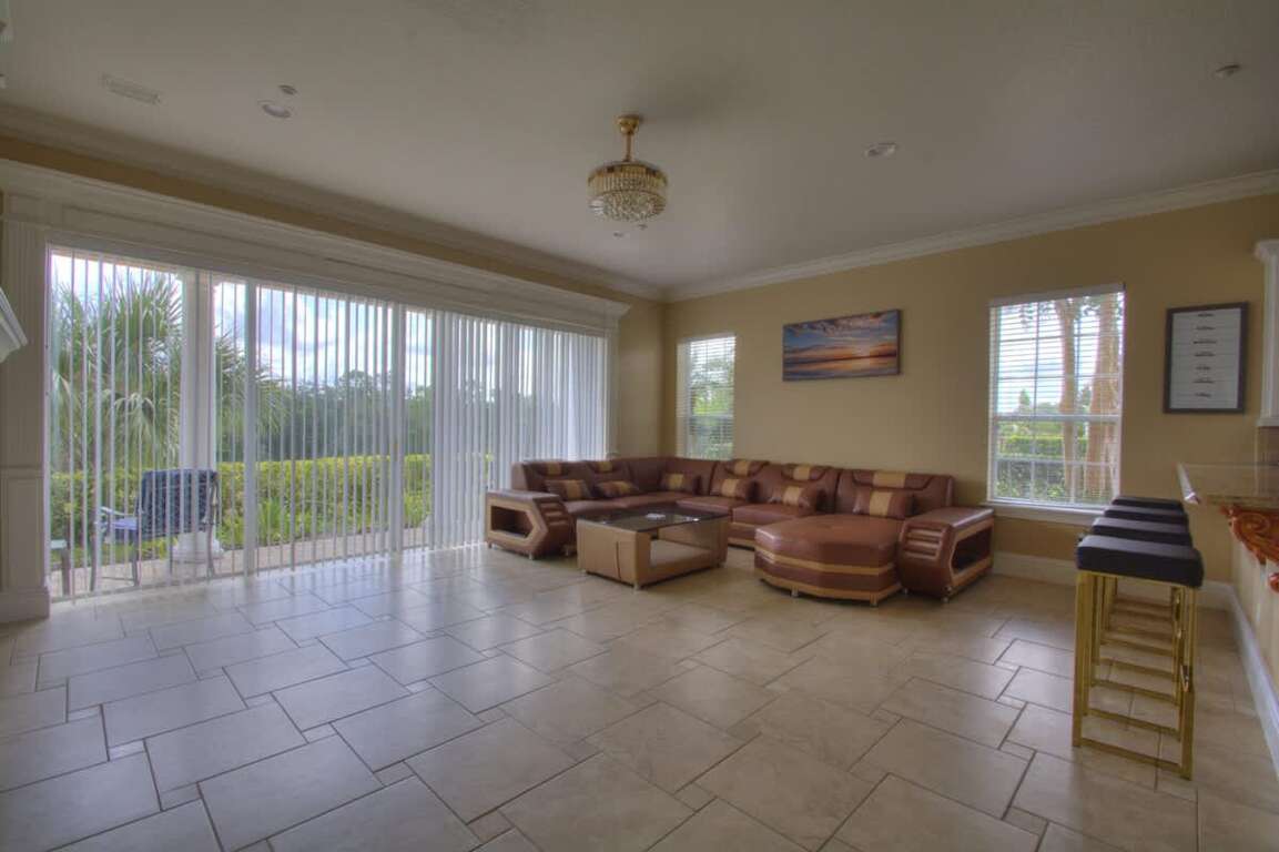Golf Course Home by Disney Spectacular views of the golf course. This spacious 4312 sq ft, 3-story layout provides an open plan living. LED lights throughout. It is located only minutes to Disney World and all the them park attractions in the Orlando area. The main house has 5 bedrooms (3 king beds, 1 a full-over-full bunk bed +twin trundle, and 1 full-over-twin-over queen bed) and 5 baths. The guest house has 1 bedroom (queen) and 1 bath and its own private entrance, which guarantees guest privacy and comfort. The first floor bathroom is in the main house. Upstairs, there are 3 walk in shower bathrooms and 3 bathtub bathrooms. The 7th half-bath is on the pool deck. No local charges apply.