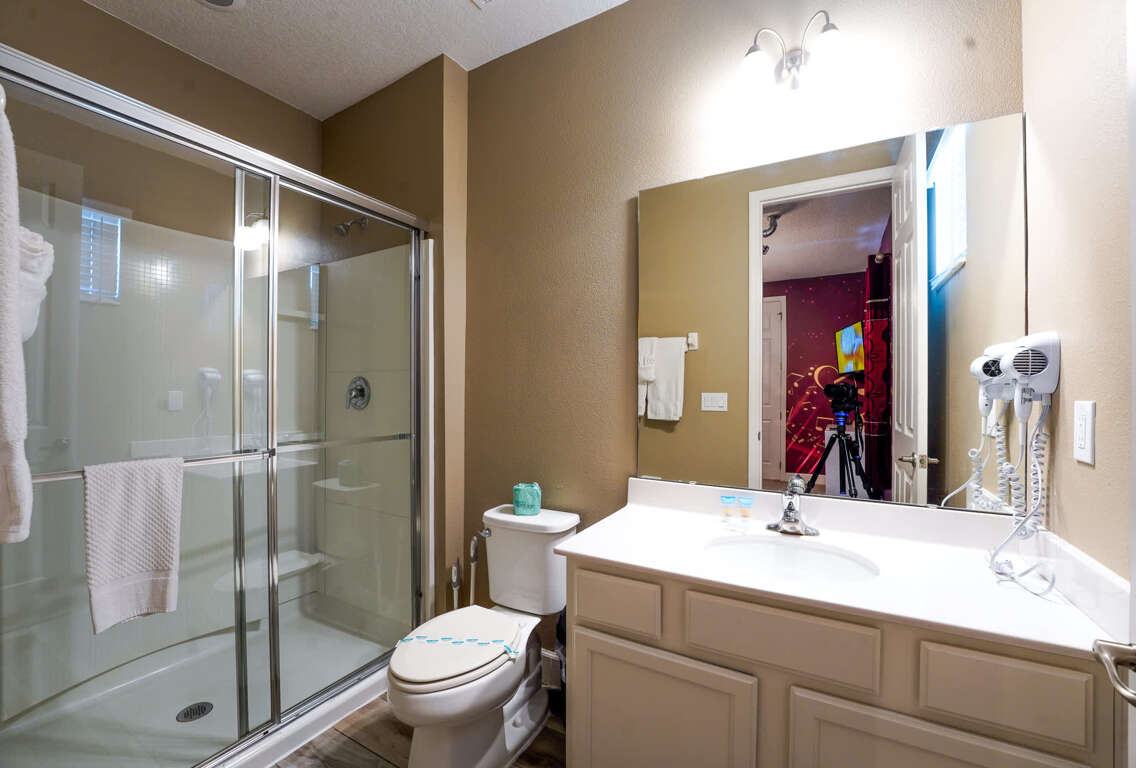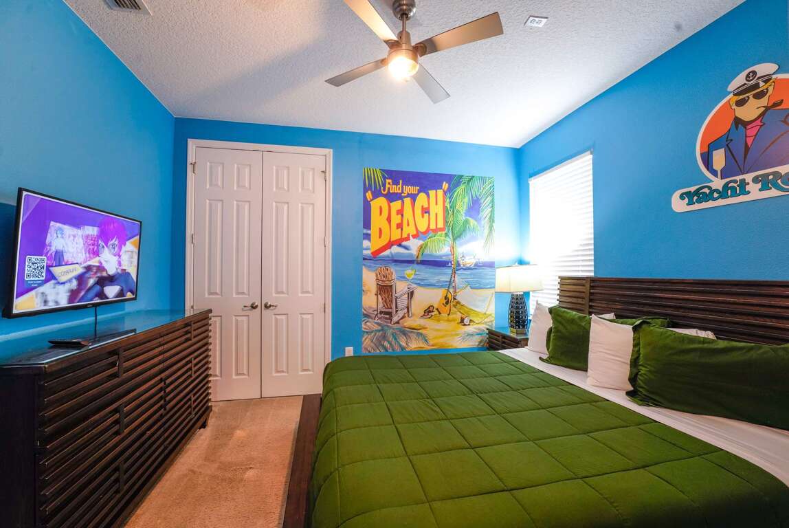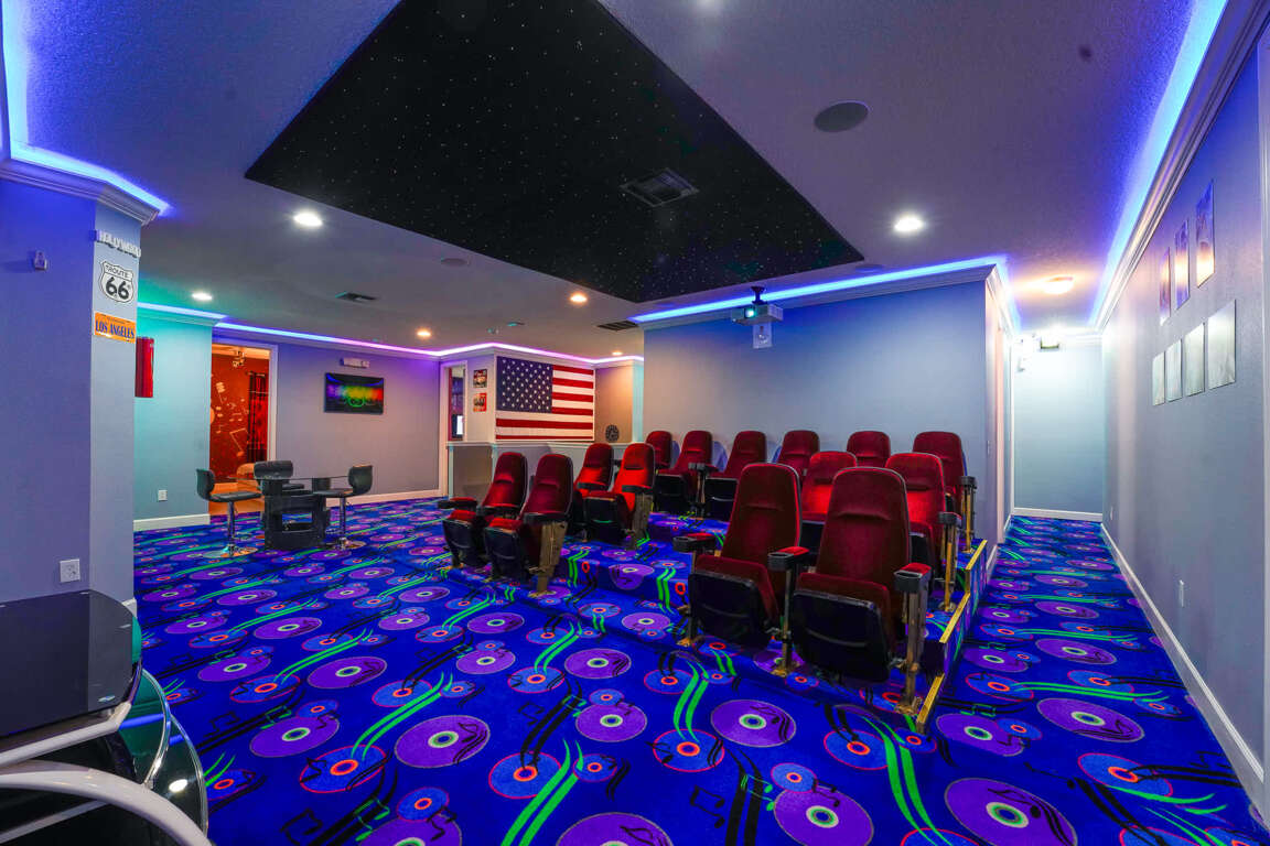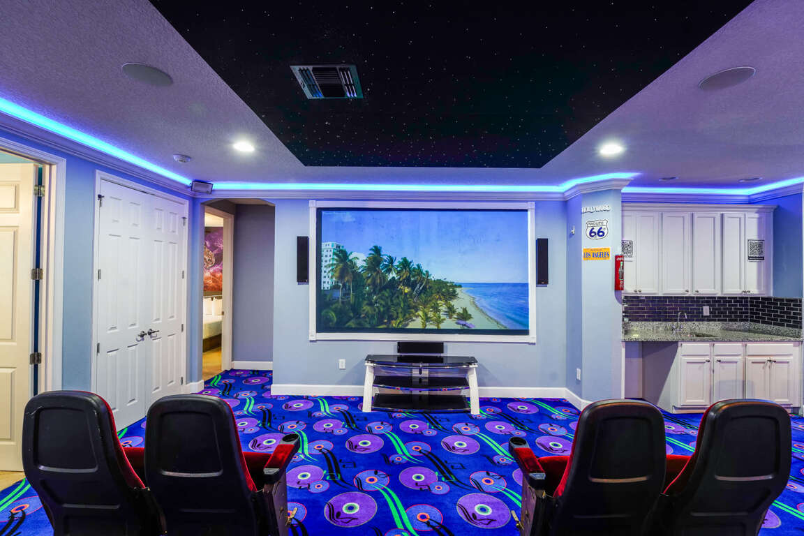 The property features 14 plush bedrooms with Smart 4k TVs and cozy carpeted floors, including 12 king beds and 4 full-over-full bunks in the 2 kids’ rooms, comfortably accommodating large families and groups up to 40 people. Experience the perfect home theater night with the 4k 120-inch LED TV screen in the spacious living room with premium quality audio-system that can entertain your guests with the most immersive viewing experience. Indulge in your own private bowling alley with two lanes and a range of other games including pool table, air hockey table, basketball hoops, water truck, arcade games, and more, perfect for bonding and creating memories with your loved ones. The villa’s unique theme and amenities have been featured by the News 6 at Nine news channel.