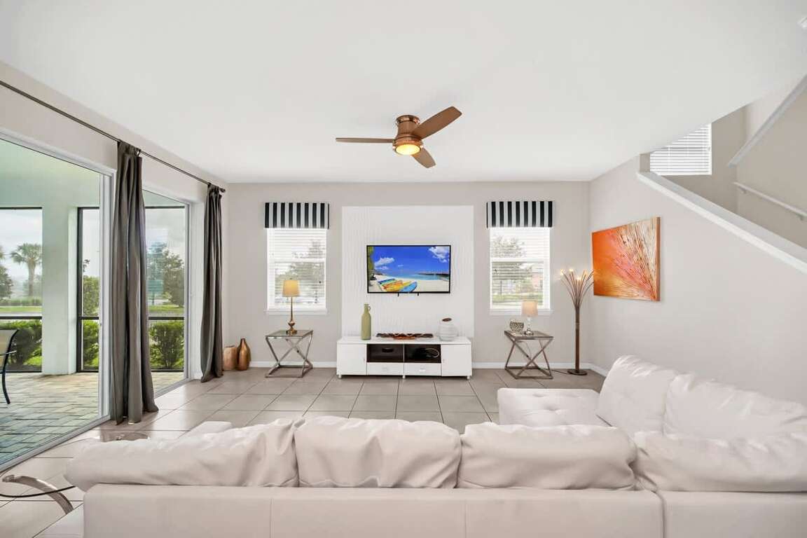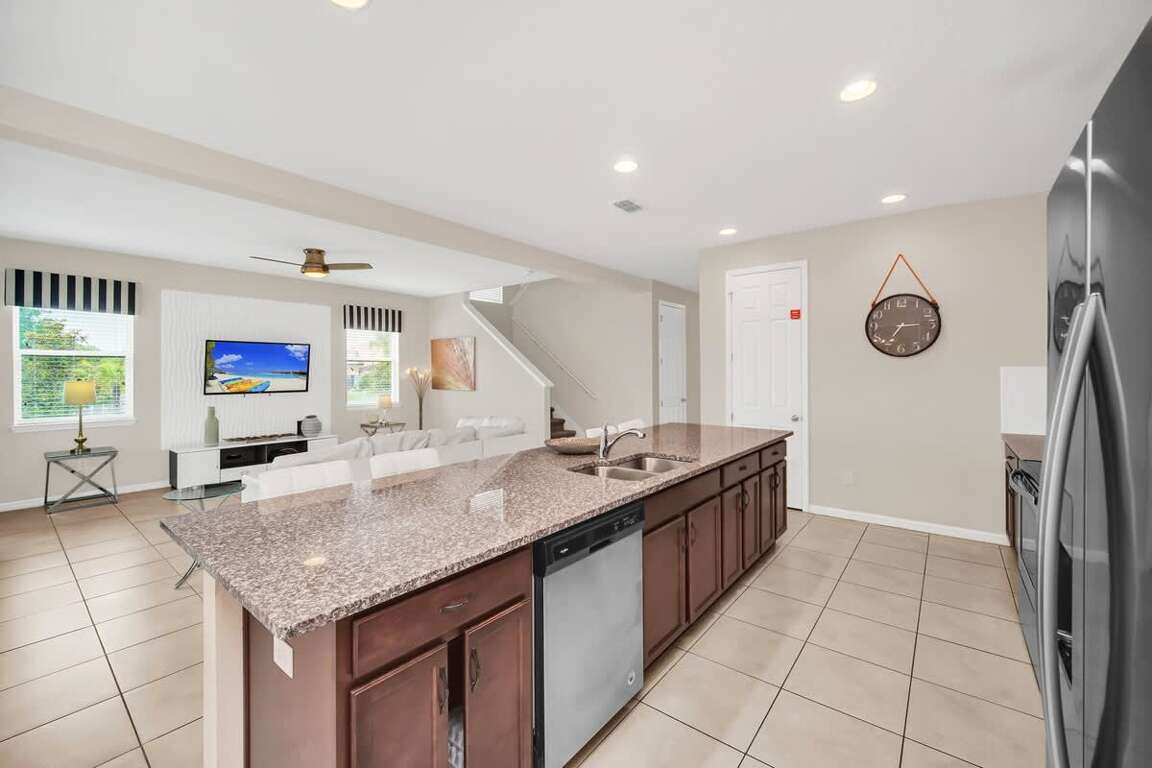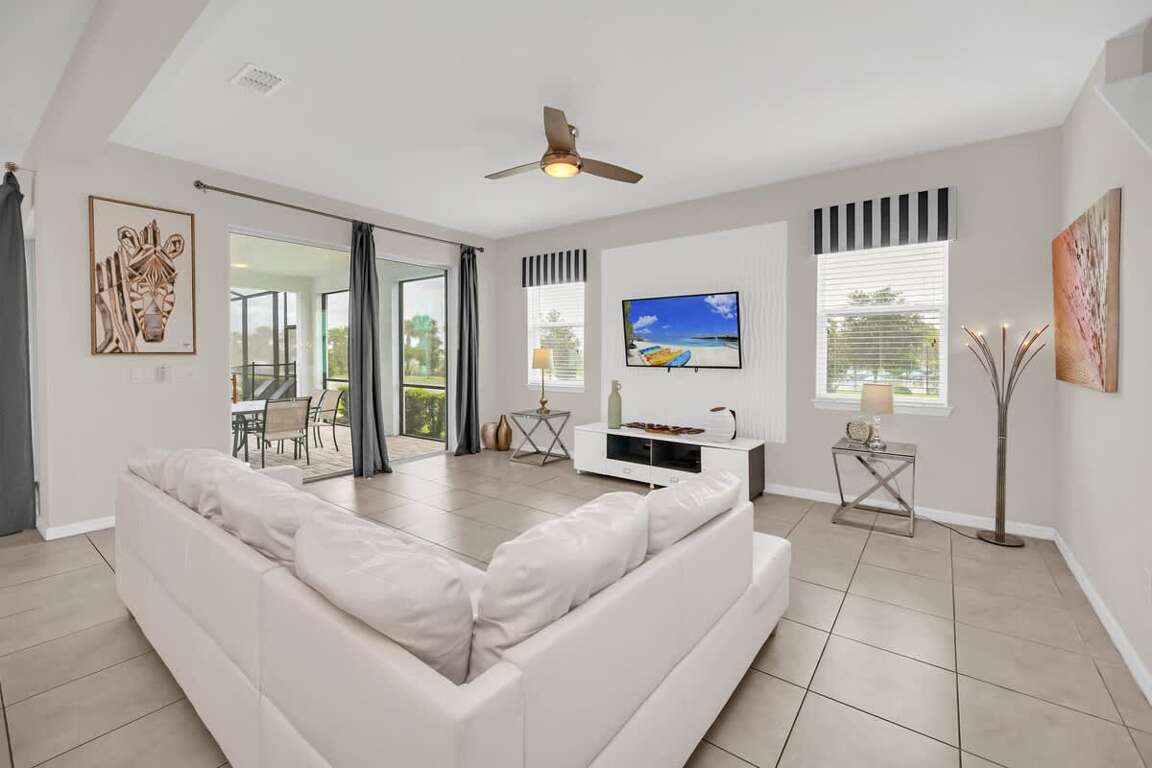 The amazing open gourmet kitchen and living room area are perfect for entertaining and making vacation memories. The fully-equipped kitchen boasts high-end appliances, ample counter space, and a large island, ideal for preparing meals and gathering with loved ones. The living room flows seamlessly into the pool area, creating an inviting space for relaxation and enjoyment.
