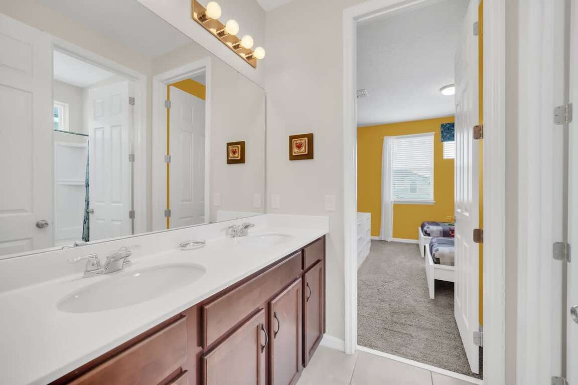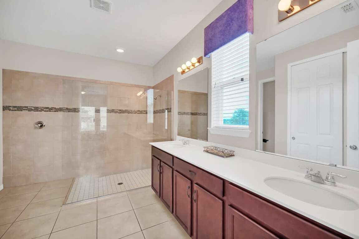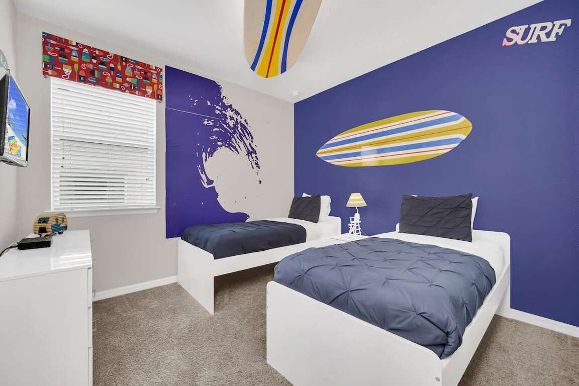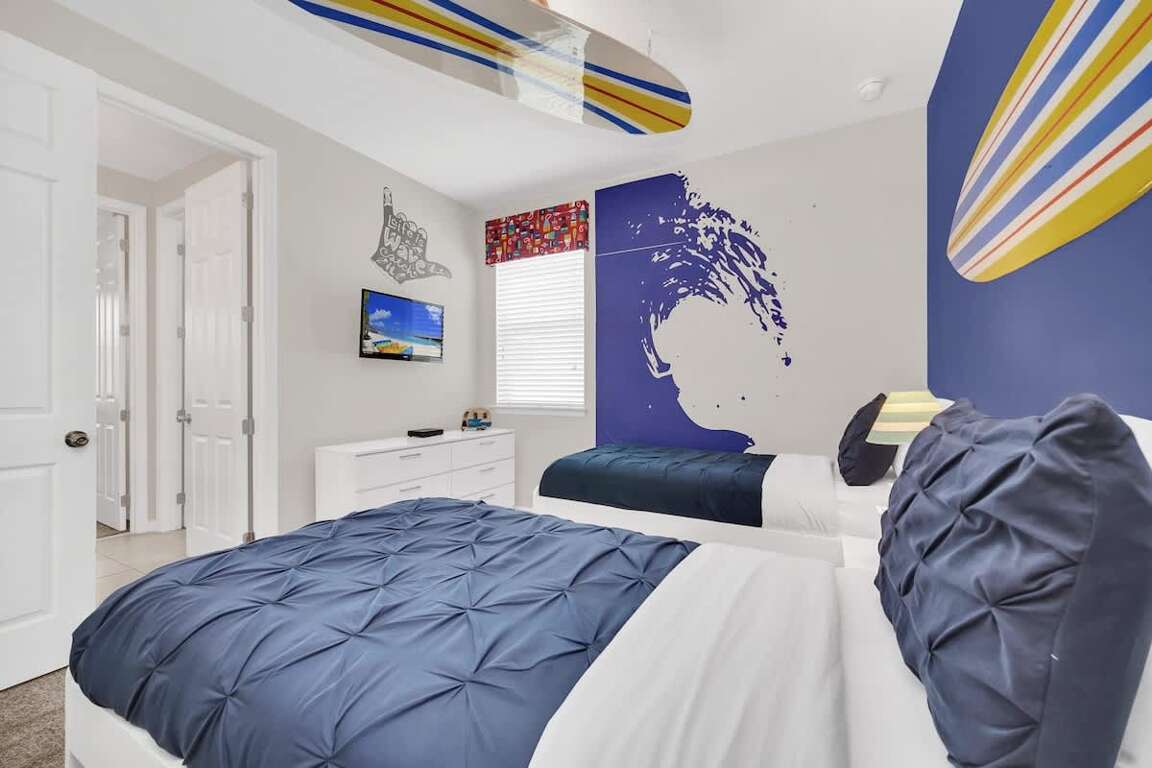 The master bedroom is conveniently located downstairs, boasting a luxurious king bed and a walk-in shower. Upstairs, you’ll find five additional bedrooms. Four of these feature whimsical themes and share two Jack and Jill bathrooms, providing a fun and practical setup for families. The final bedroom is another elegant king room with its own en suite bathroom, ensuring privacy and comfort.