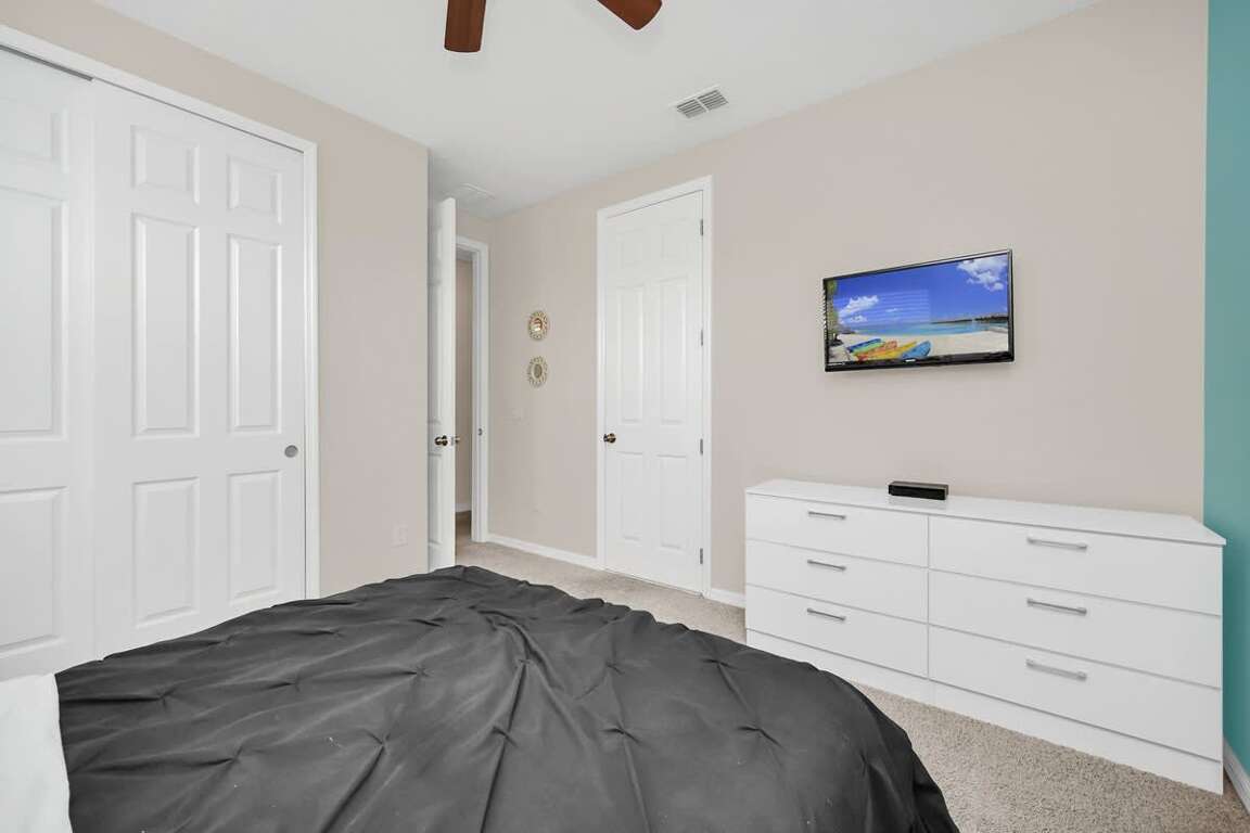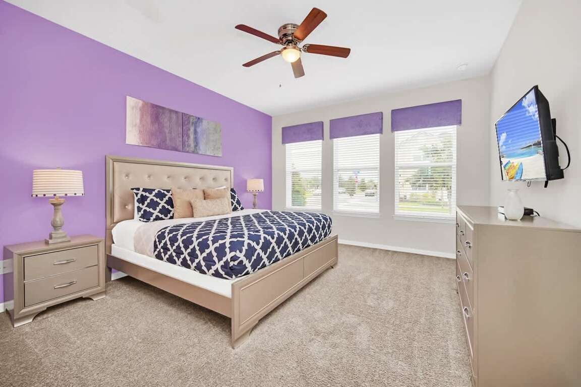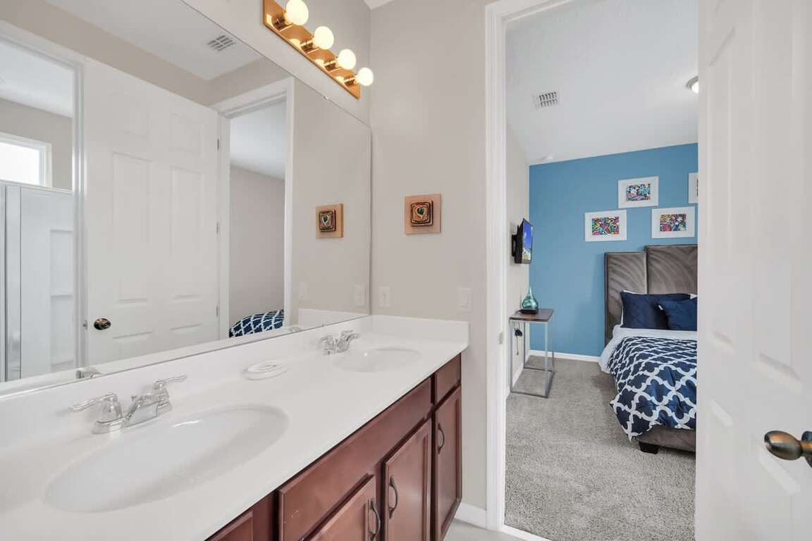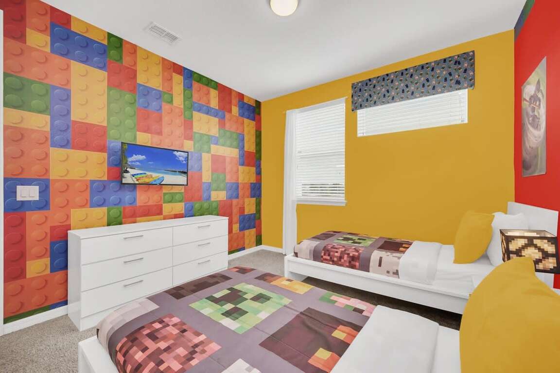 The master bedroom is conveniently located downstairs, boasting a luxurious king bed and a walk-in shower. Upstairs, you’ll find five additional bedrooms. Four of these feature whimsical themes and share two Jack and Jill bathrooms, providing a fun and practical setup for families. The final bedroom is another elegant king room with its own en suite bathroom, ensuring privacy and comfort.