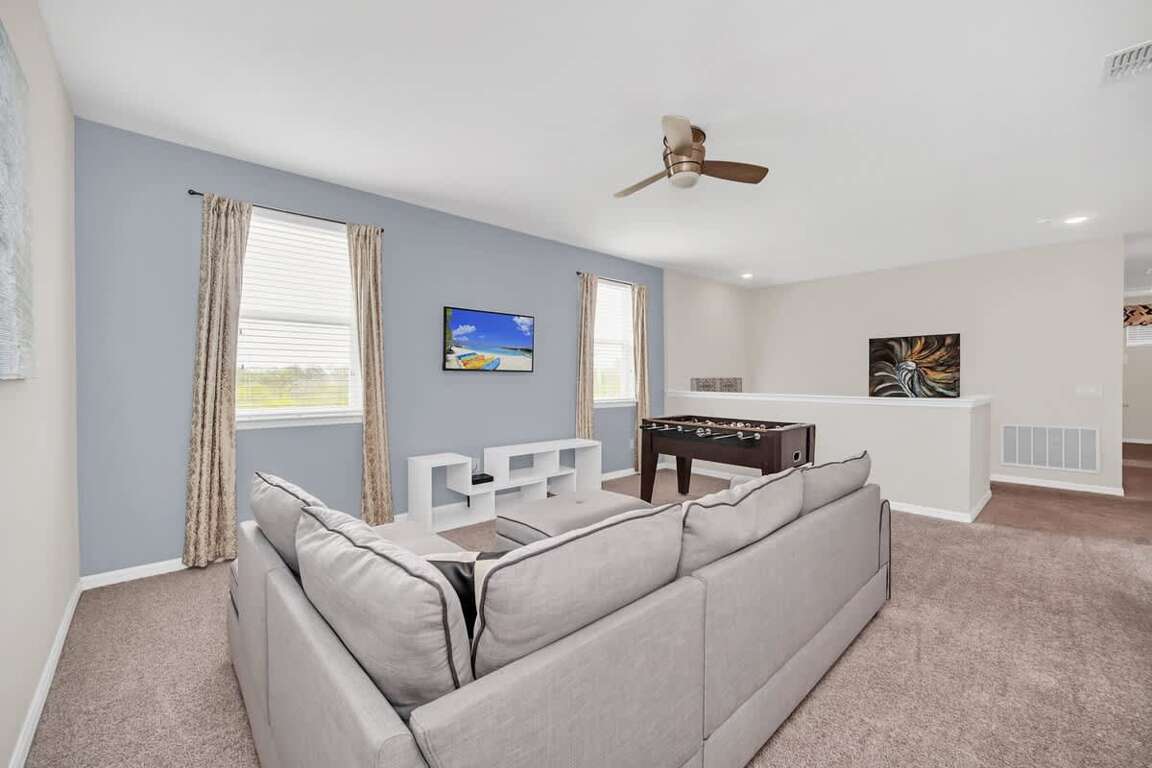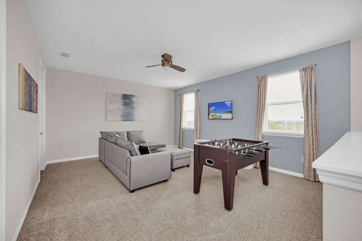 The spacious family gathering area and upstairs game room provide ample space for everyone to come together. Whether you’re engaging in friendly competition or sharing stories from the day, these areas are designed to foster connection and joy. The open floor plan ensures a seamless flow, enhancing the home’s welcoming atmosphere.