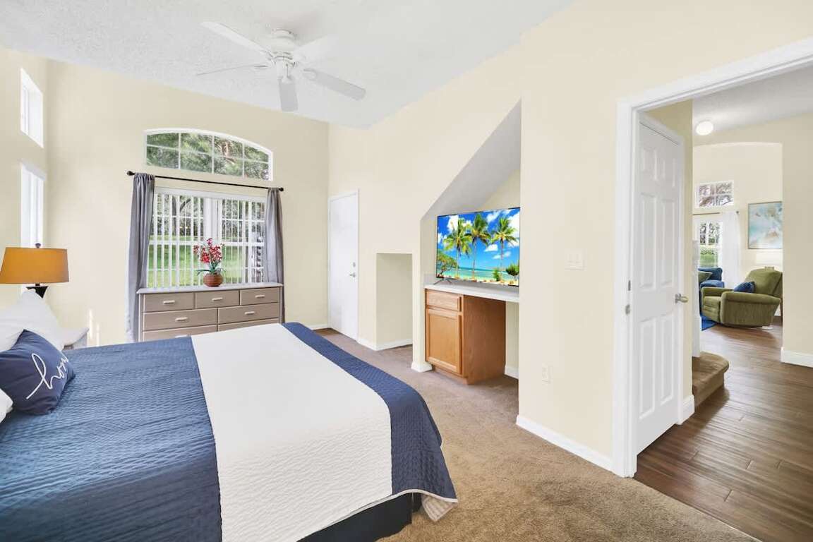 Inside, the townhome offers every modern amenity, including smart TVs in every room, ensuring a luxurious and comfortable stay. The main floor features a King-size master suite with an attached bathroom, a fully equipped kitchen, a spacious living room with a flat-screen TV, and a full-size washer and dryer. Upstairs, you'll find another master bedroom with a king bed and private en-suite, along with additional beautifully appointed guest rooms. Step outside, and you're right next to the clubhouse and resort amenities, making it easy to indulge in everything Emerald Island has to offer without the need for a walk.