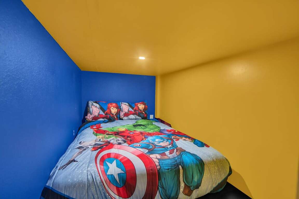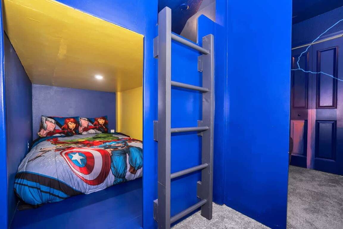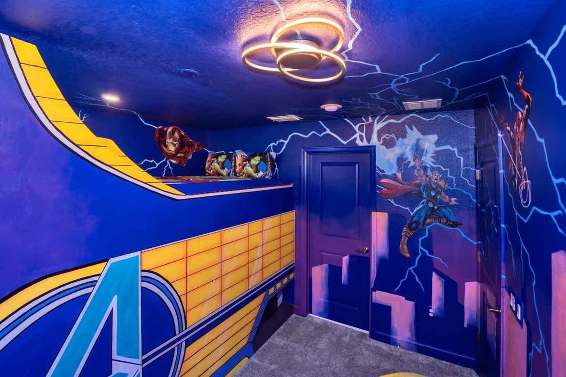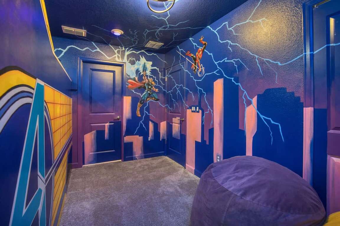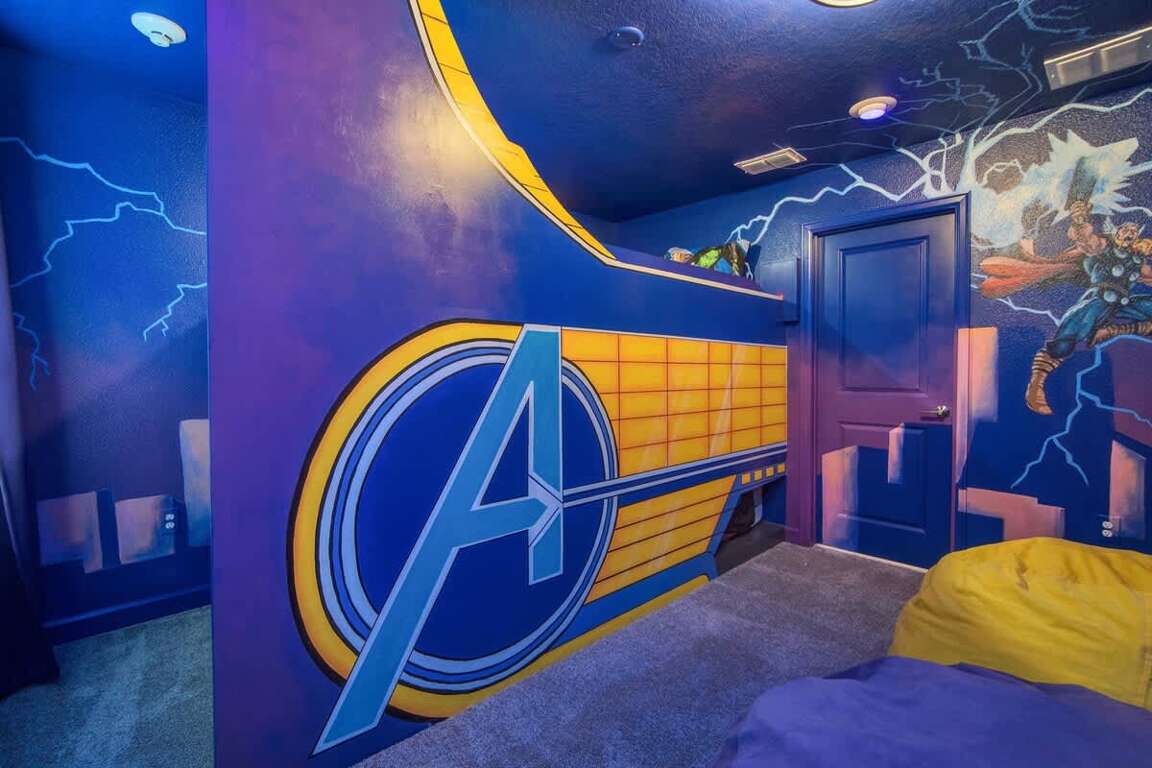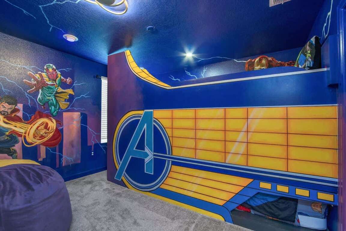 It’s hard to find a better property when it comes to luxurious Orlando vacation rentals than this. Inside, you’ll find a huge kitchen where you can cook your meals or enjoy a late-night snack. You’ve also got a spacious living room to enjoy a movie night with your family once you’re done at the parks for the day. Best of all, everyone can watch what they want, since each bedroom has its own TV. Or just head to your kids to their very own themed room featuring Harry Potter, Avengers and Frozen! Get competitive in the game room or head out back to enjoy your very own covered pool and the private family BBQ grill next to the pool (propane refill are covered by the guest). Pool heat can be added for $30 a day plus taxes for the duration of your vacation!