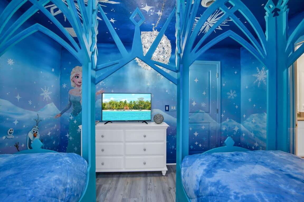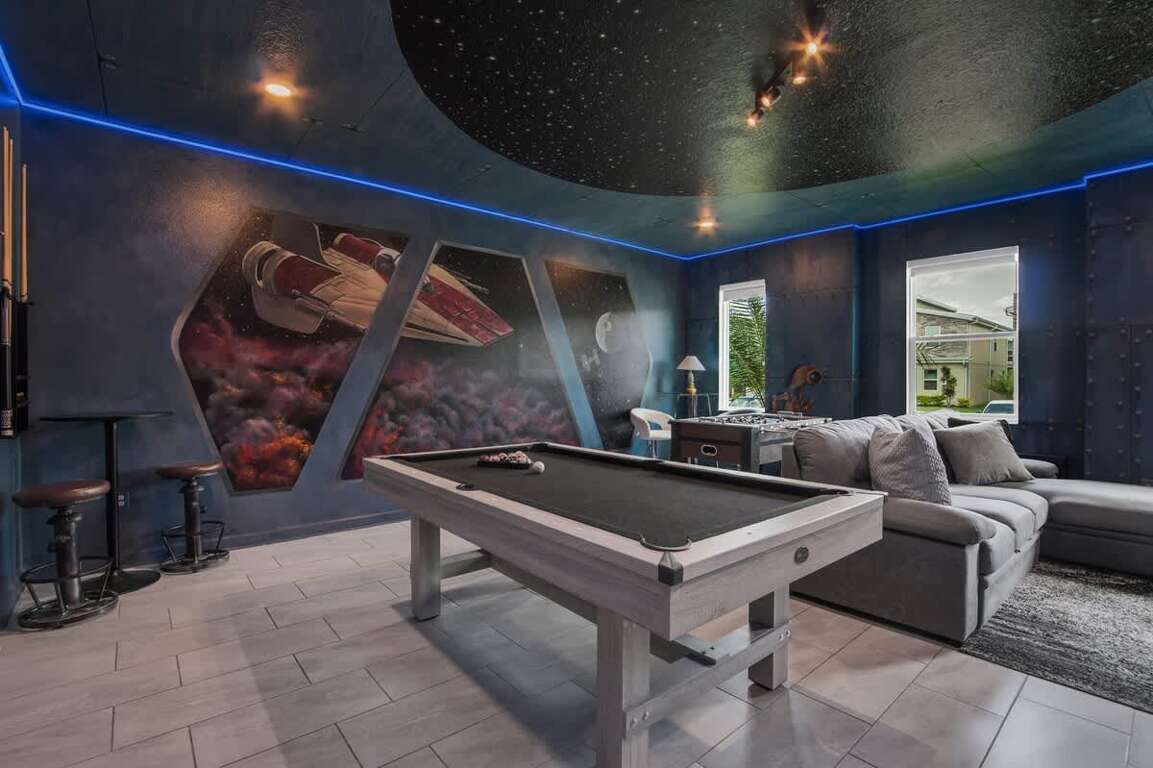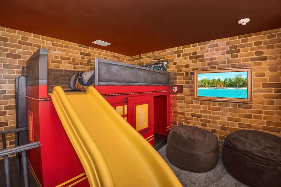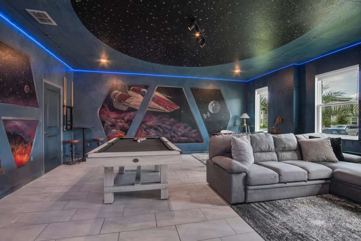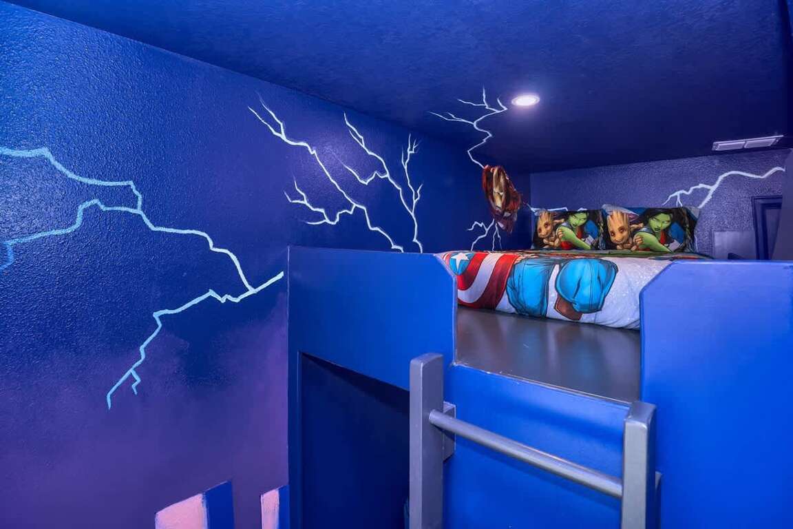 It’s hard to find a better property when it comes to luxurious Orlando vacation rentals than this. Inside, you’ll find a huge kitchen where you can cook your meals or enjoy a late-night snack. You’ve also got a spacious living room to enjoy a movie night with your family once you’re done at the parks for the day. Best of all, everyone can watch what they want, since each bedroom has its own TV. Or just head to your kids to their very own themed room featuring Harry Potter, Avengers and Frozen! Get competitive in the game room or head out back to enjoy your very own covered pool and the private family BBQ grill next to the pool (propane refill are covered by the guest). Pool heat can be added for $30 a day plus taxes for the duration of your vacation!