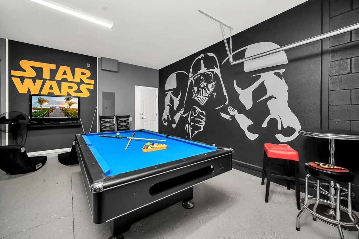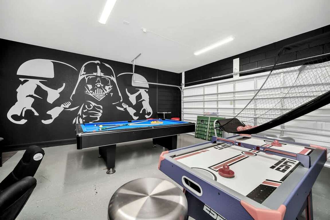 This massive home has enough room for up to 14 people to relax and unwind. Everyone can pick out their bedroom and watch whatever they want to since each bedroom has its TV! Kids and adults alike are sure to enjoy the upscale game room in the garage, featuring a pool table, air hockey table, and basketball game. You'll also find convenient amenities like high-speed Wi-Fi, a full-sized washer and dryer, and a fully equipped kitchen.