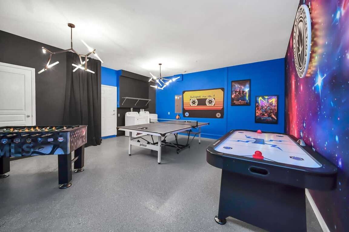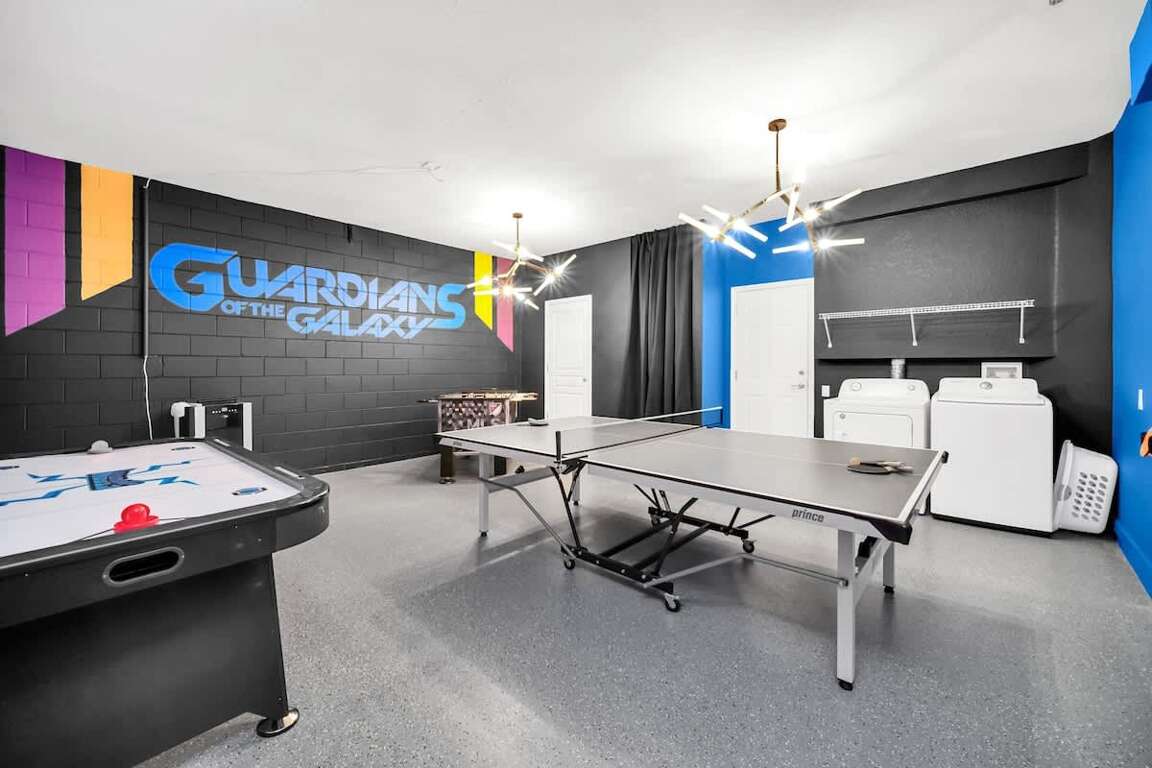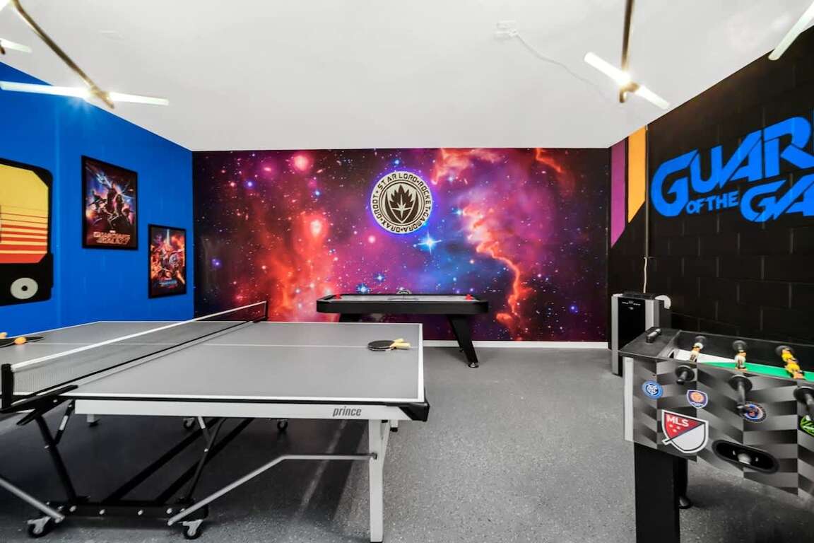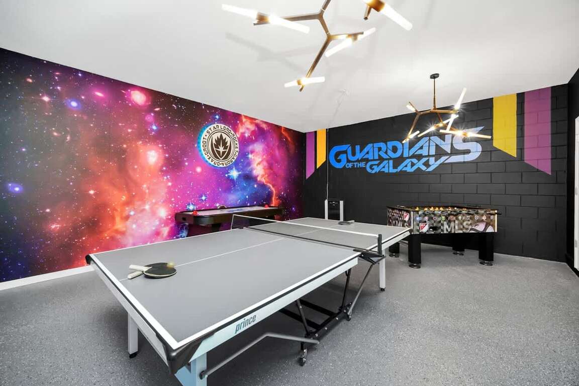Fully converted game room with a Guardians of the Galaxy theme and AC for the ultimate fun experience.
