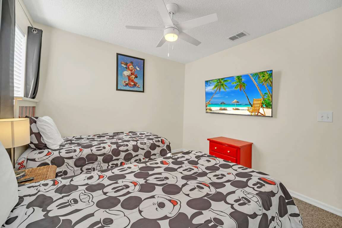The home layout provides plenty of space for large families or groups. Downstairs features a king-size bedroom with a private master bathroom. Upstairs, you’ll find another king-size bedroom with an en-suite bathroom, two queen bedrooms, and a Mickey-themed room with two twin beds—perfect for the little ones or Disney fans.