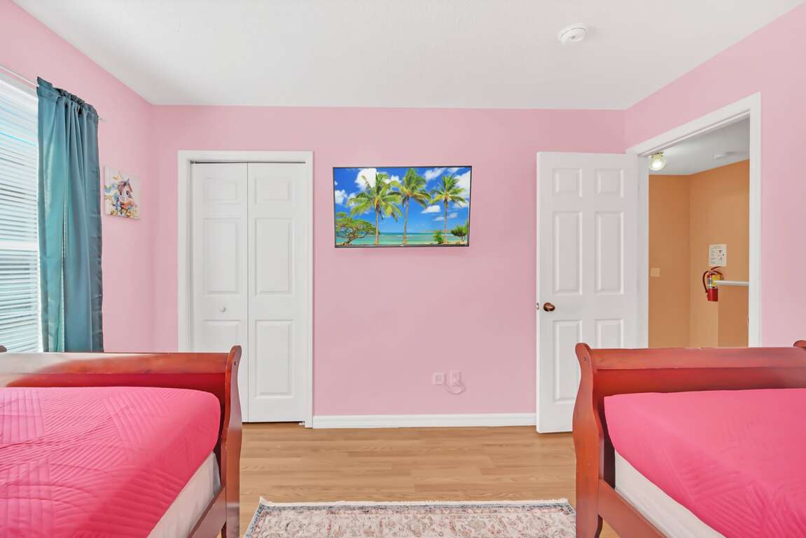 Designed for both relaxation and togetherness, this home features a spacious and inviting open floor plan, allowing the entire family to gather and create lasting memories. The main-floor master suite offers a private oasis with a luxurious king bed, while two additional queen bedrooms provide elegant comfort. For the younger travelers, two thoughtfully designed children’s rooms include a charming pink-themed room with twin beds and another featuring a bunk bed and an additional twin, perfect for siblings or friends to share.