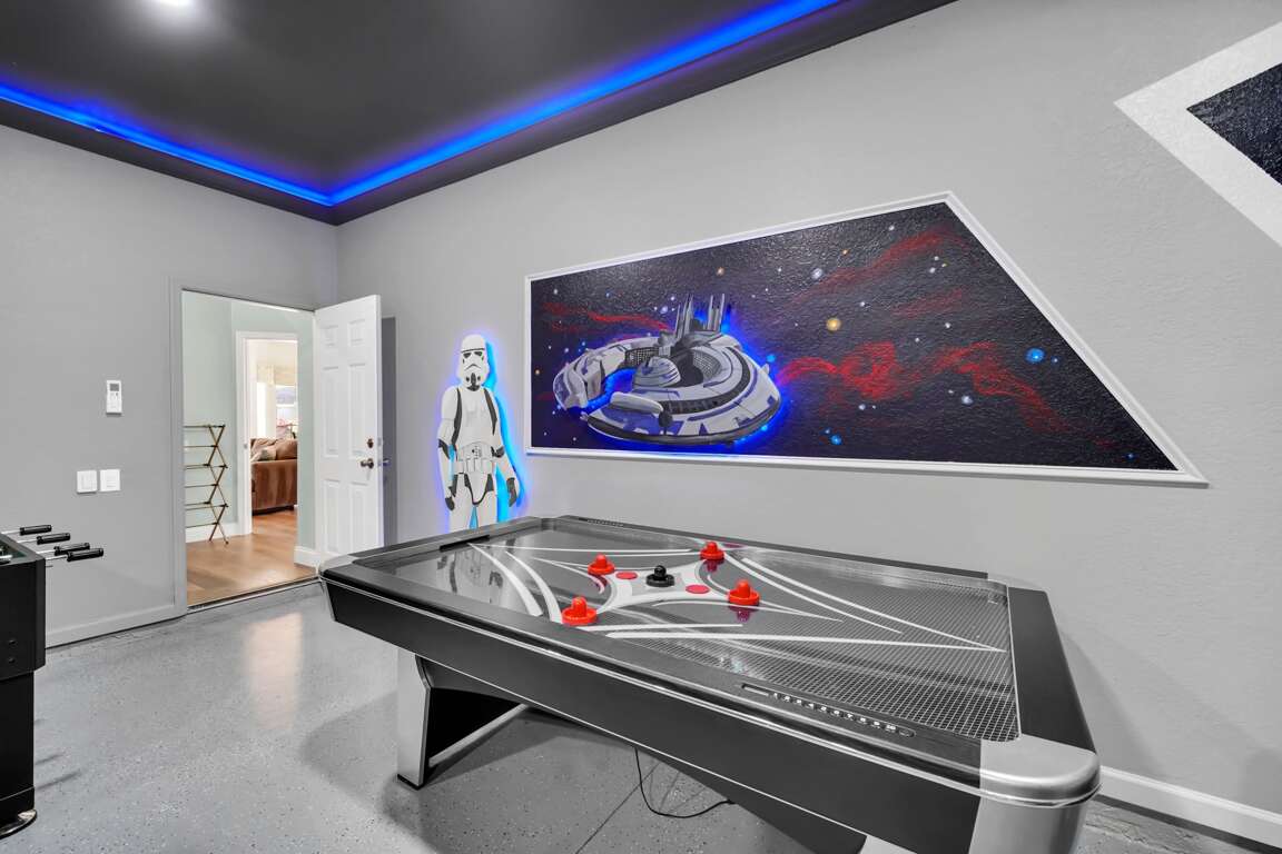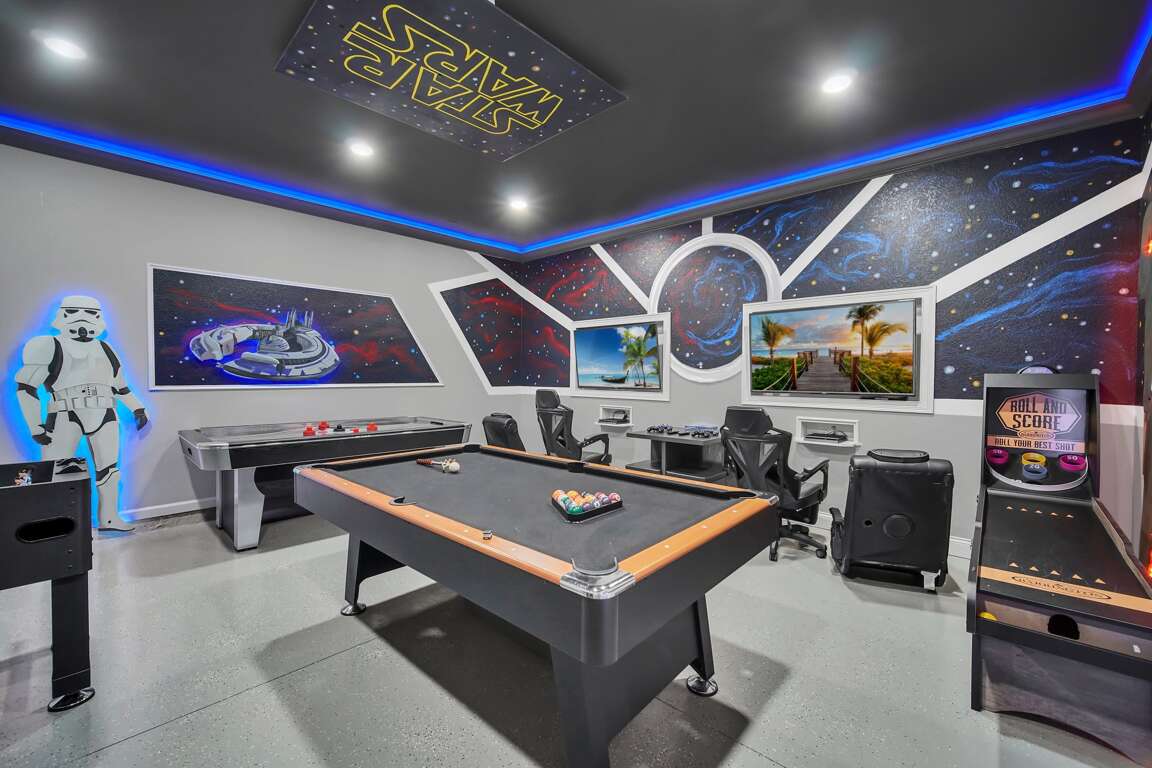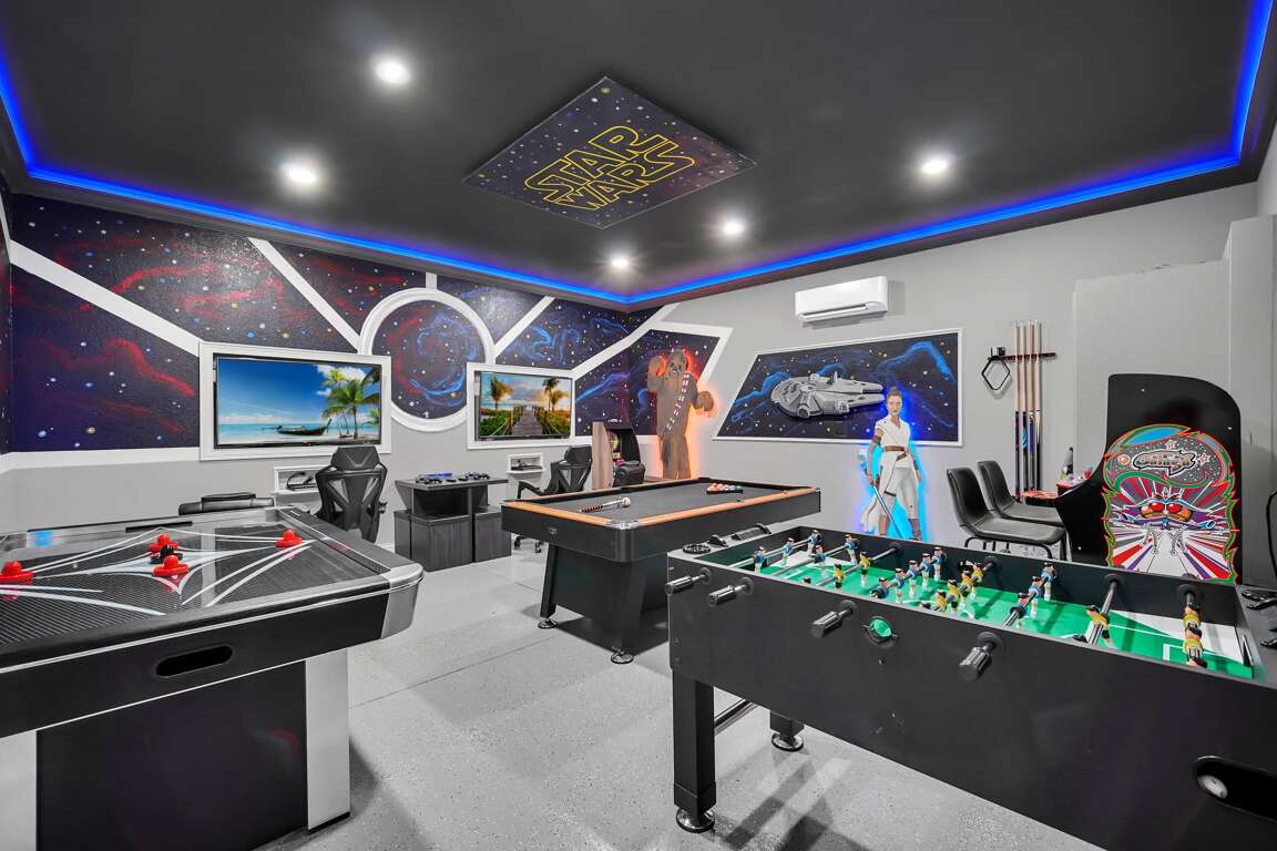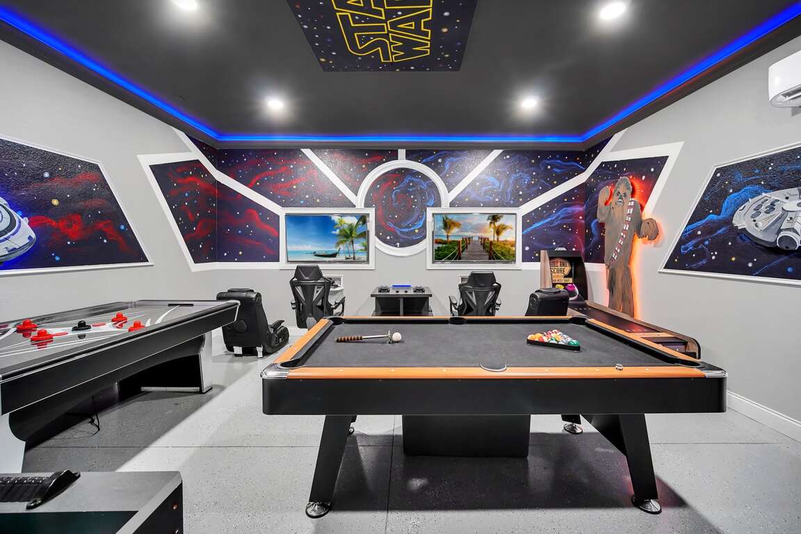 The custom-designed Star Wars-themed game room offers the ultimate entertainment experience. The space includes a pool table, air hockey, foosball table, arcade machine, and two PlayStation 4 consoles. Epoxy flooring and a mini-split AC unit ensure a comfortable and sleek atmosphere for hours of fun.