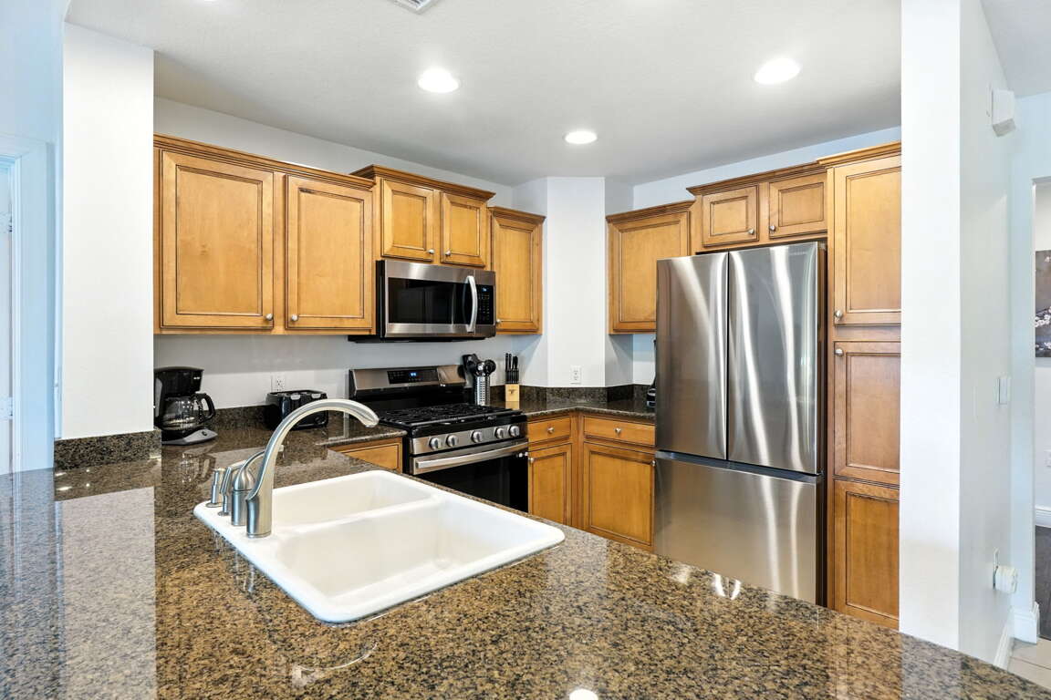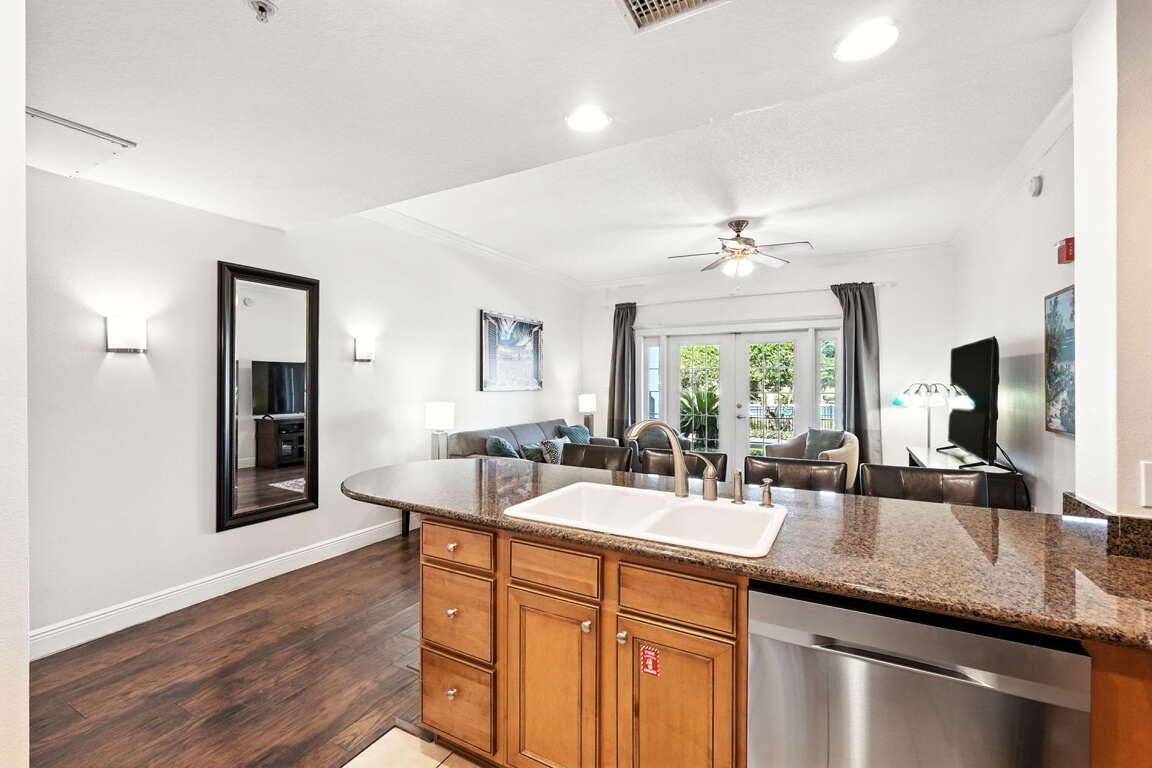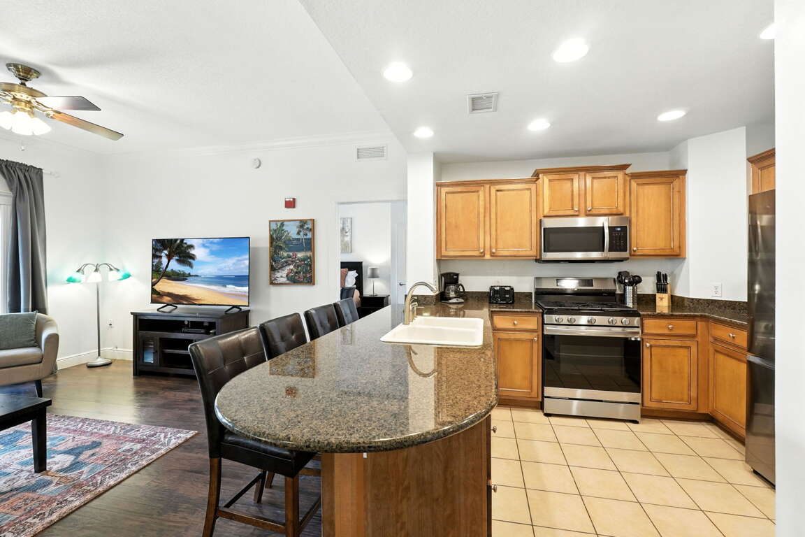 Inside, the open living area makes it easy for everyone to be together — whether it’s sharing breakfast before heading to Disney, playing games at the dining table, or watching a movie after a big day of rides and fireworks. The fully equipped kitchen has everything you need for family meals, snacks, or quick lunches between adventures.