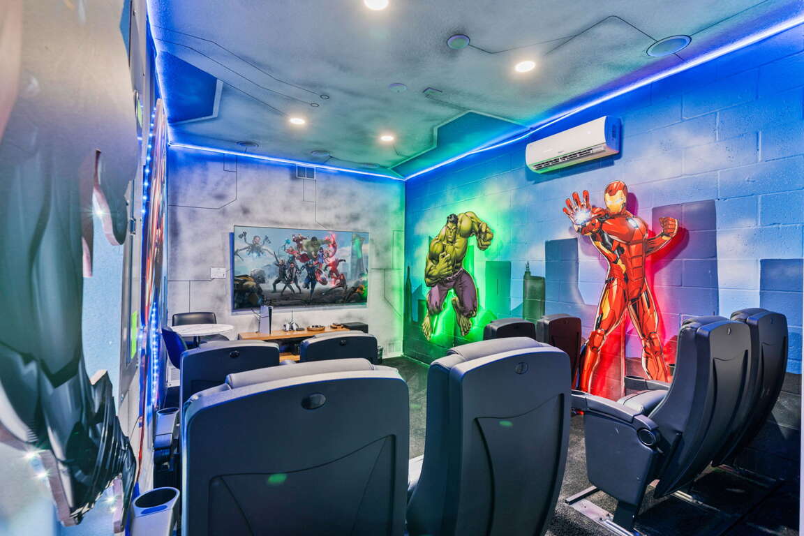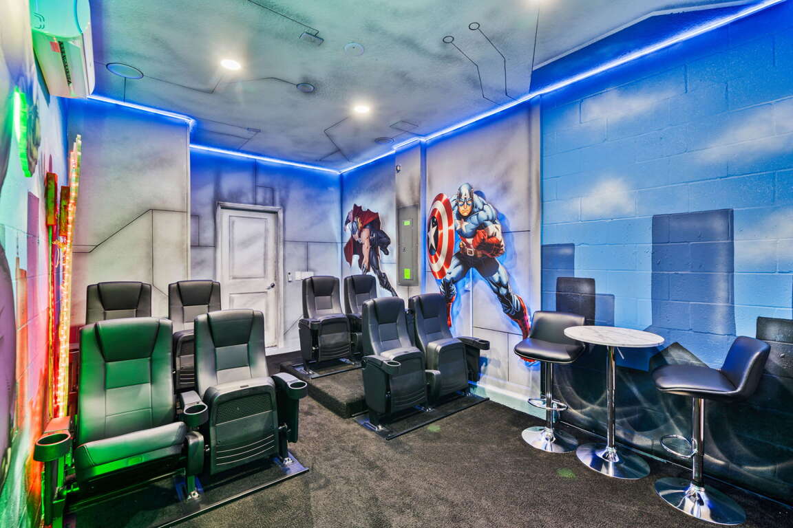 Entertainment is certainly one of the main focus points of Potter's Retreat! Upstairs, an open loft doubles as a game room, complete with dual gaming consoles (PlayStation 5 and X Box S), air hockey, and a retro arcade game that sparks a little friendly competition. Downstairs, movie lovers will discover their own hideaway in the superhero-themed theater, where rows of reclining chairs face a massive screen—perfect for late-night marathons and popcorn-fueled gatherings. The movie room is also great for getting together in harmony, as the family competes in friendly Karaoke competition on the built in karaoke machine. Gamers will also enjoy the action with another PlayStation 5 available in the theater for guests to use.