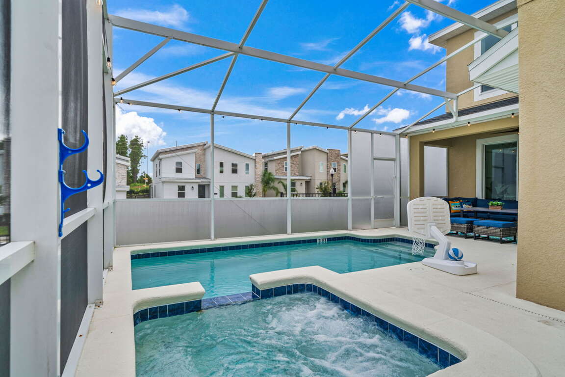 Outside, your private oasis awaits. The screened-in pool shimmers in the Florida sun, and the spillover spa promises to melt away the day’s energy. Lounge chairs line the deck for long afternoons by the water, while a shaded dining area invites everyone to gather over grilled meals and sunset conversations.