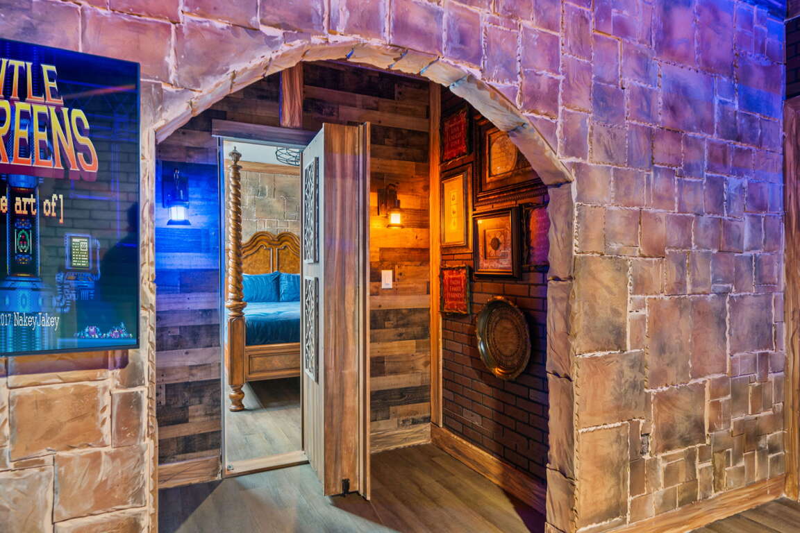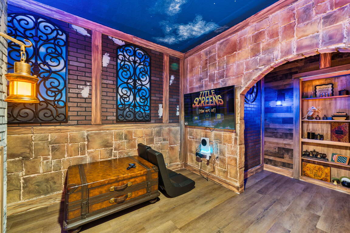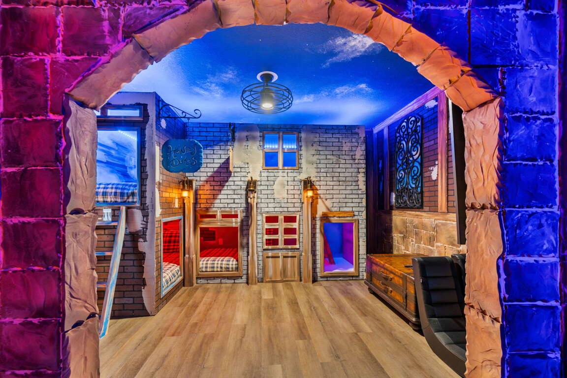 Downstairs, two spacious king suites on the main floor offer quiet comfort and easy access, while upstairs is where the fun truly unfolds. The themed bunk room upstairs is a dream for younger guests. Custom-built bunks, each with its own glow and character, line the walls like a secret wizarding clubhouse. With shelves for books and treasures, a huge smart TV, and an Xbox S, it’s a space that feels made just for them—a place where they can stay up too late laughing and swapping stories. For parents looking to remain close enough, a secret doorway leads from the custom bunk room to a queen bedroom, assuring that the comfort and safety is close by. Across the loft, guests will enjoy relaxing in an additional king master bedroom in the back of the home.