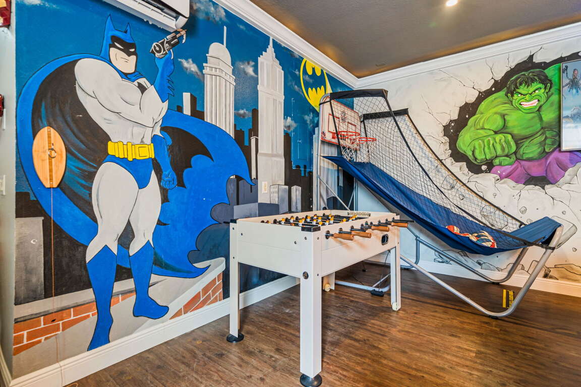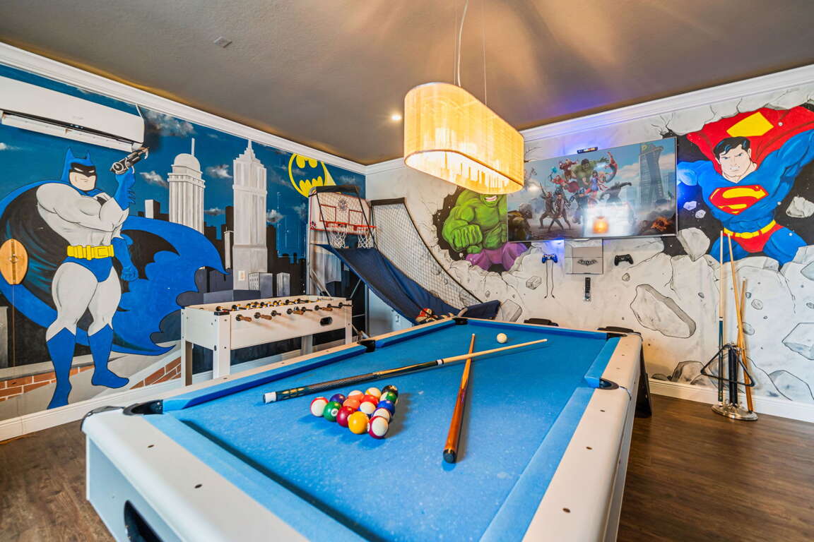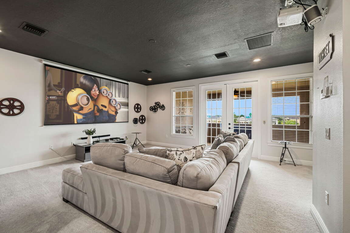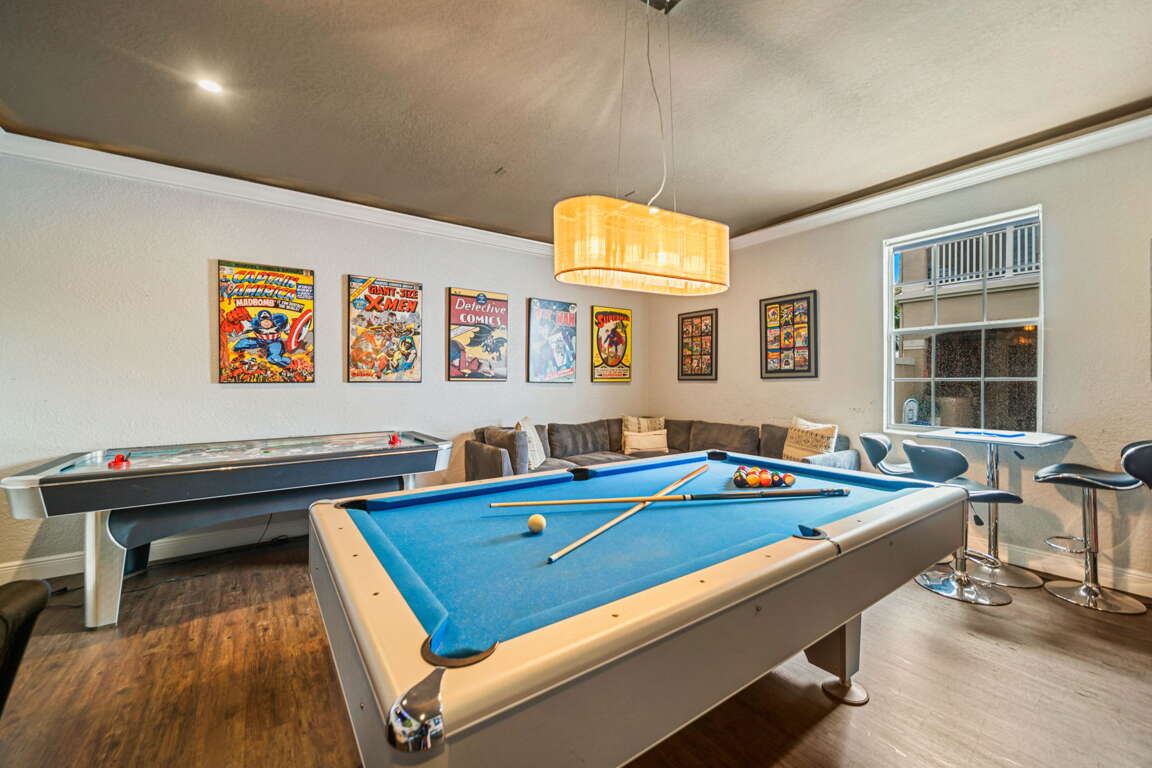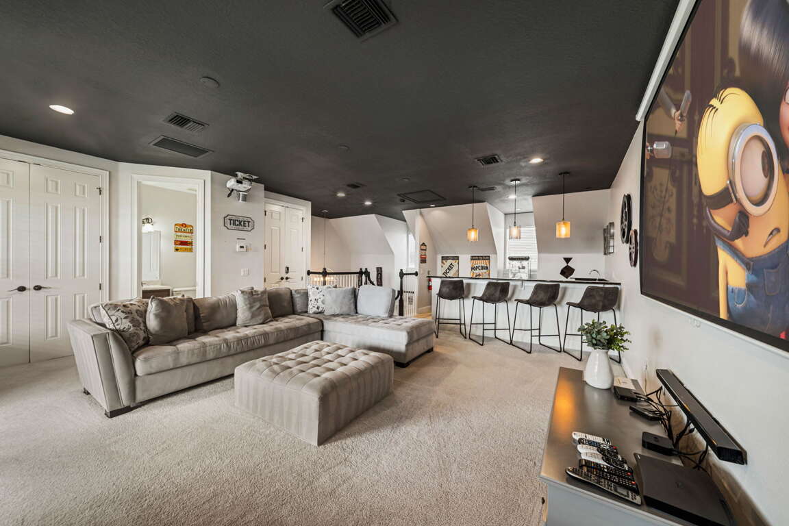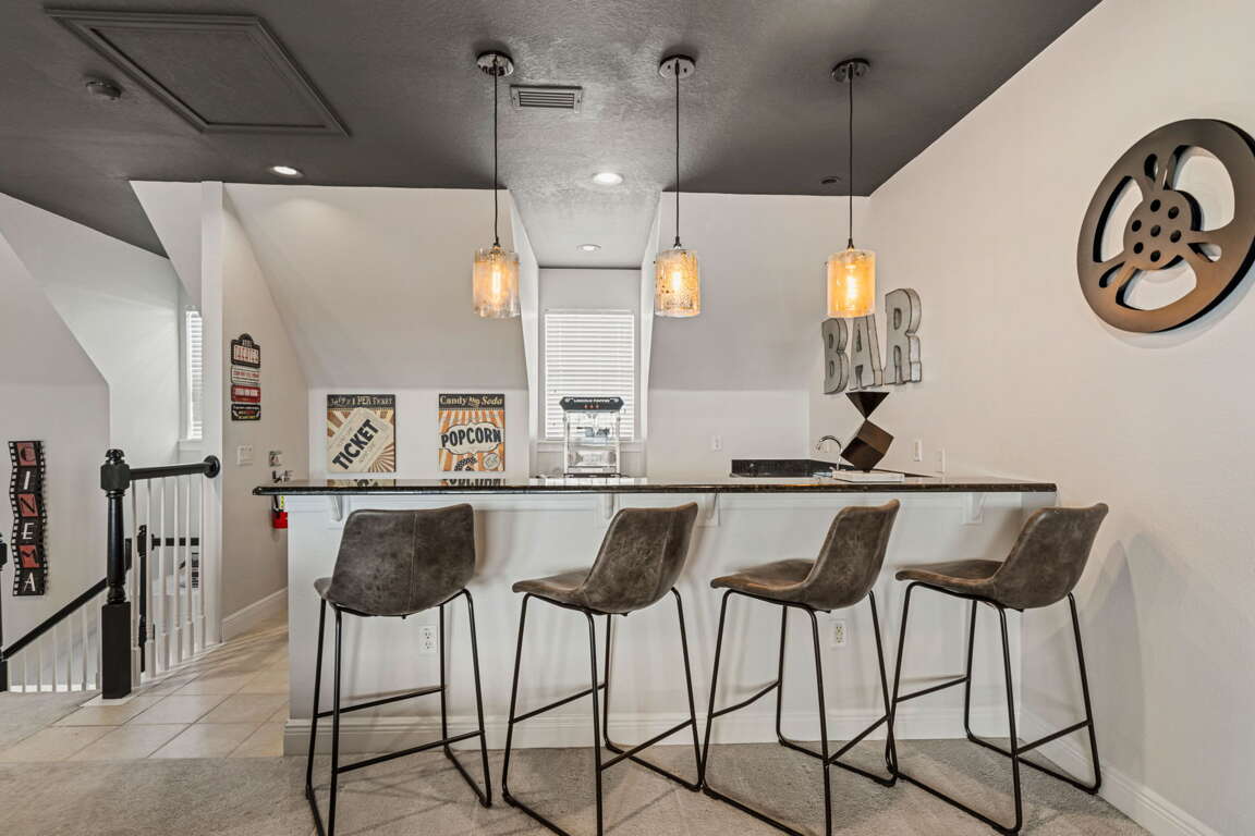 Entertainment comes naturally here. The vibrant game room is a hub of laughter and friendly competition, featuring a pool table, air hockey, Captain America and Legends arcade games, and a basketball hoop challenge that keeps everyone entertained late into the night. Upstairs, the third floor transforms into your own private cinema. Plush recliners, soft lighting, and a half bath set the scene for movie nights, while the balcony offers fresh air and starlit views once the credits roll.