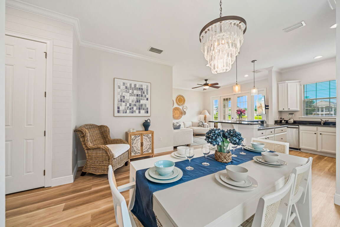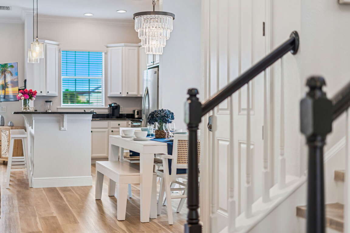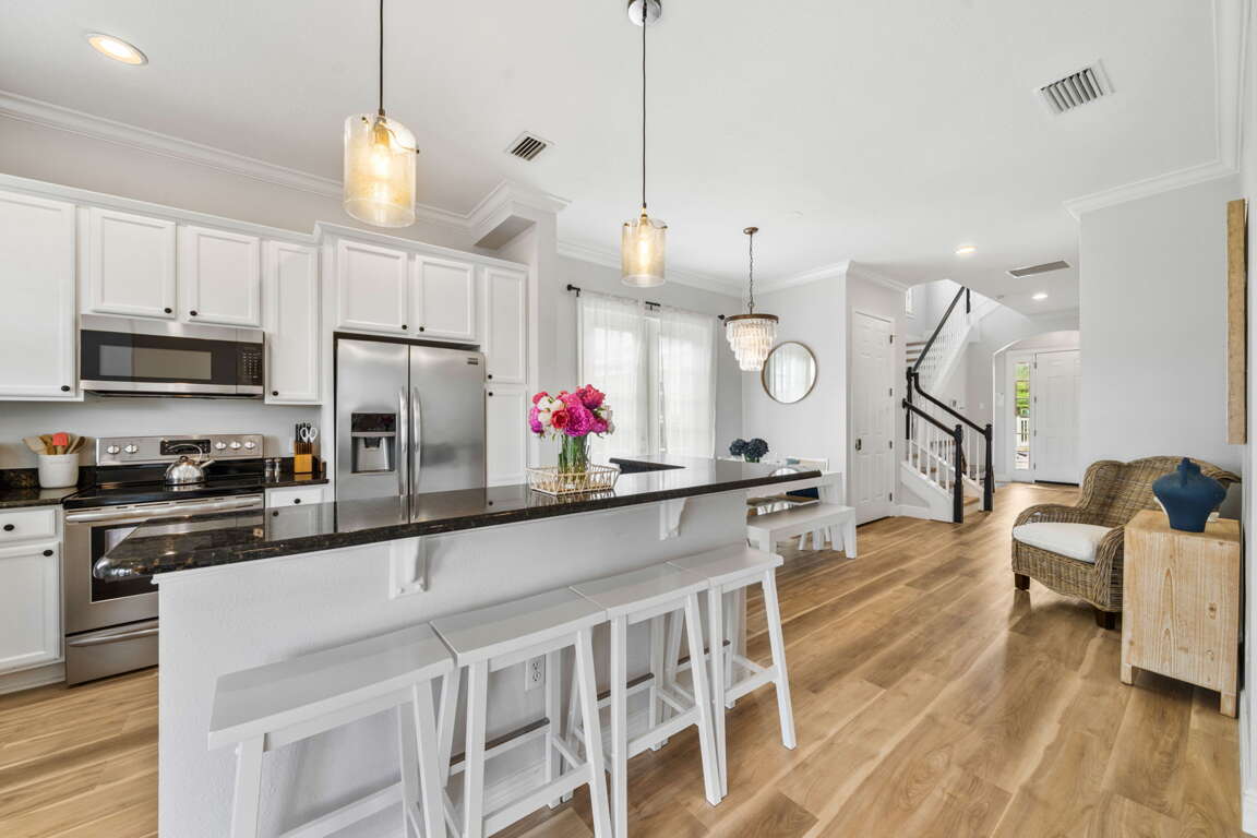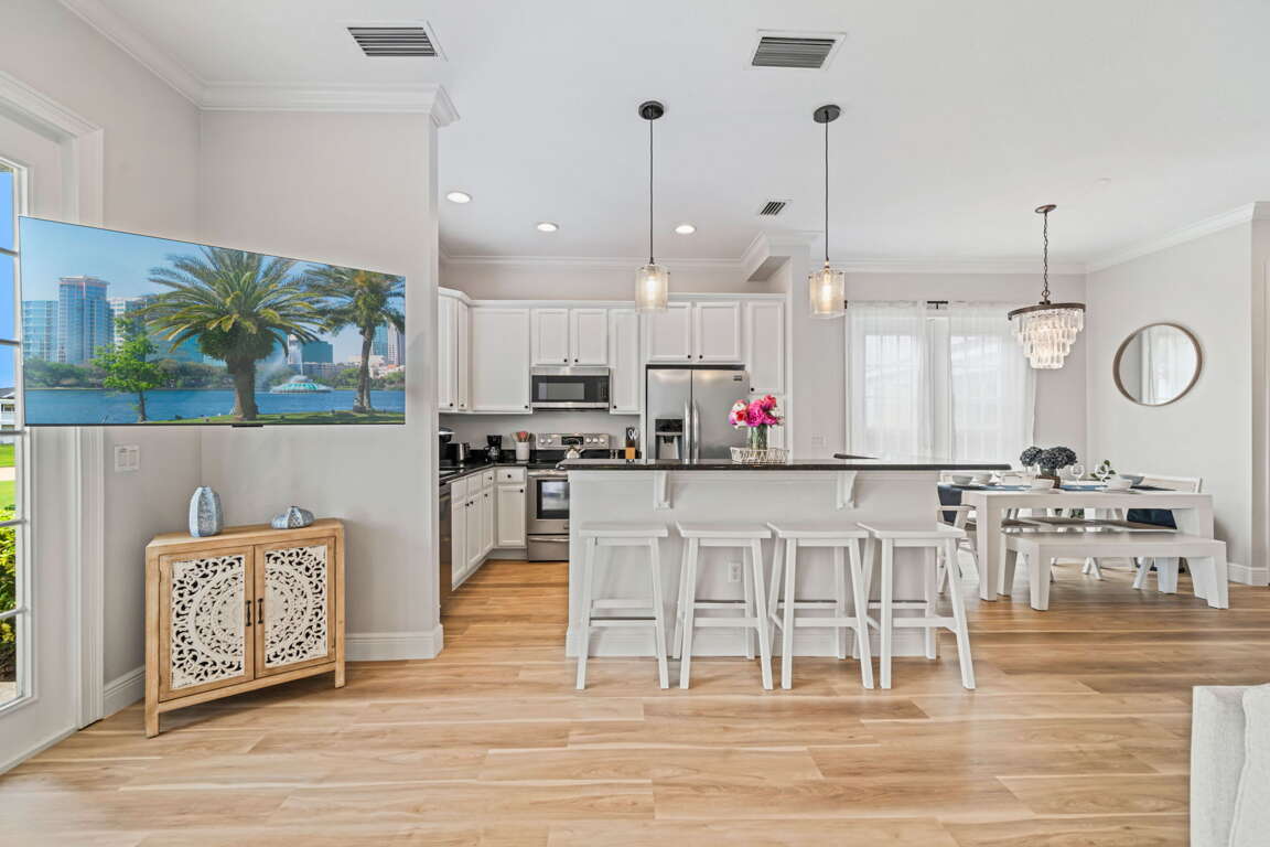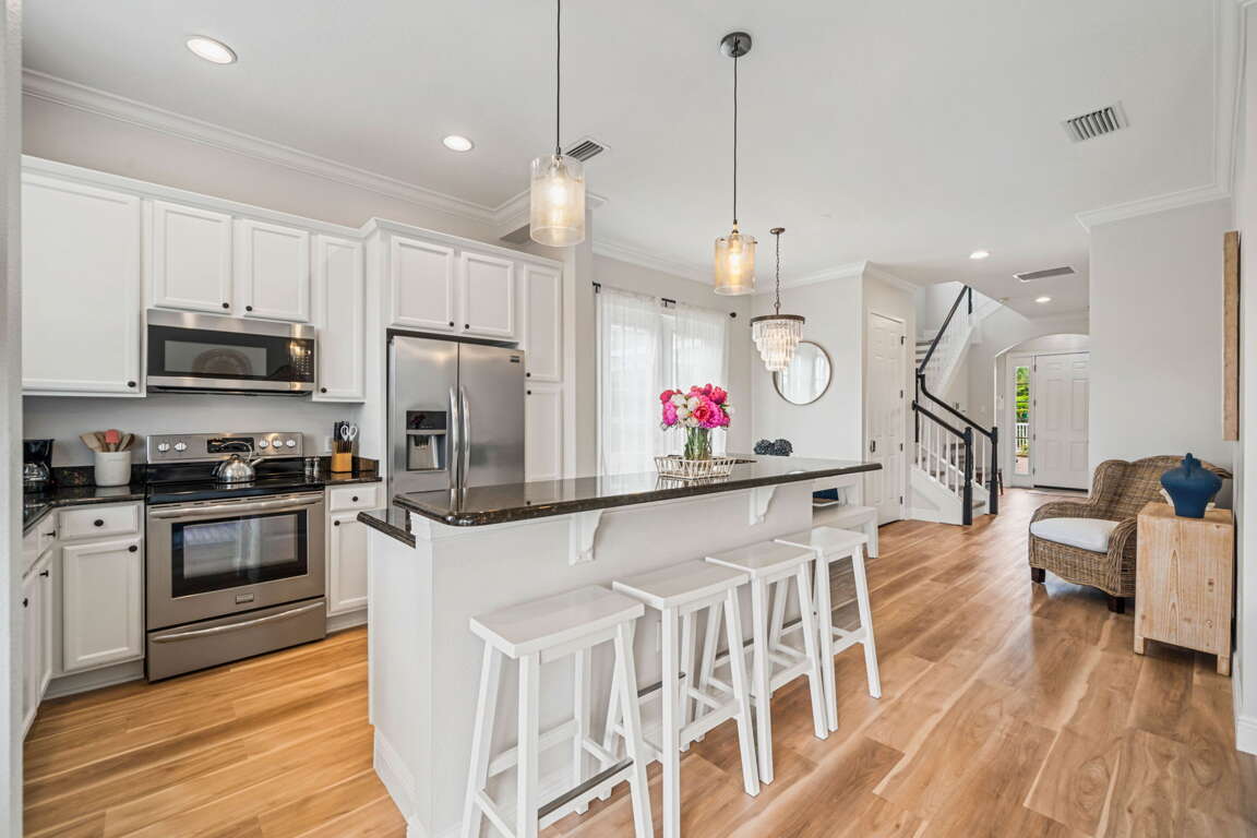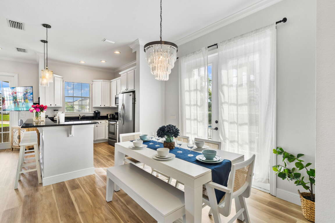 Step through the doors and into an open, sun-filled living space where style meets warmth. The dining area, perfect for family breakfasts or evening gatherings, blends seamlessly into the fully equipped kitchen. Stainless steel appliances, sleek countertops, and a spacious island invite you to linger over morning coffee or share stories while dinner simmers on the stove.