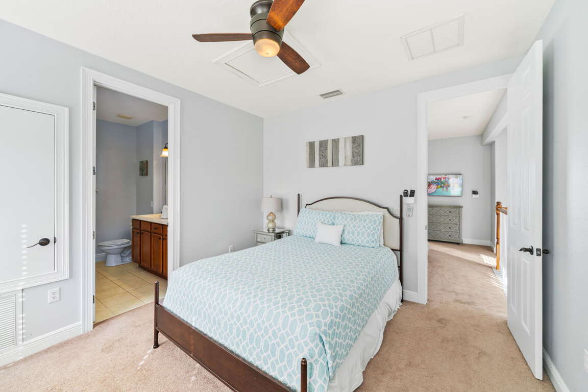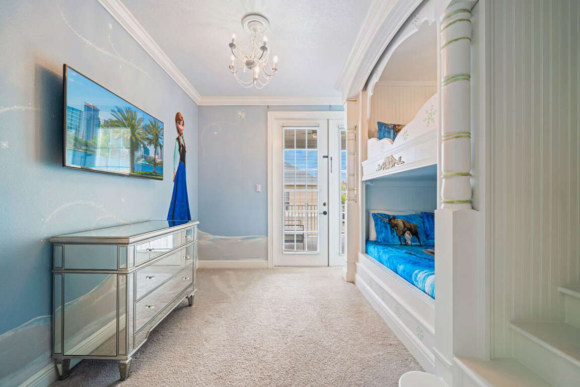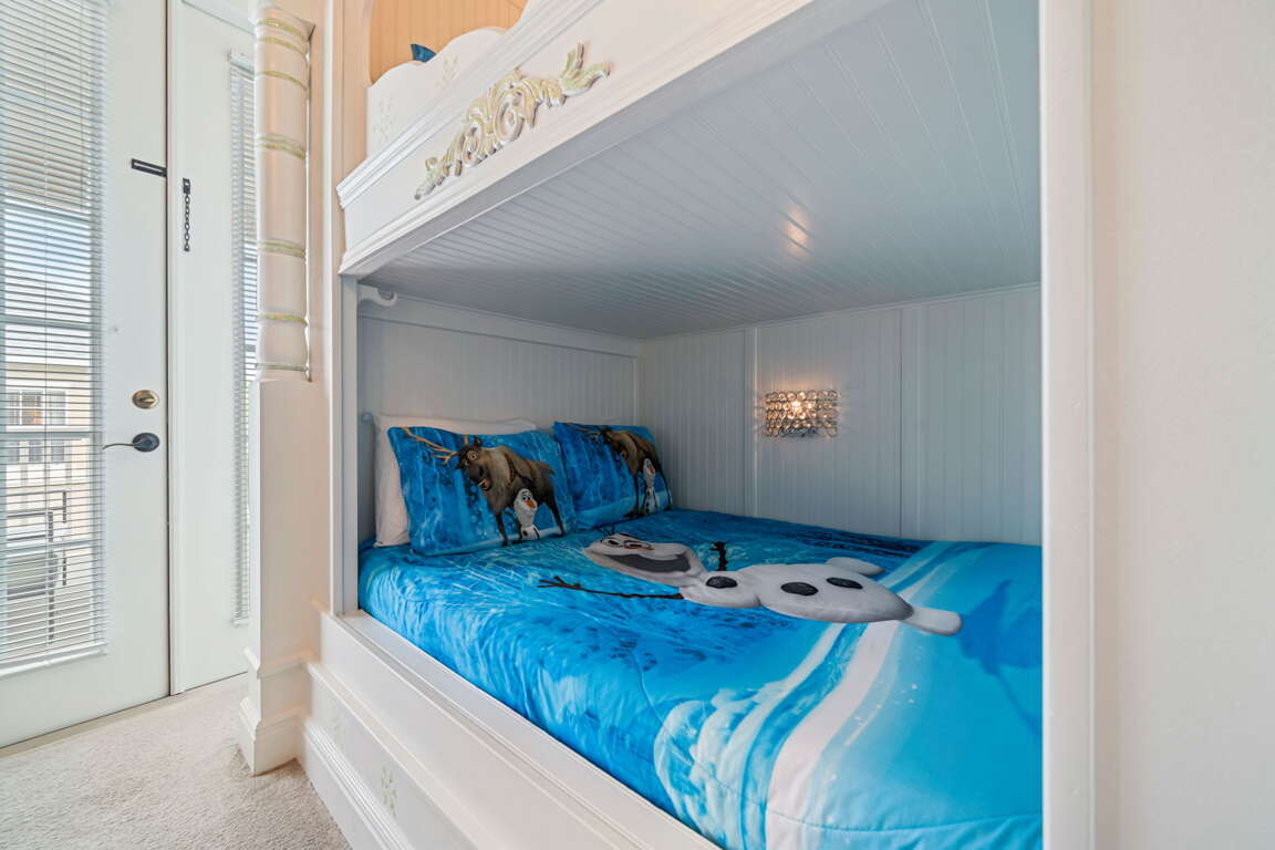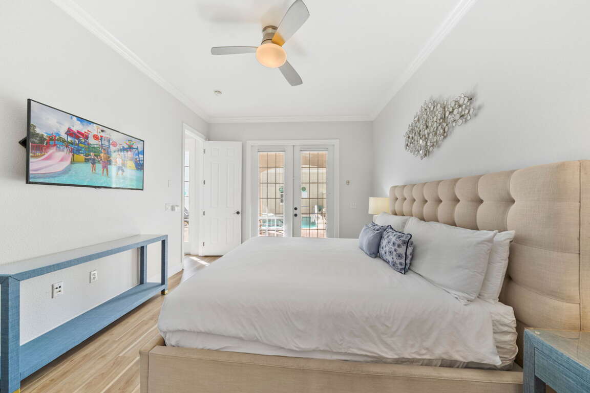 Inside, every bedroom has been thoughtfully designed to offer comfort and tranquility. The first-floor primary suite serves as a serene escape with a king bed, television, and spa-inspired bathroom featuring dual sinks, a soaking tub, and a walk-in shower. Upstairs, a second king suite offers its own private bath, while two cozy bunk rooms, each with televisions, create the perfect hideaway for kids or friends. Another king bedroom with an ensuite bath adds space and privacy.