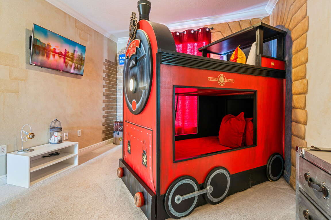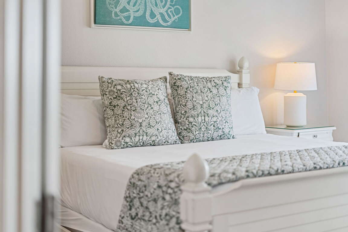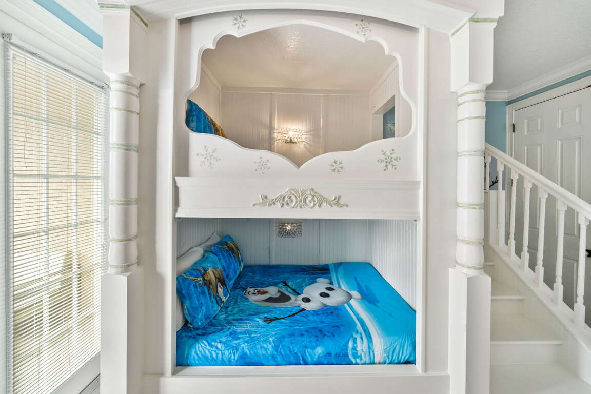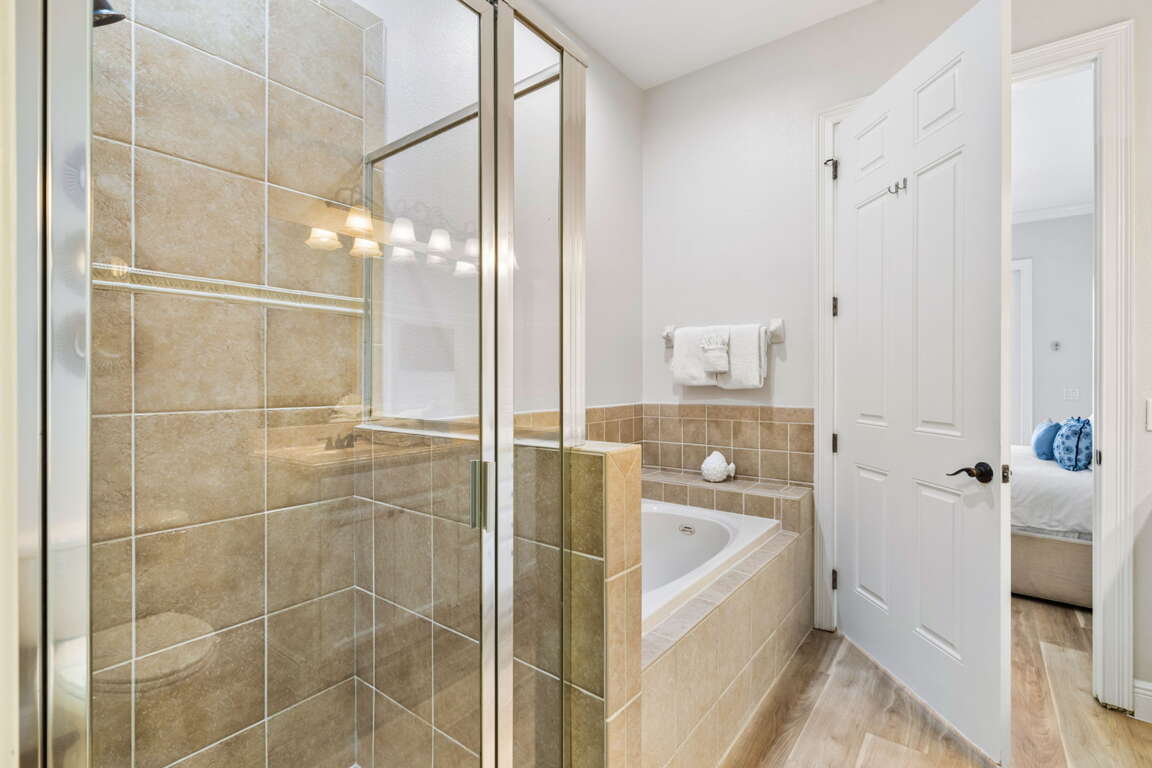 Inside, every bedroom has been thoughtfully designed to offer comfort and tranquility. The first-floor primary suite serves as a serene escape with a king bed, television, and spa-inspired bathroom featuring dual sinks, a soaking tub, and a walk-in shower. Upstairs, a second king suite offers its own private bath, while two cozy bunk rooms, each with televisions, create the perfect hideaway for kids or friends. Another king bedroom with an ensuite bath adds space and privacy.