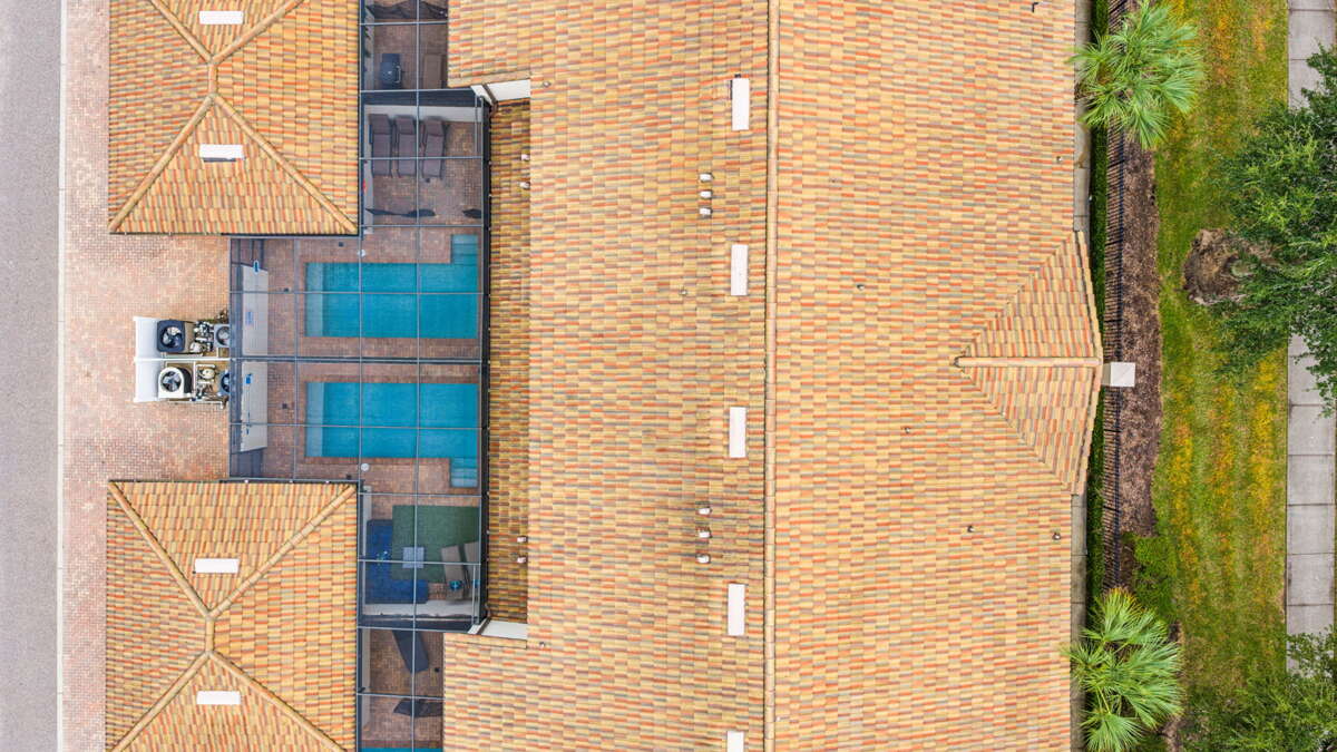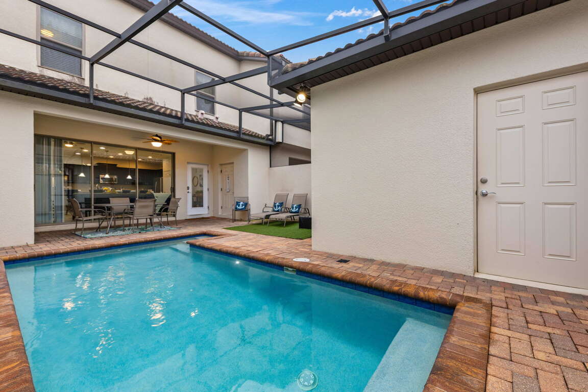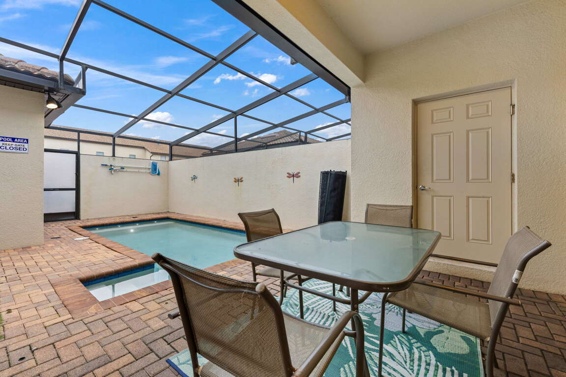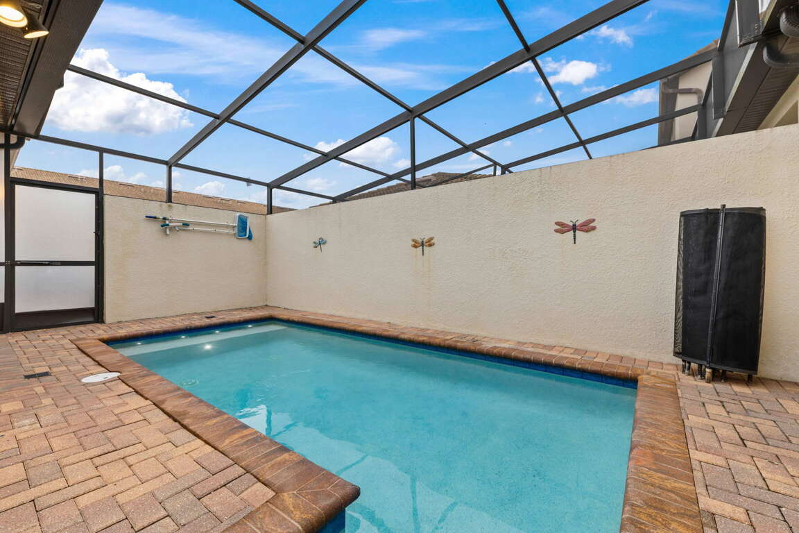 Through sliding glass doors, you’ll find your private oasis: a covered lanai overlooking a heated splash pool, all screened for comfort and surrounded by paver decking. Whether you’re cooling off in the water or enjoying dinner al fresco, this space invites relaxation.