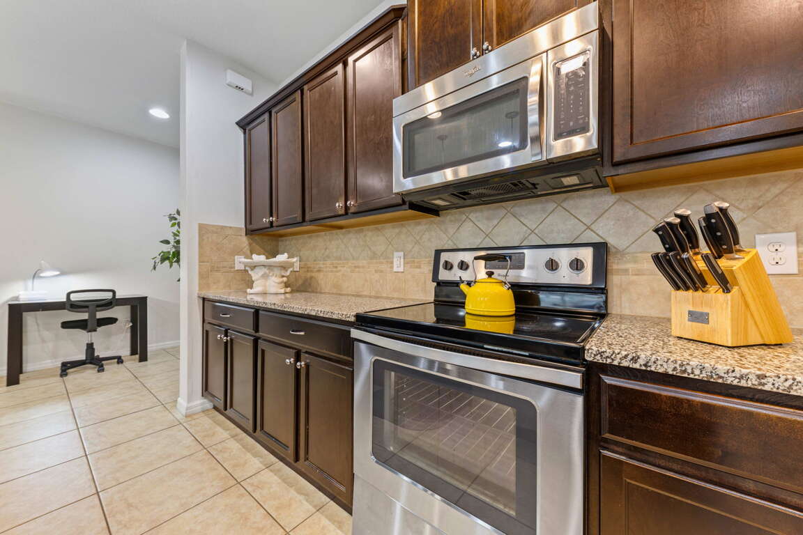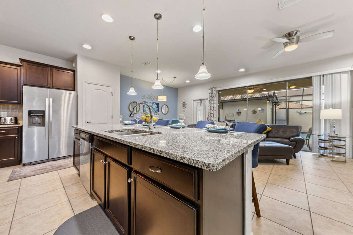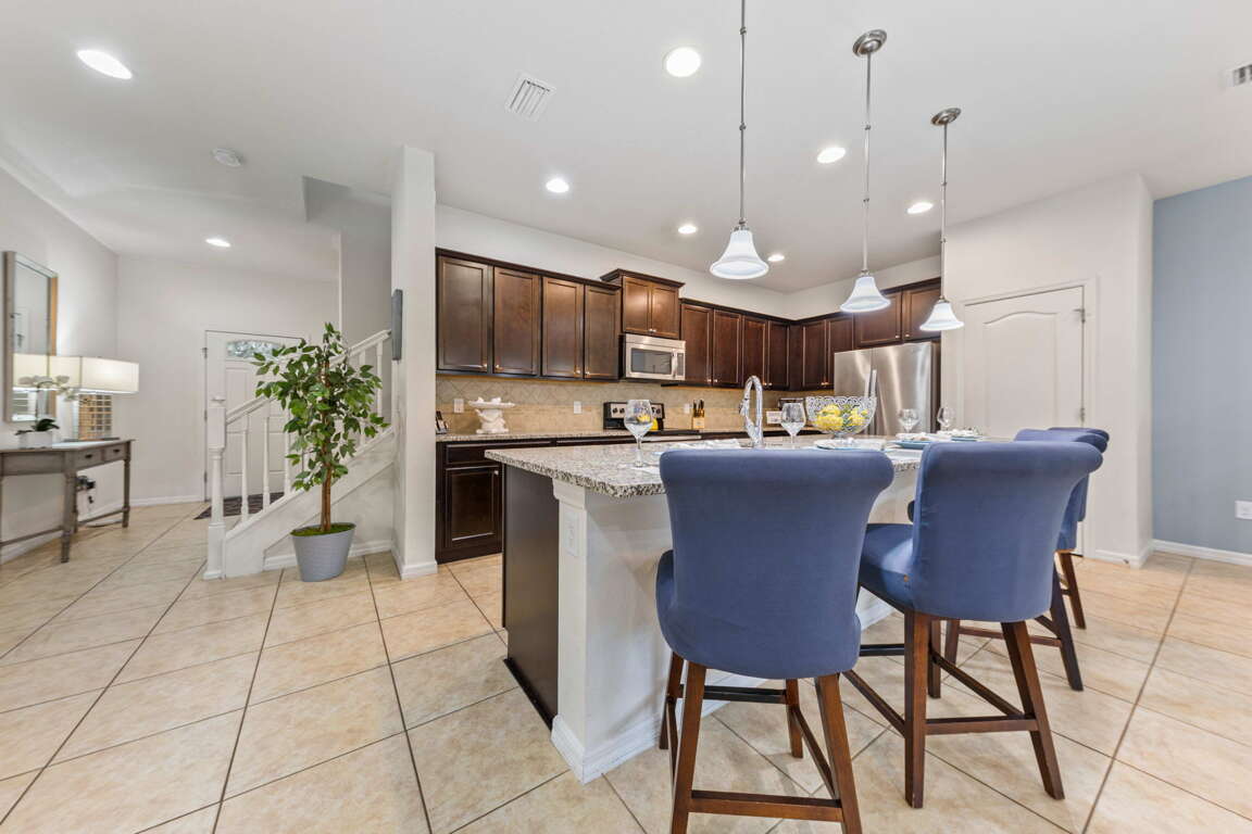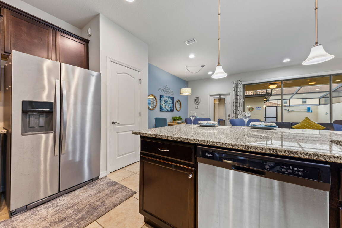 Step through the front door and into an open-concept living area filled with natural light. The kitchen features granite countertops, stainless-steel appliances, and a large island that doubles as a breakfast bar — perfect for morning coffee or evening conversation. The adjoining dining area and spacious family room flow seamlessly together, creating a welcoming environment for families and friends to gather after a long day of adventures.