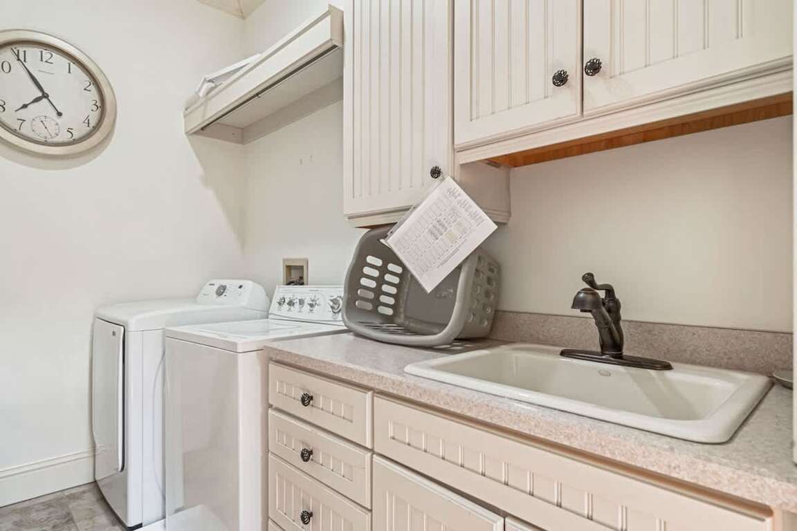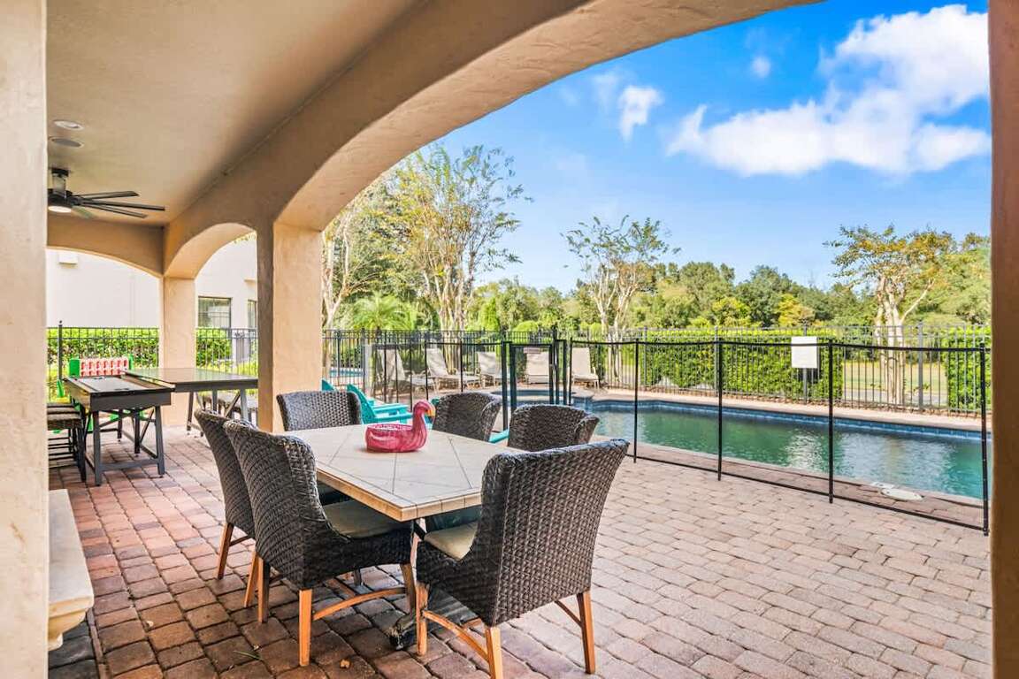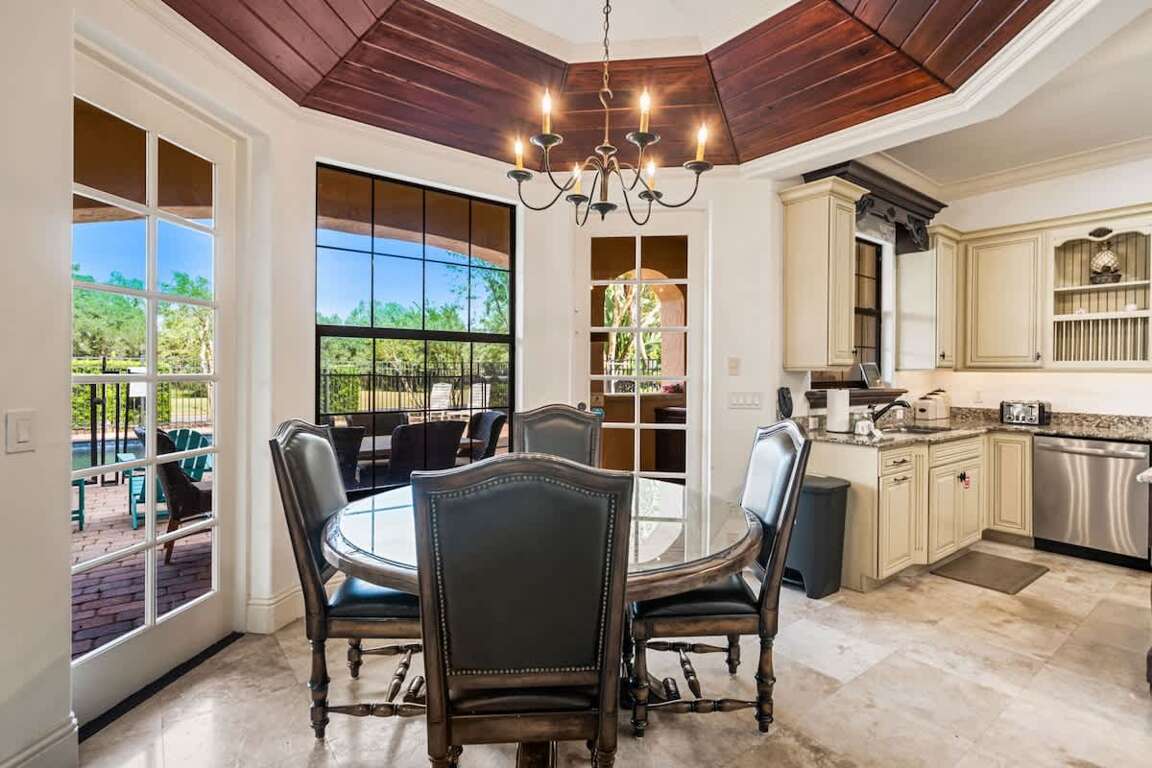 Step inside to find a bright and inviting open living area that brings everyone together. The spacious kitchen is fully equipped for family meals, from morning pancakes before the parks to cozy dinners shared around the large dining table. Floor-to-ceiling windows open out to your private patio and pool, where the kids can splash while adults unwind under the Florida sun, all framed by peaceful golf course views.