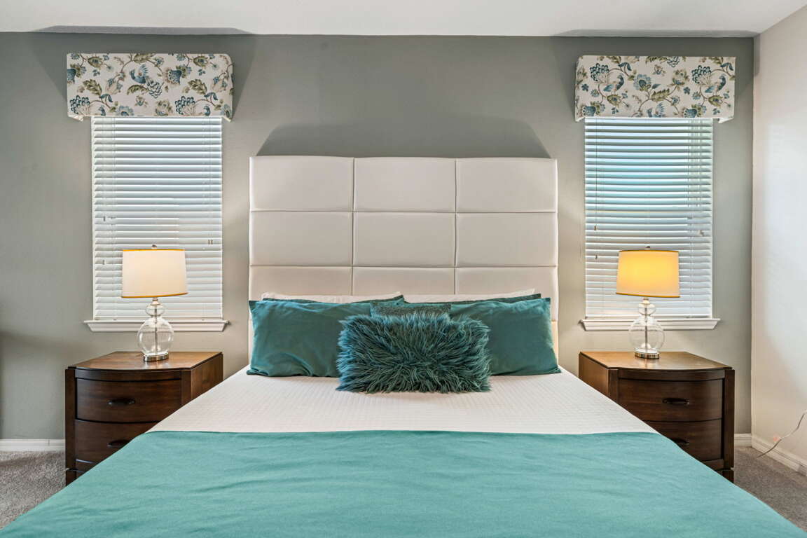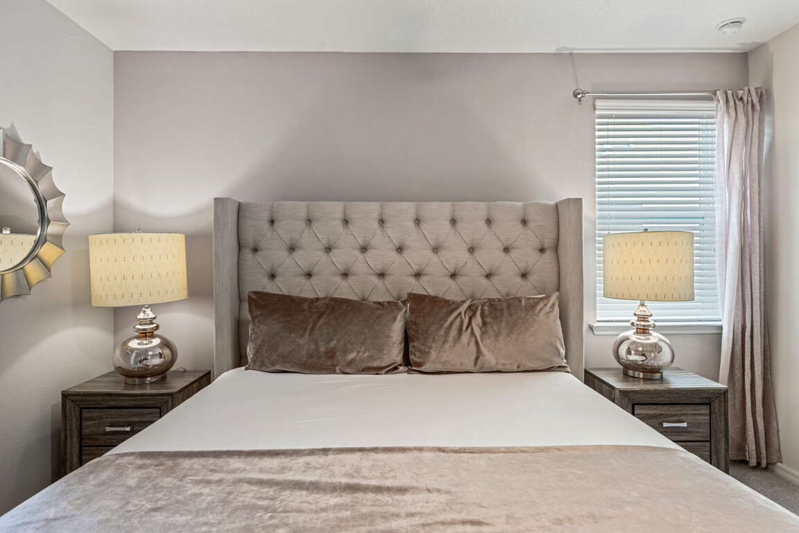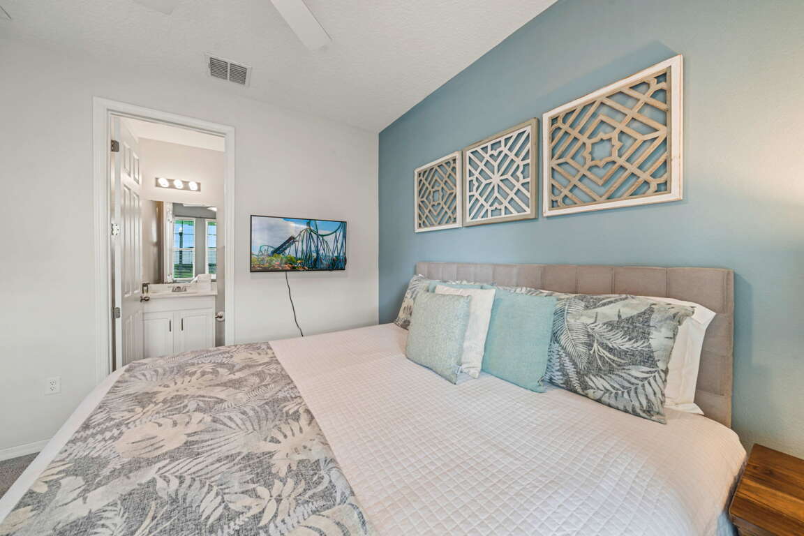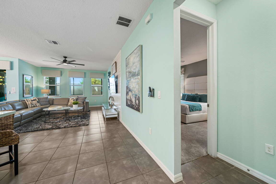 The main living space is bright, open, and inviting, making it easy for everyone to gather after long park days or relaxed resort mornings. The kitchen and dining areas flow seamlessly into the living room, creating a central hub for meals, games, and late-night conversations while keeping the group connected.